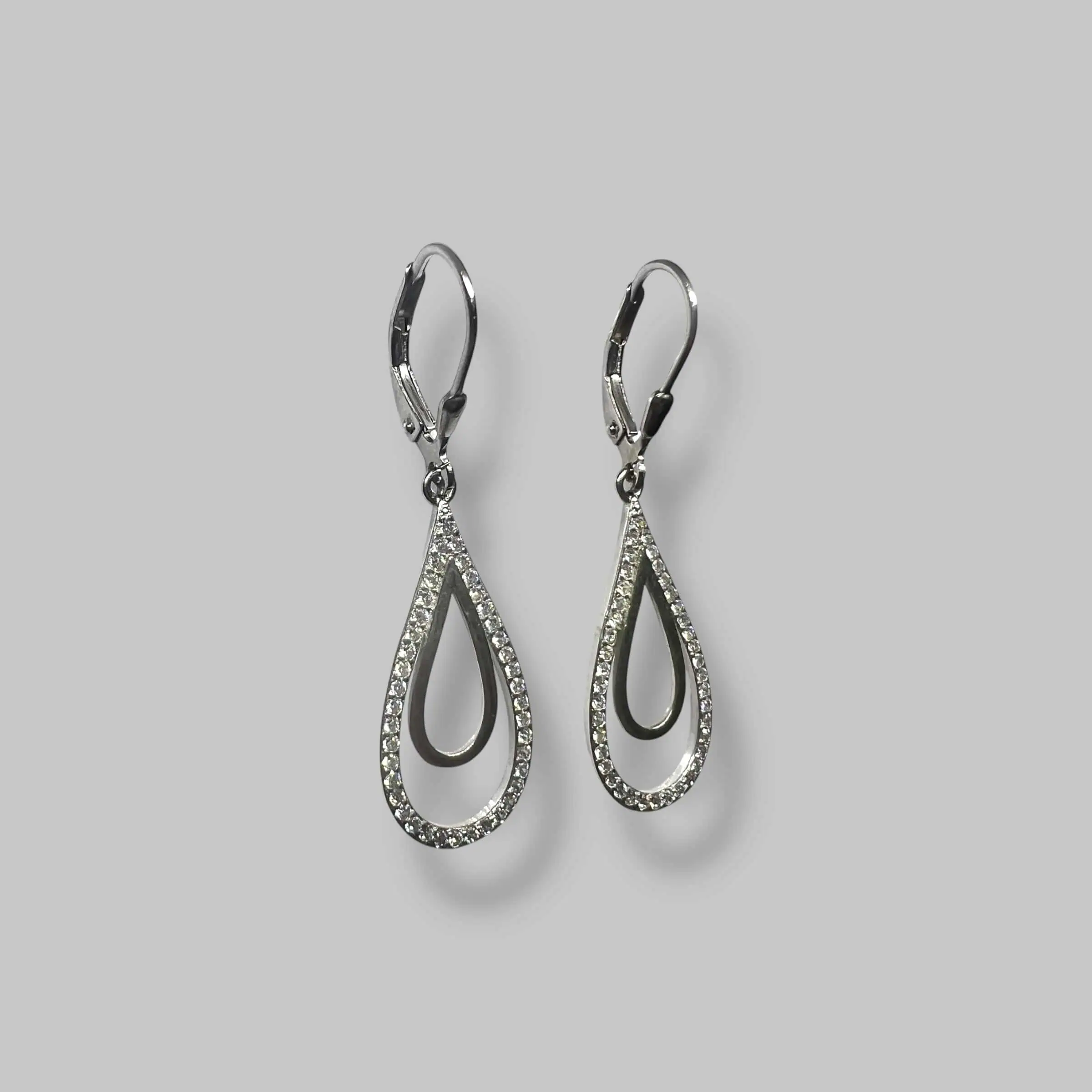 Вишукані сережки-підвіски у формі крапель зі срібла. Подвійний контур, оздоблений дрібними цирконами, створює ефект легкості та додає вашому вечірньому образу особливого сяйва.