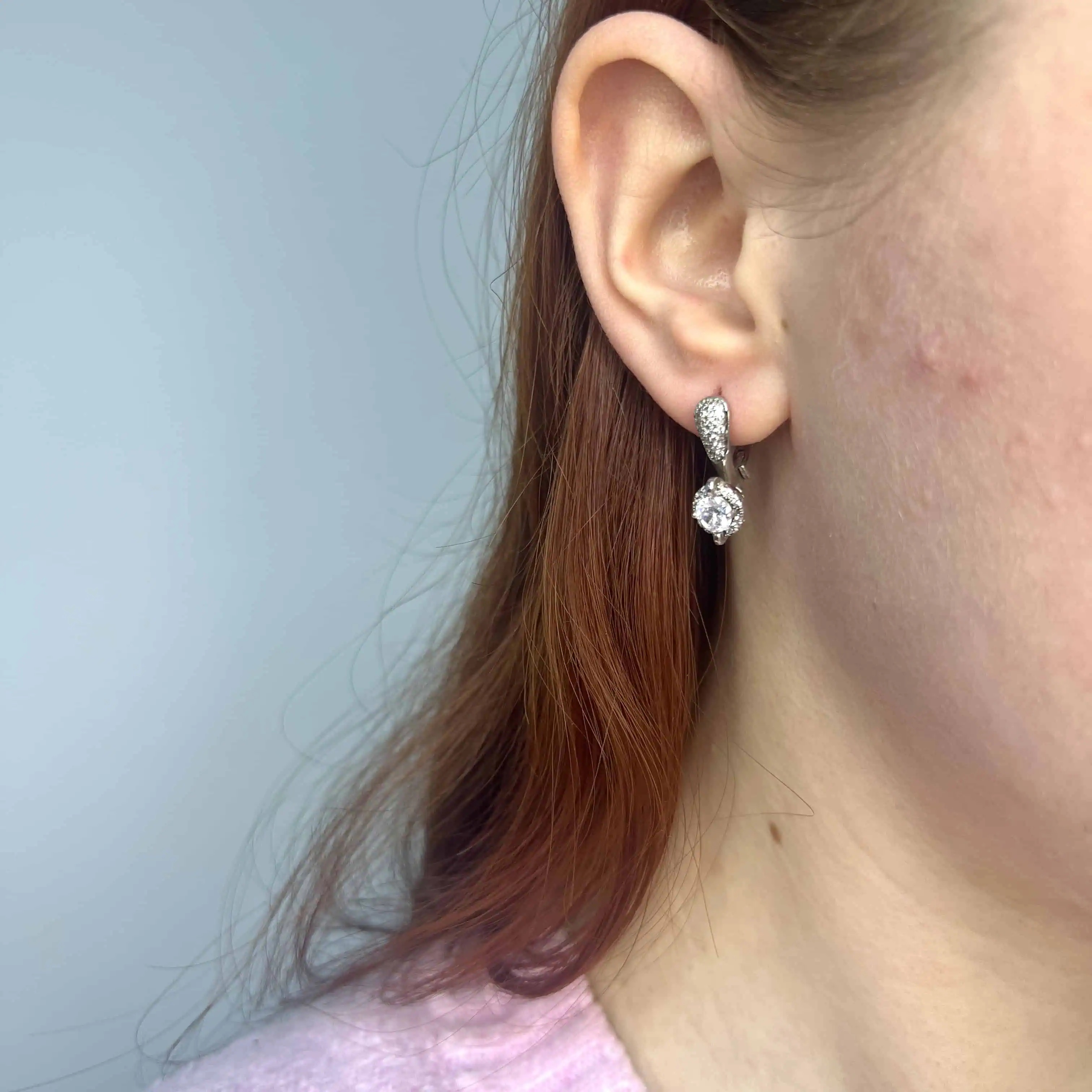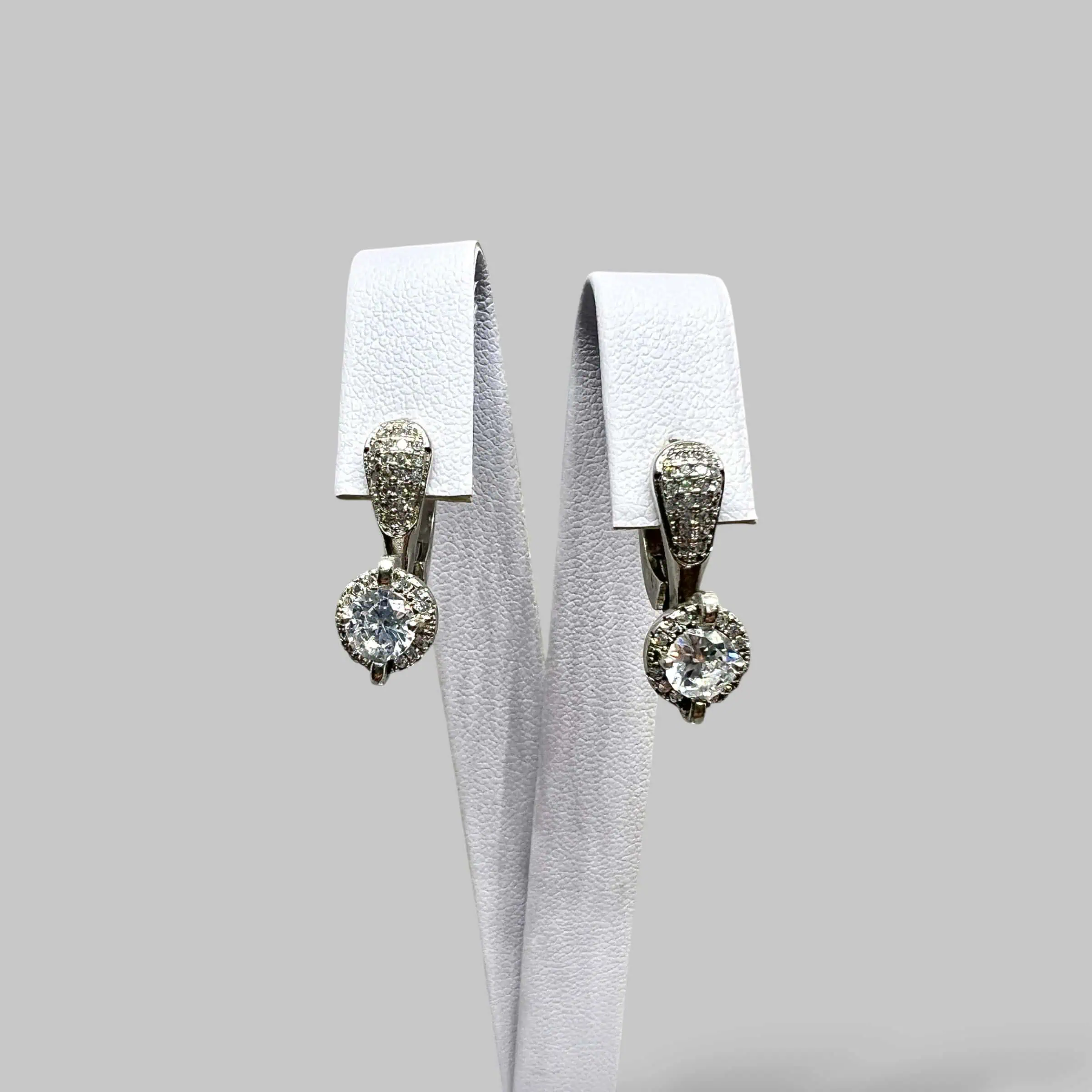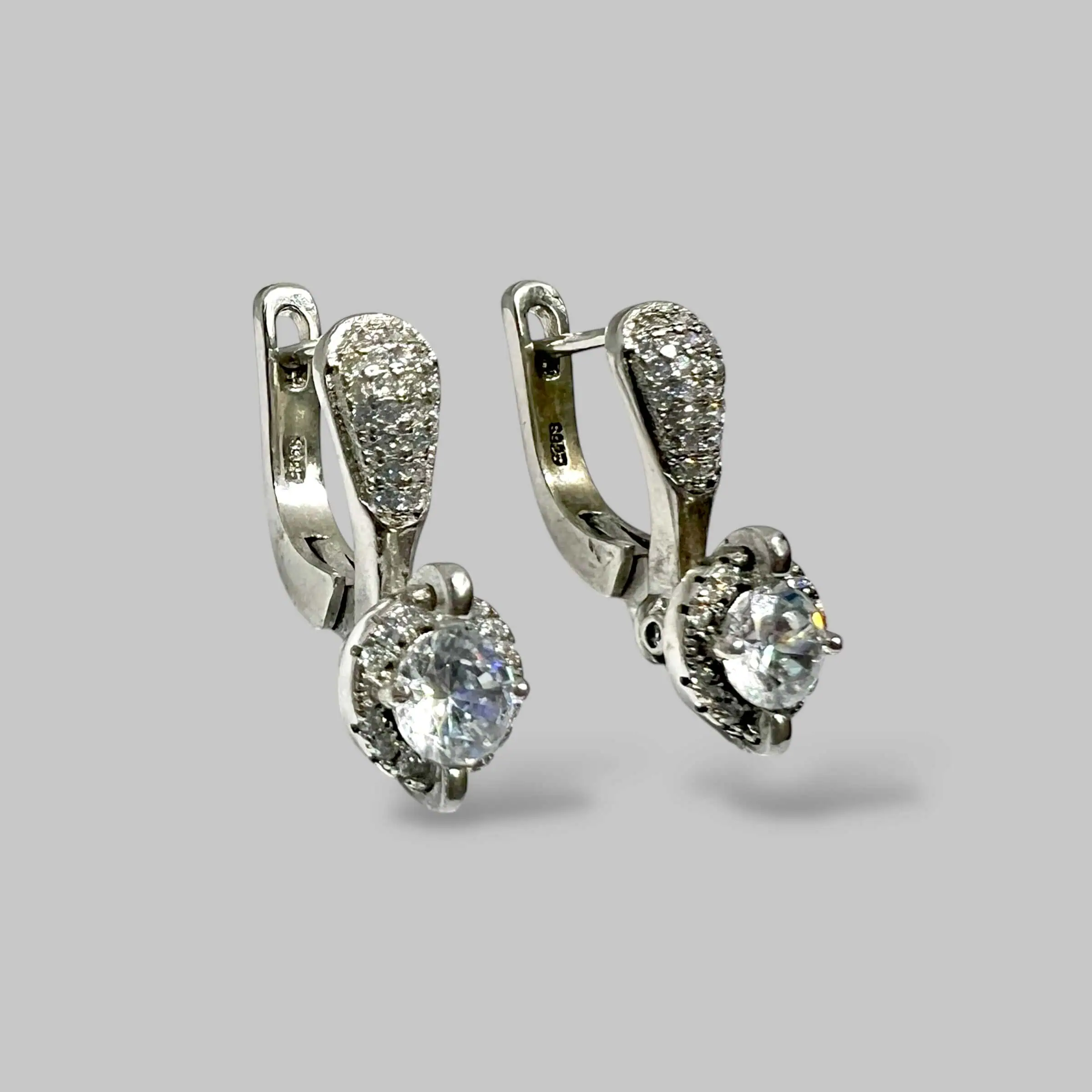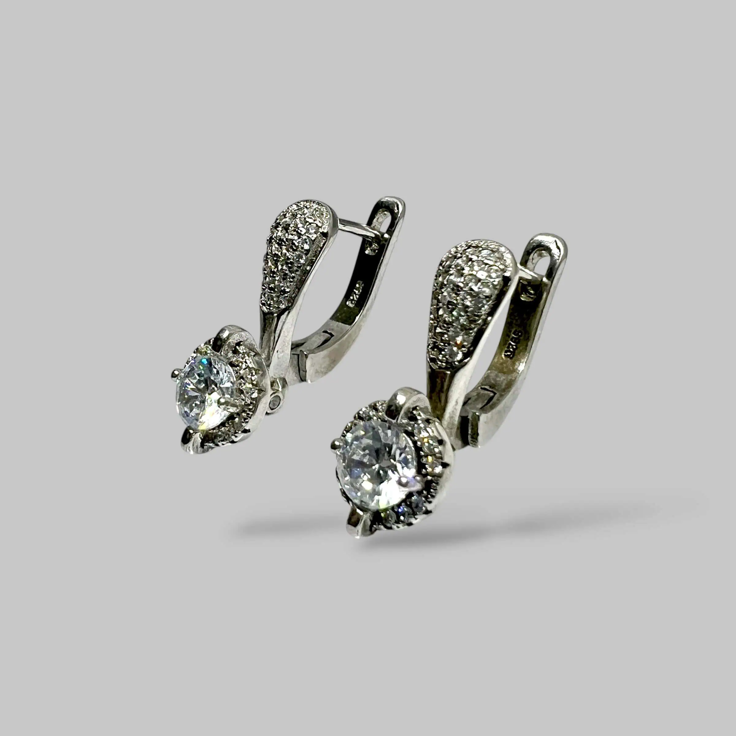 Вишукана модель 925 проби з англійською застібкою. Променистий центральний камінь у поєднанні з іскристою доріжкою дрібних кристалів створює ефект нескінченного сяйва та елегантності.
