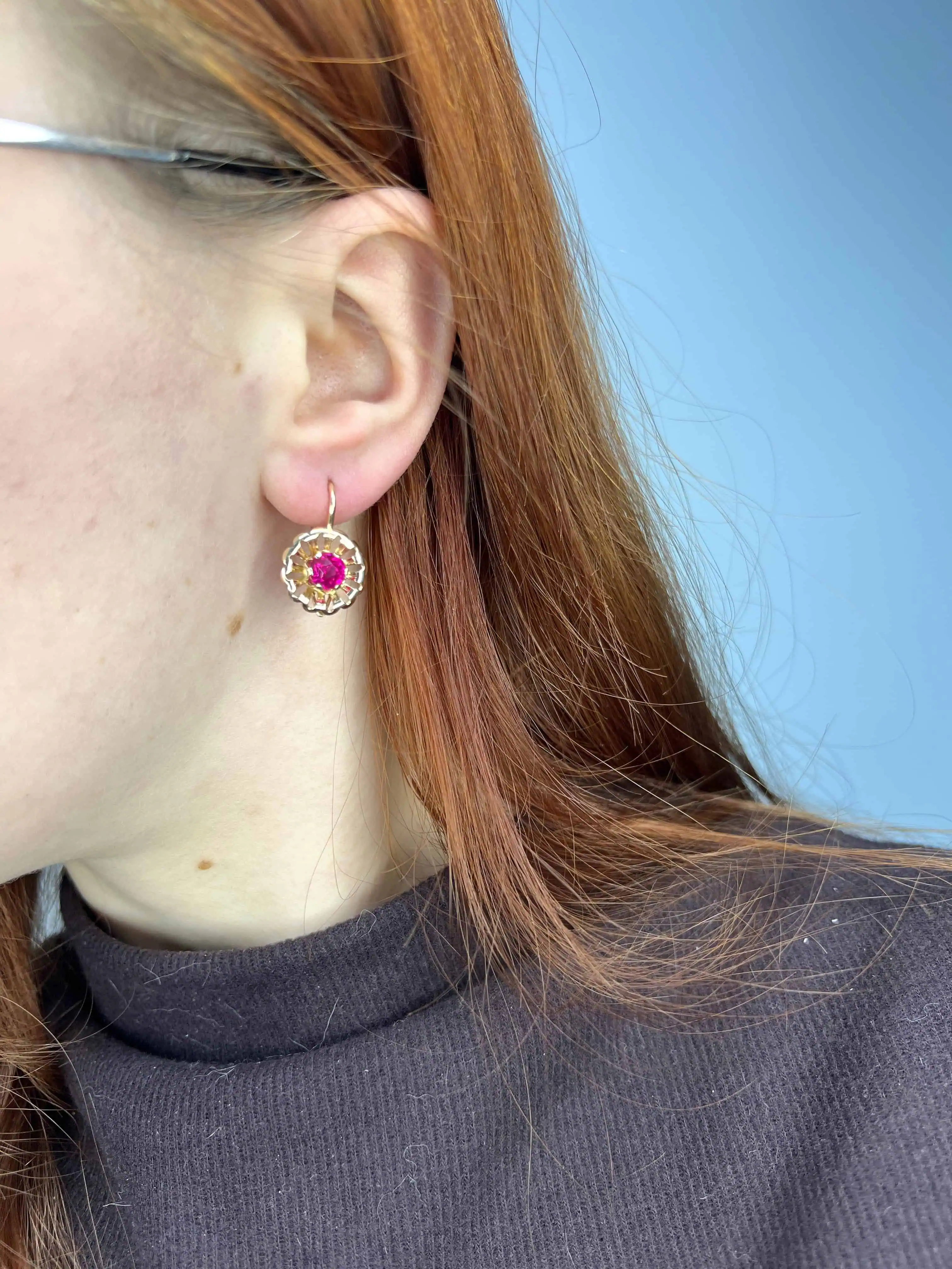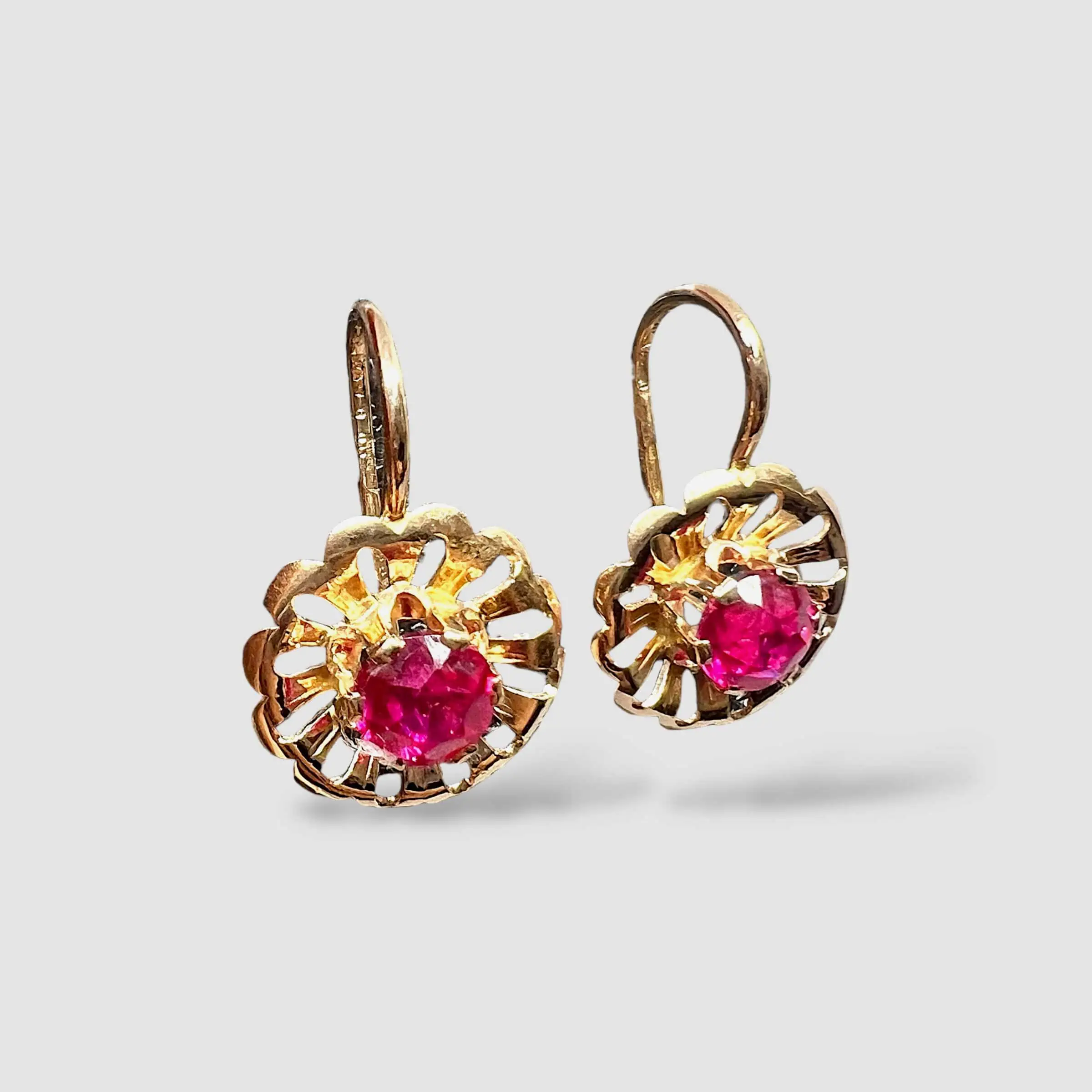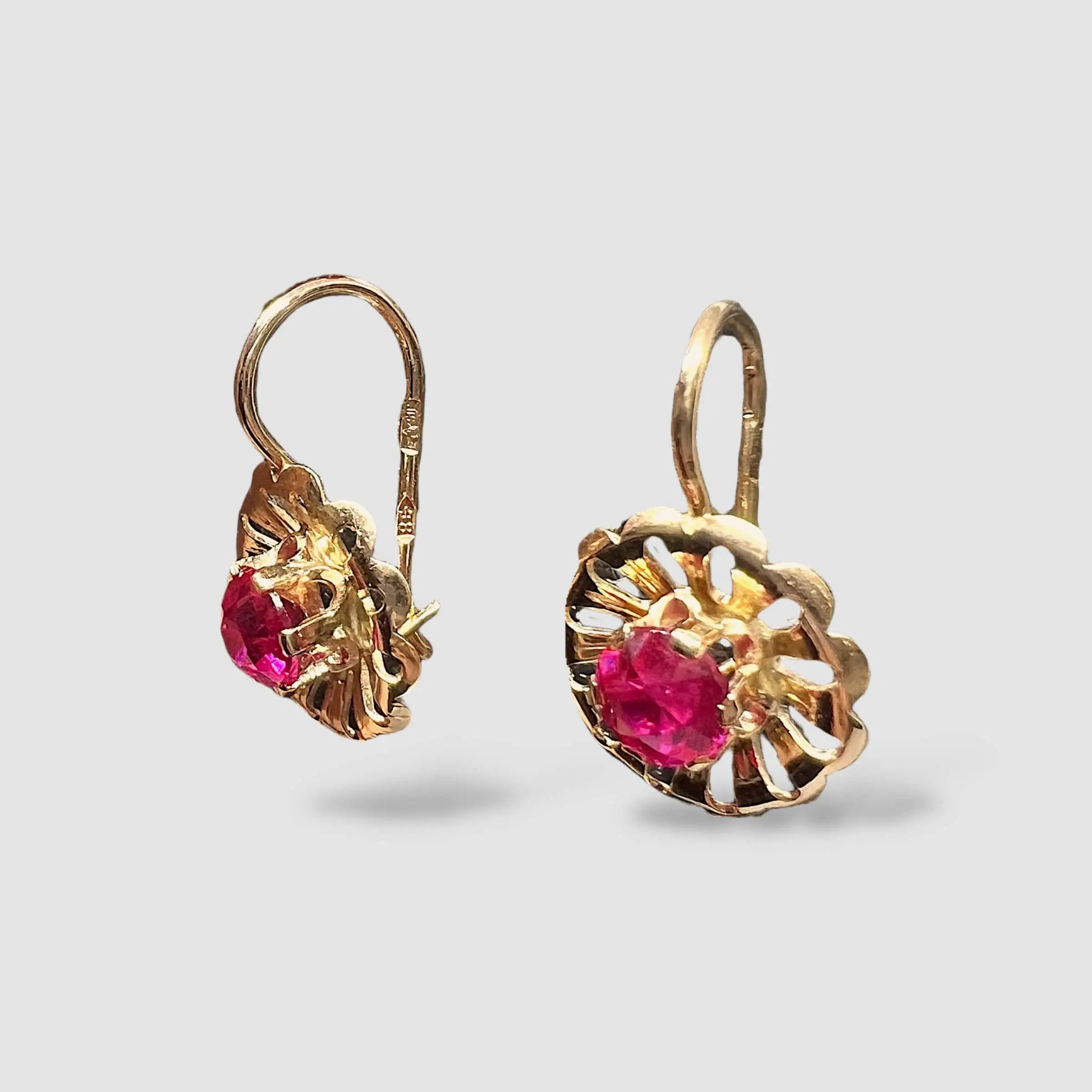 Класичні золоті сережки, виконані у формі витончених квітів або ажурних кошиків. Золоті пелюстки з прорізами створюють легкий, повітряний об'єм навколо каменя, дозволяючи світлу грати на його гранях.