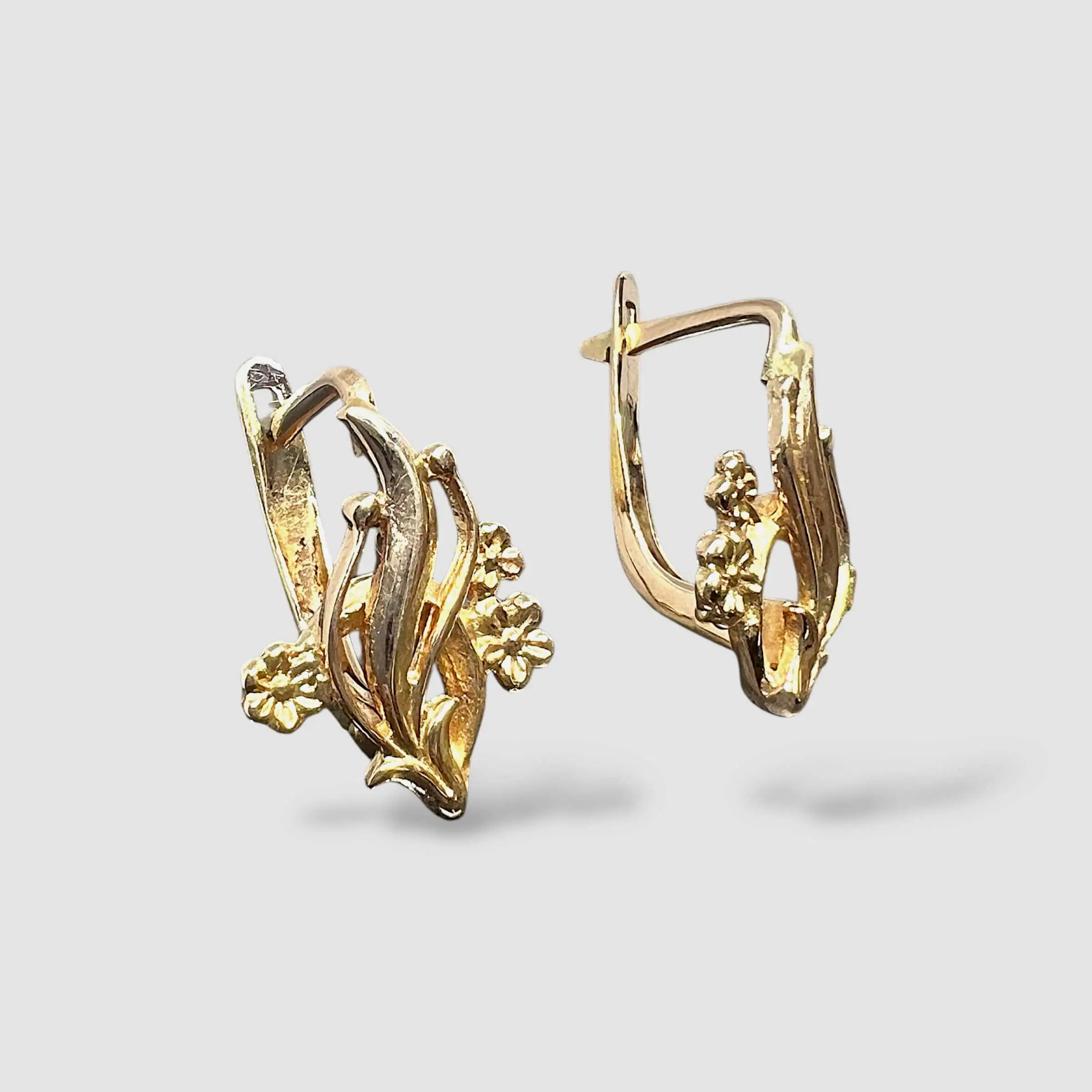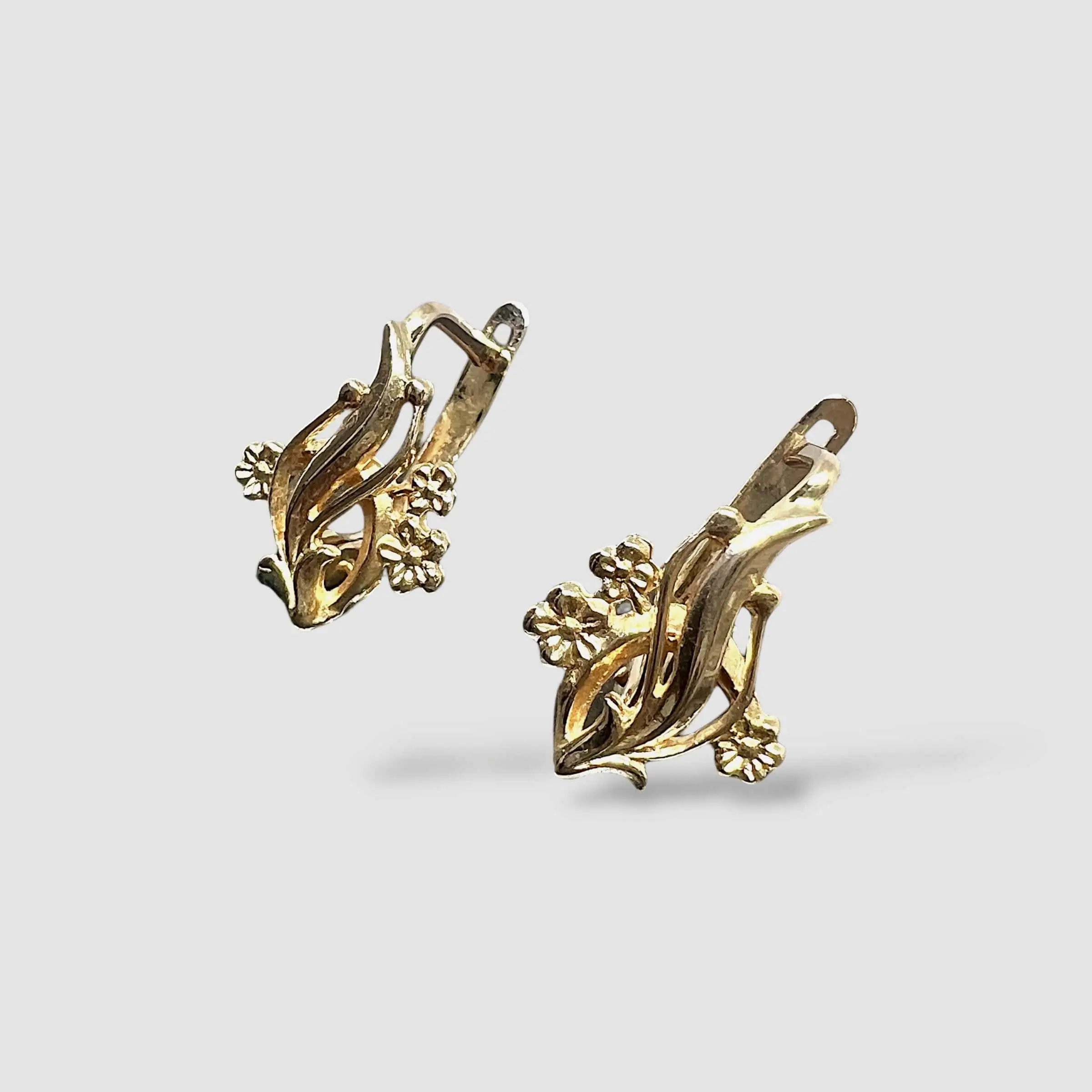 Елегантні золоті сережки, дизайн яких натхненний рослинними силуетами. Виріб складається з плавно вигнутих ліній, що нагадують пелюстки або листя, та прикрашений мініатюрними золотими квітами.