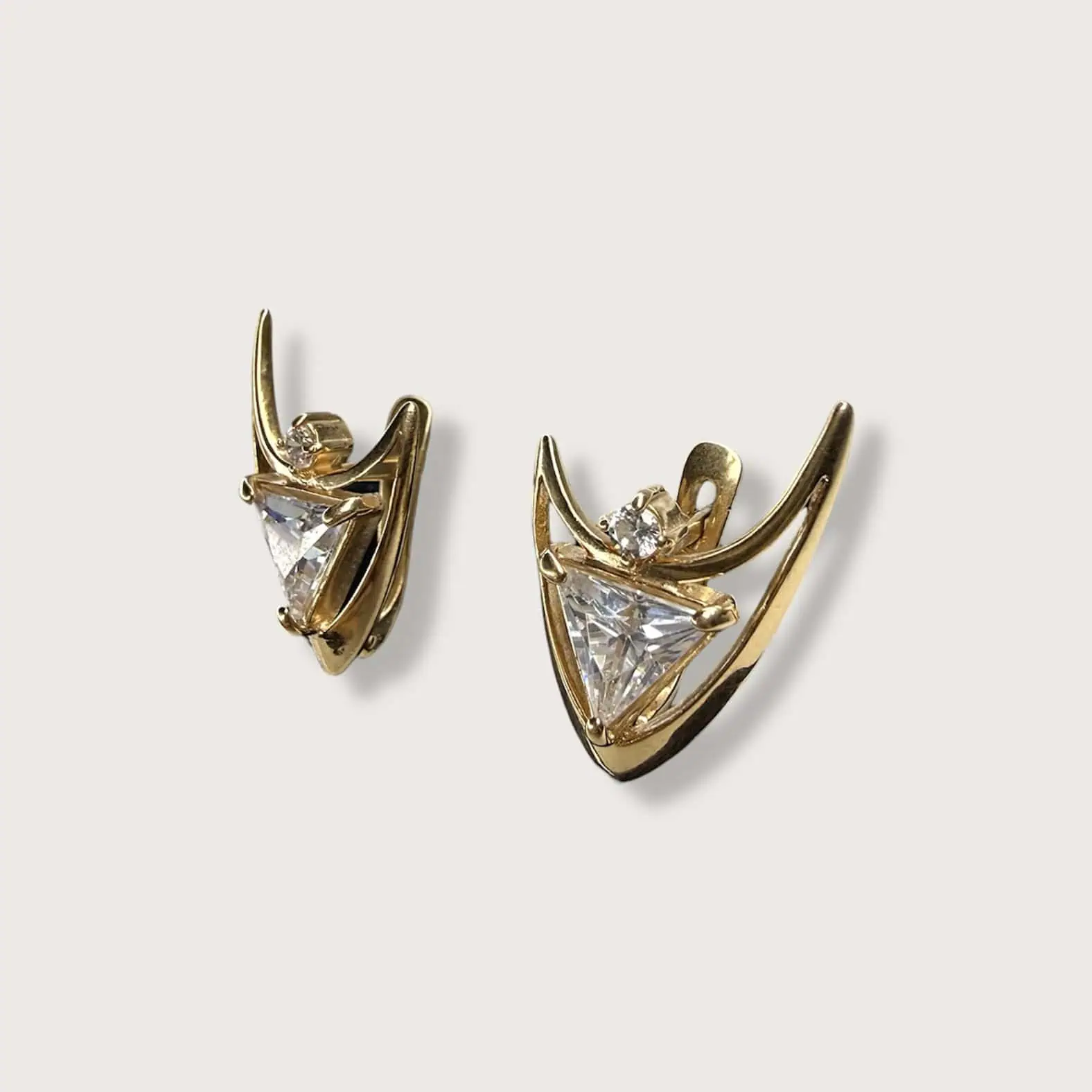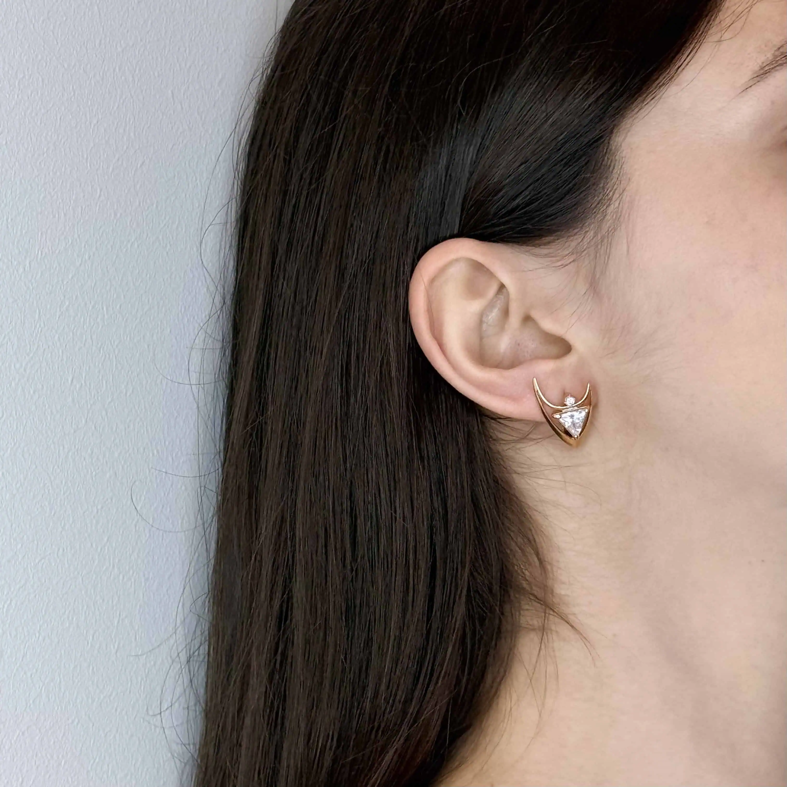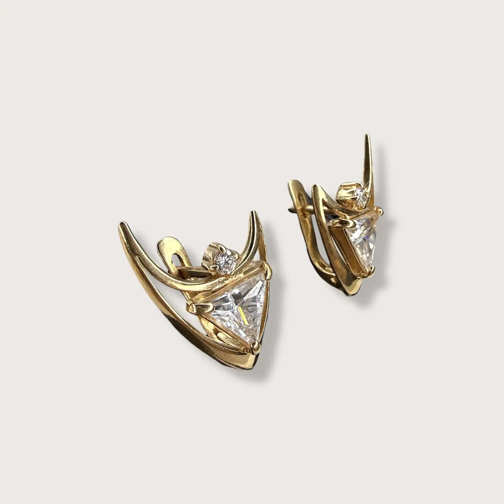 Золоті сережки з чіткими лініями та трикутним каменем створюють відчуття руху. Прикраса, що має власну траєкторію.