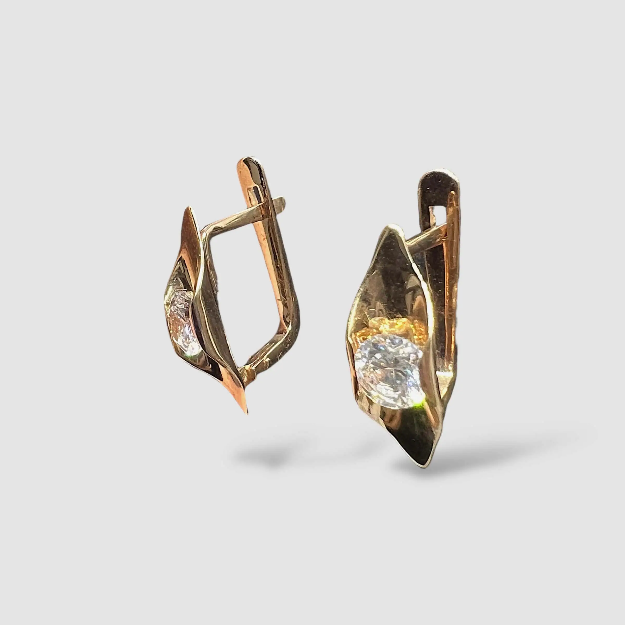 Витончені золоті сережки, що поєднують у собі мінімалізм та класичне сяйво. Основа виробу має плавну, злегка вигнуту форму з гладкою дзеркальною поверхнею, яка фокусує увагу на центральному камені.