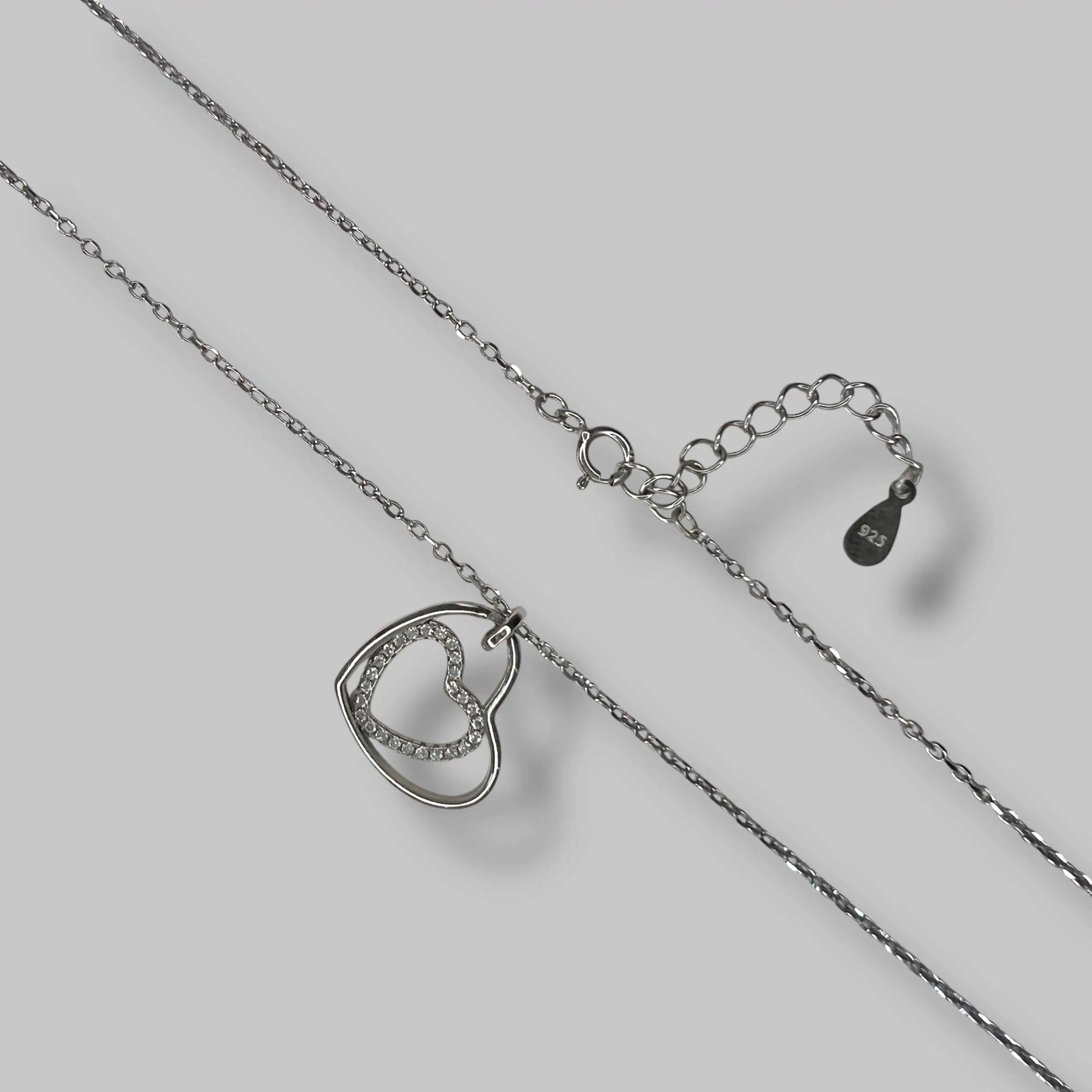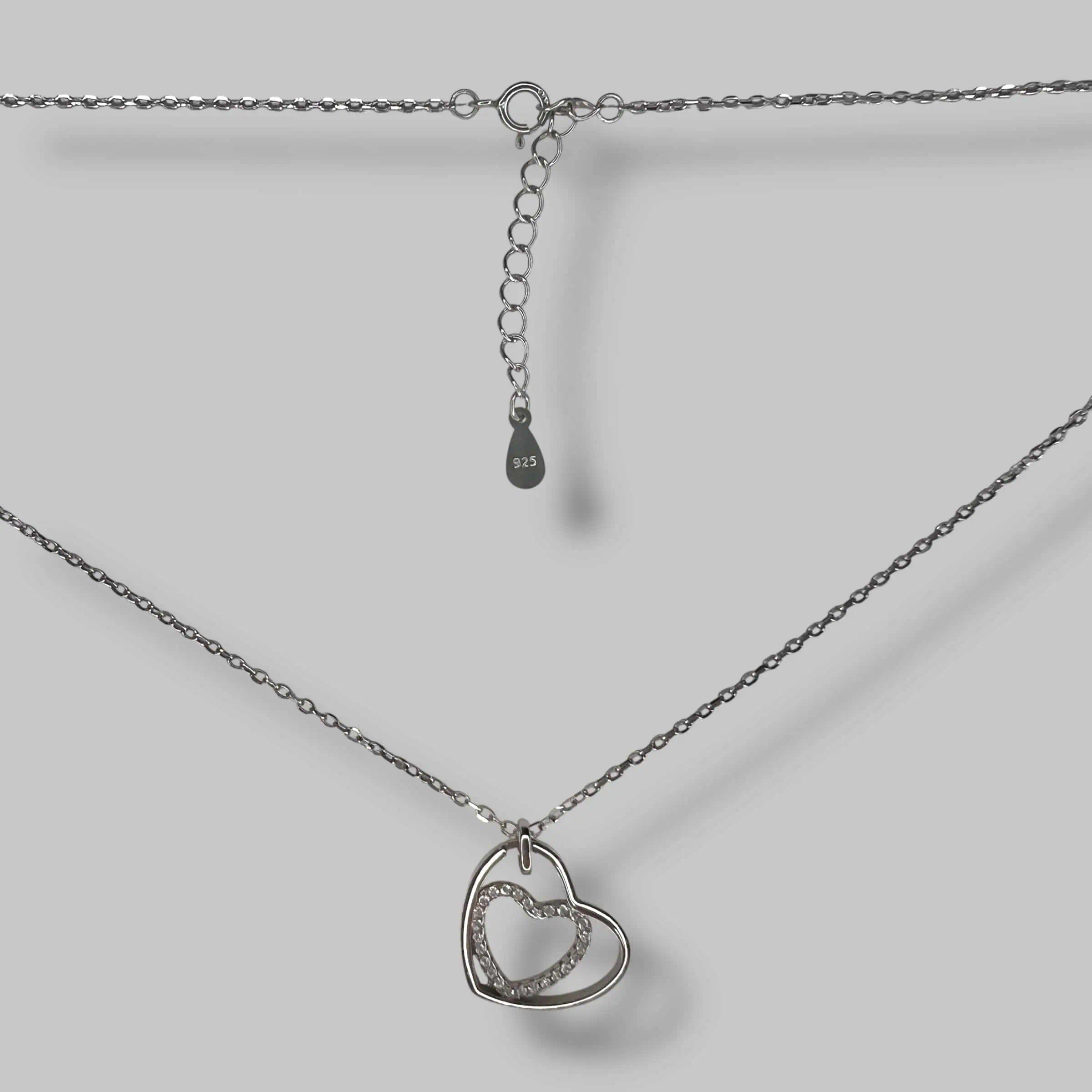 Дизайн виробу базується на стильному контрасті: велике зовнішнє серце має гладку дзеркальну поверхню, а внутрішнє — щільно інкрустоване дрібними білими цирконами.
