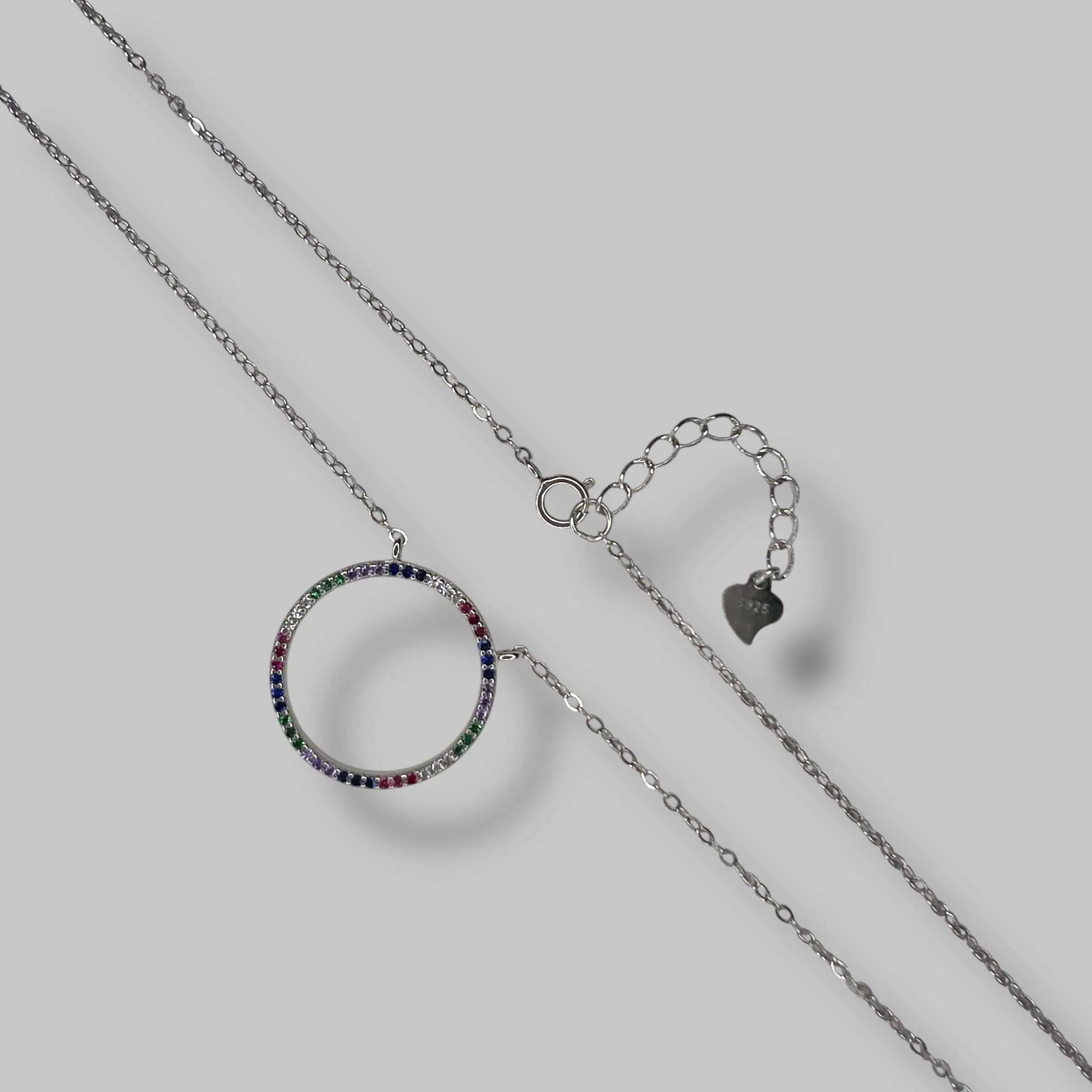 Дизайн моделі привертає увагу плавним переходом відтінків — від глибокого синього та смарагдового до соковитого малинового та ніжного фіолетового. Камені щільно закріплені по всьому периметру кола.