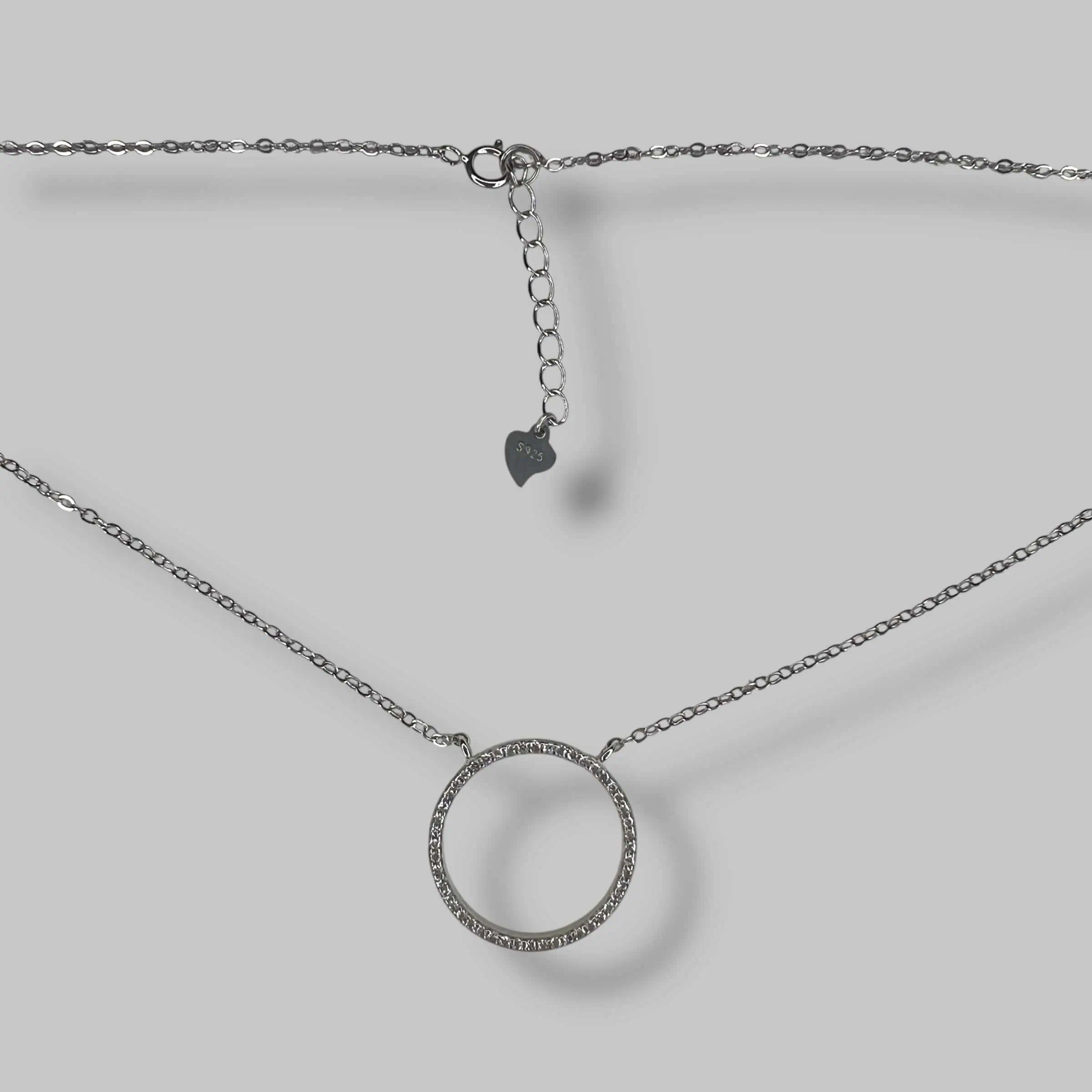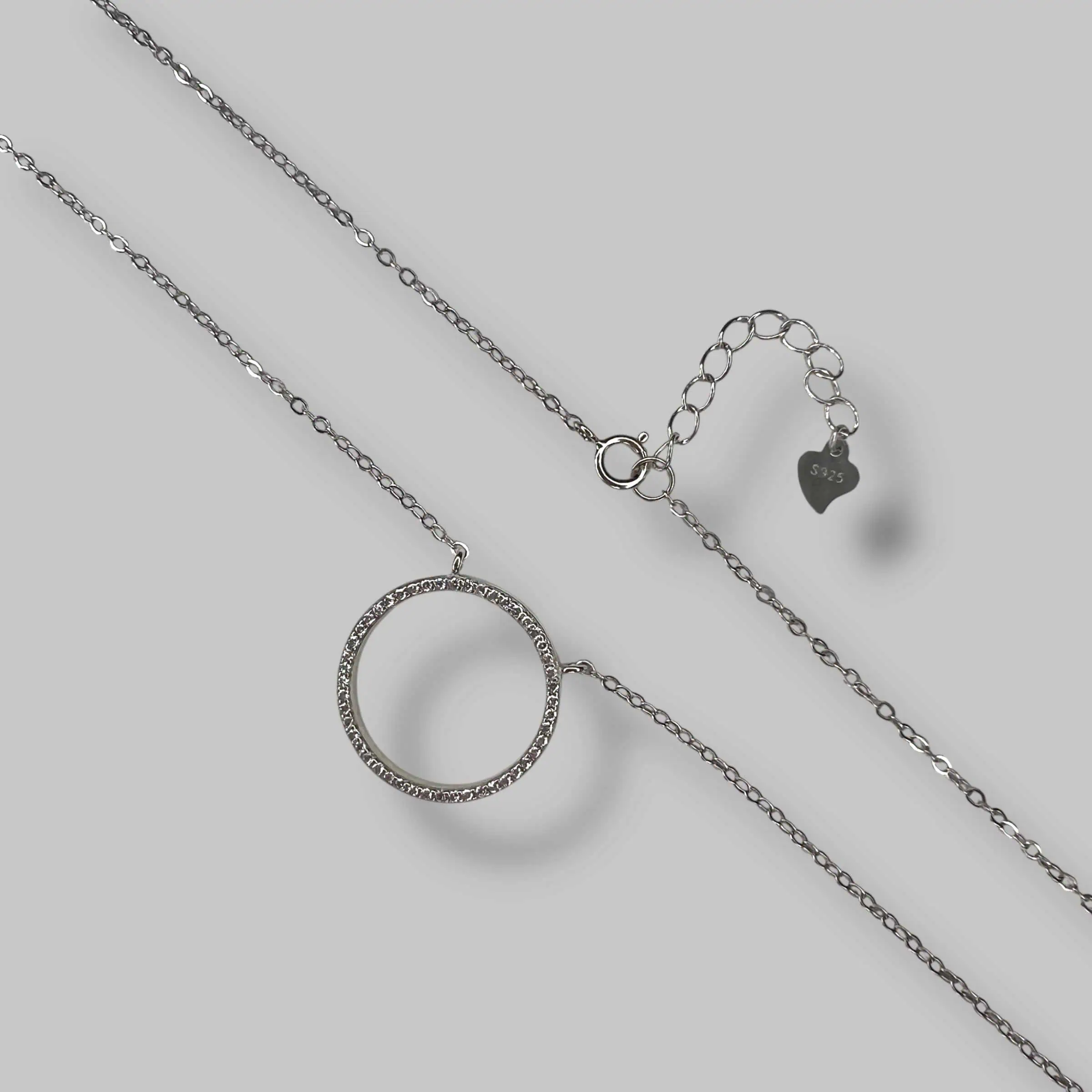 Тонкий контур кулона повністю інкрустований дрібними білими цирконами, що створюють ефект безперервної лінії сяйва. Ажурний дизайн робить прикрасу візуально легкою, дозволяючи їй гармонійно виглядати на тілі.