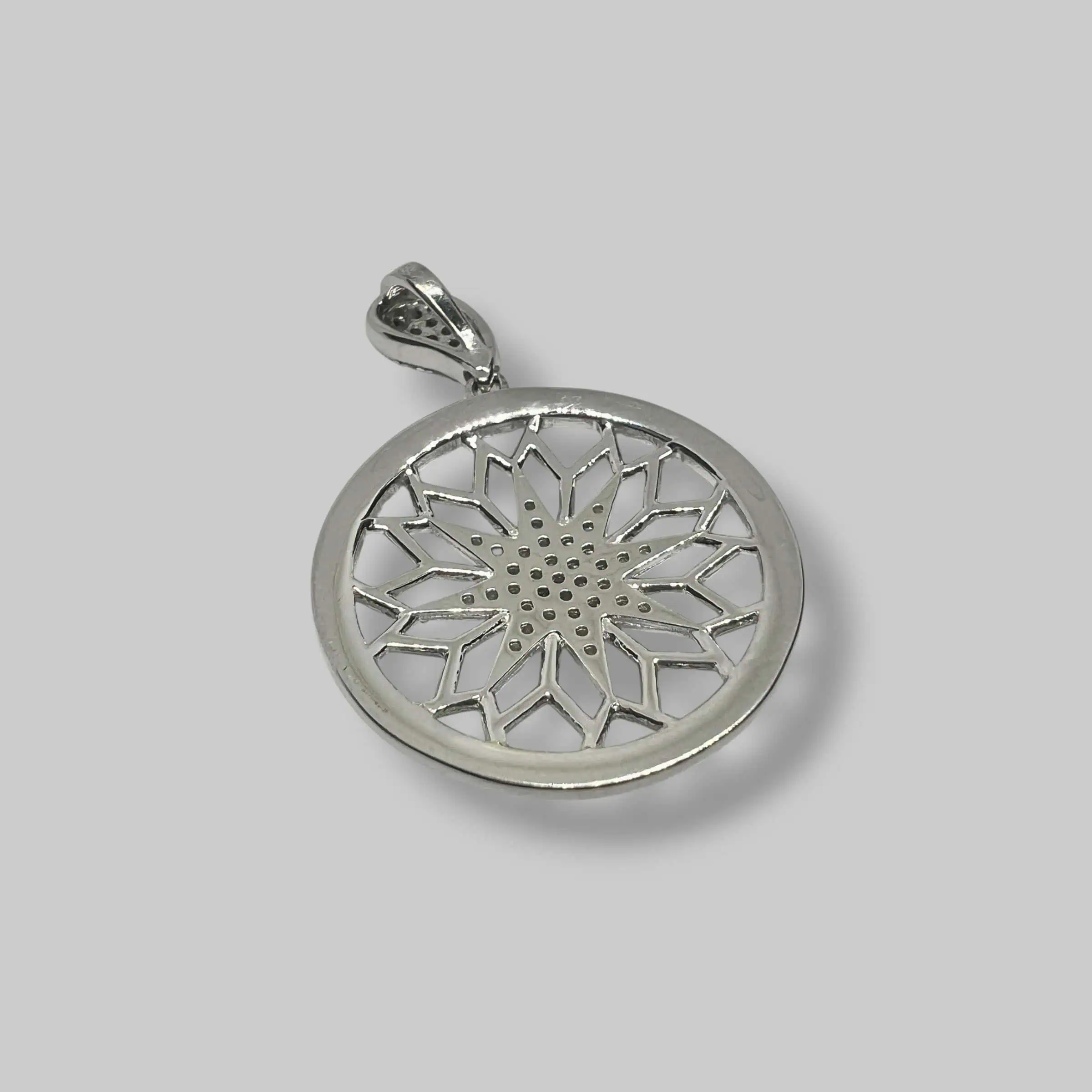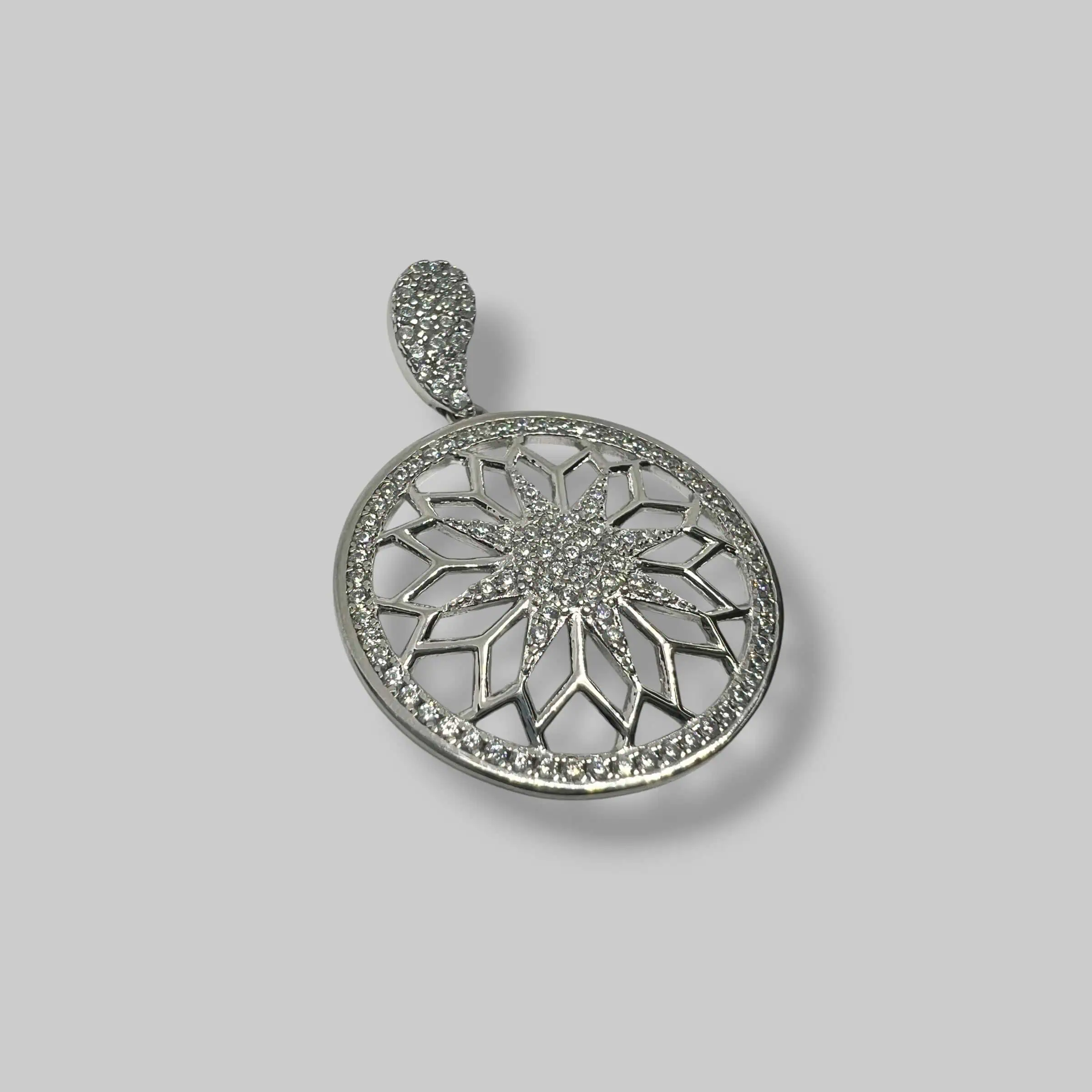 Тендітне переплетення срібних ліній у формі зірки, обрамленої сяючим колом. Дрібні циркони створюють ефект діамантового розсипу, наповнюючи образ магічним мерехтінням.