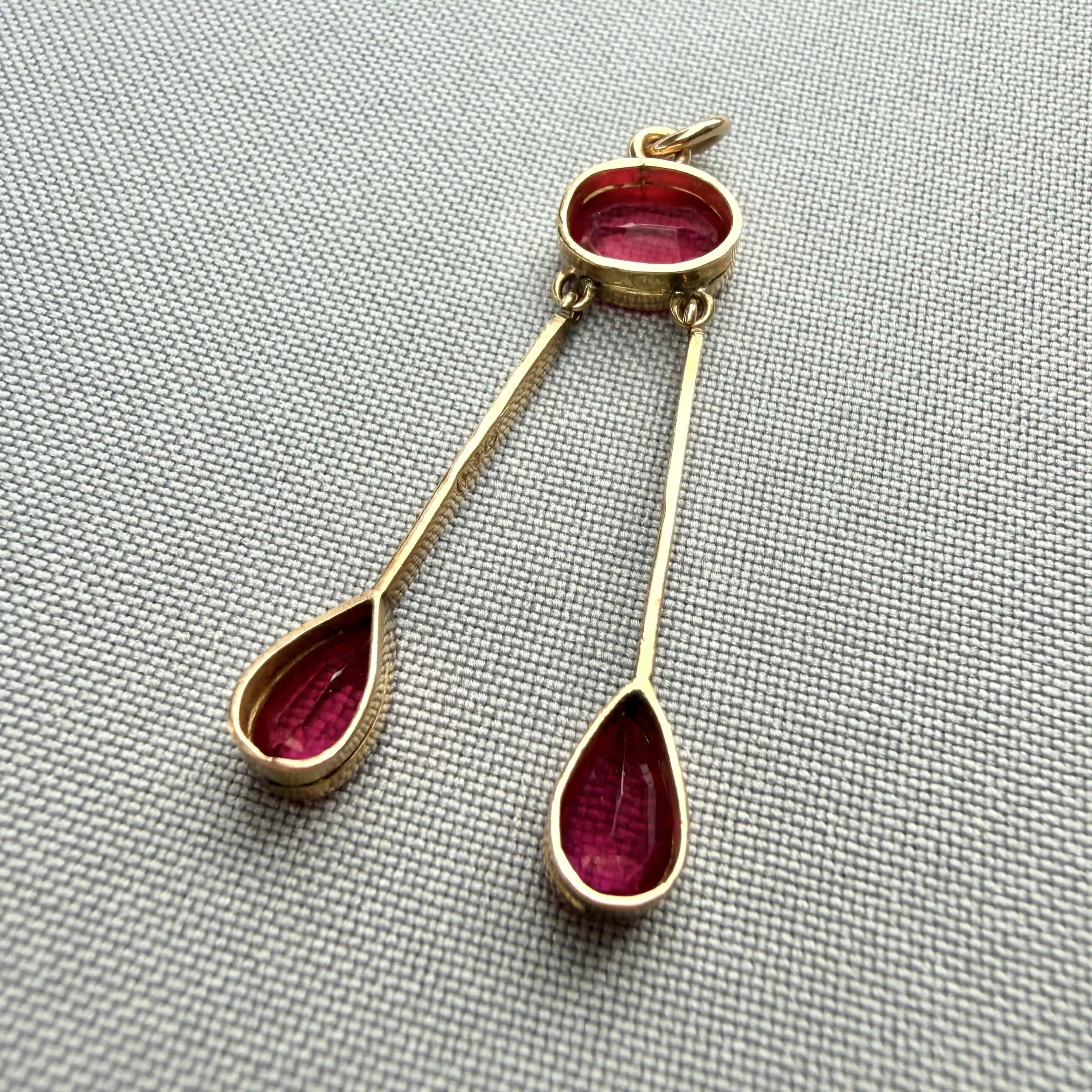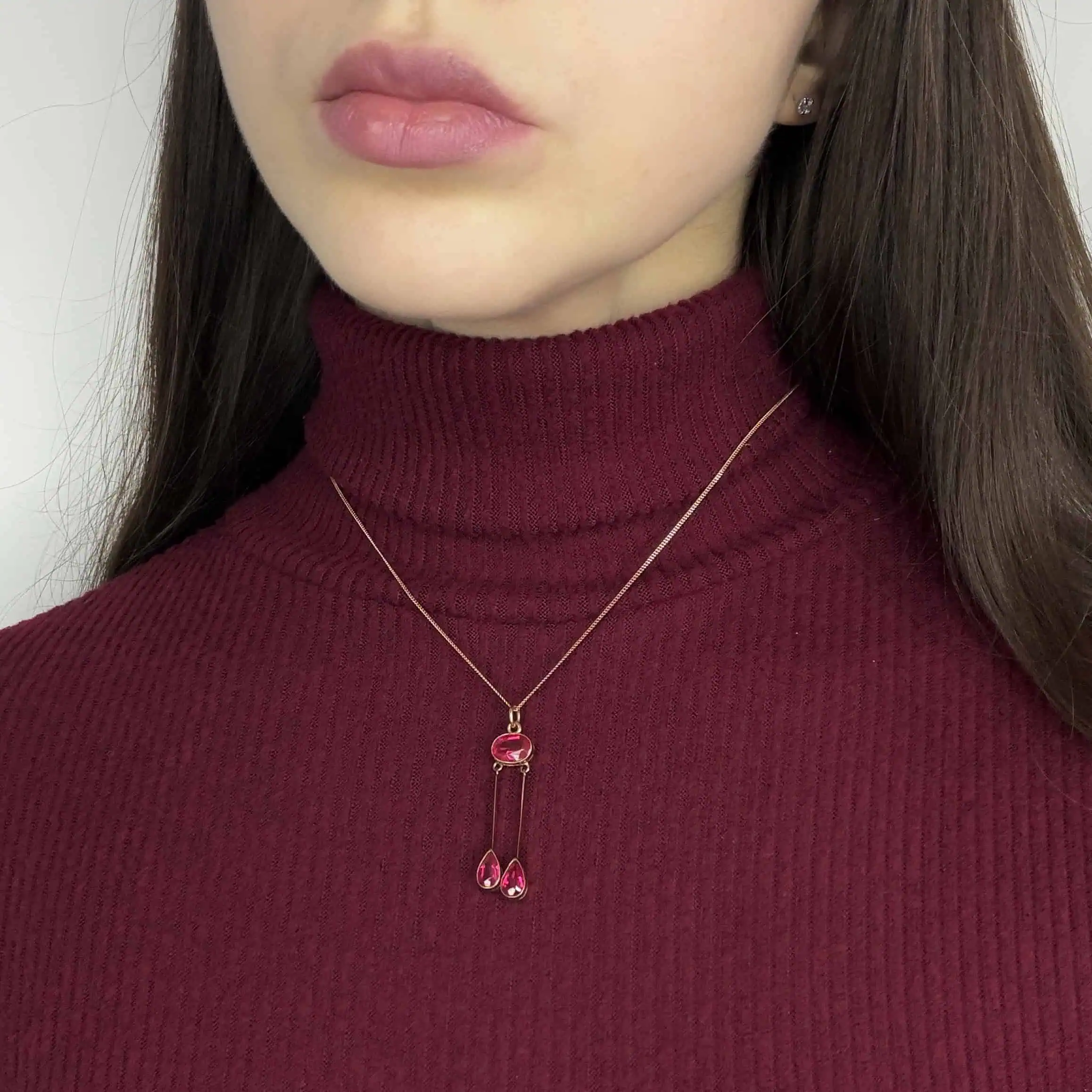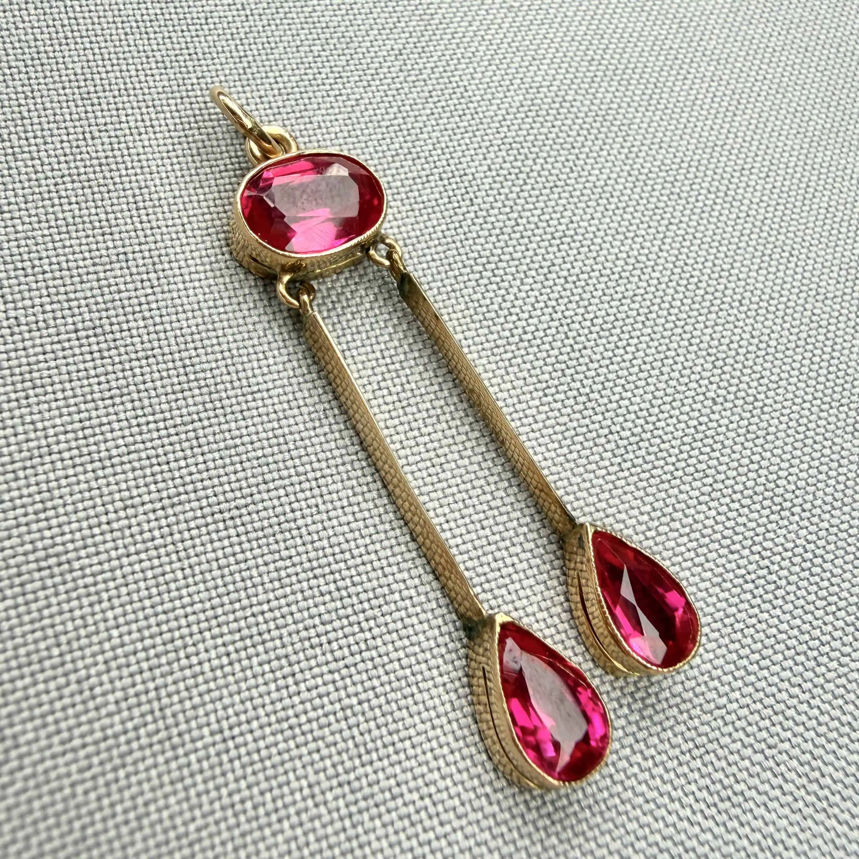 Золотий підвіс " Малинові Сльози" з яскраво-рожевими корундами і рохомими підвісами. Немає чіткої проби, проба визначена шляхом кислотного апробування.