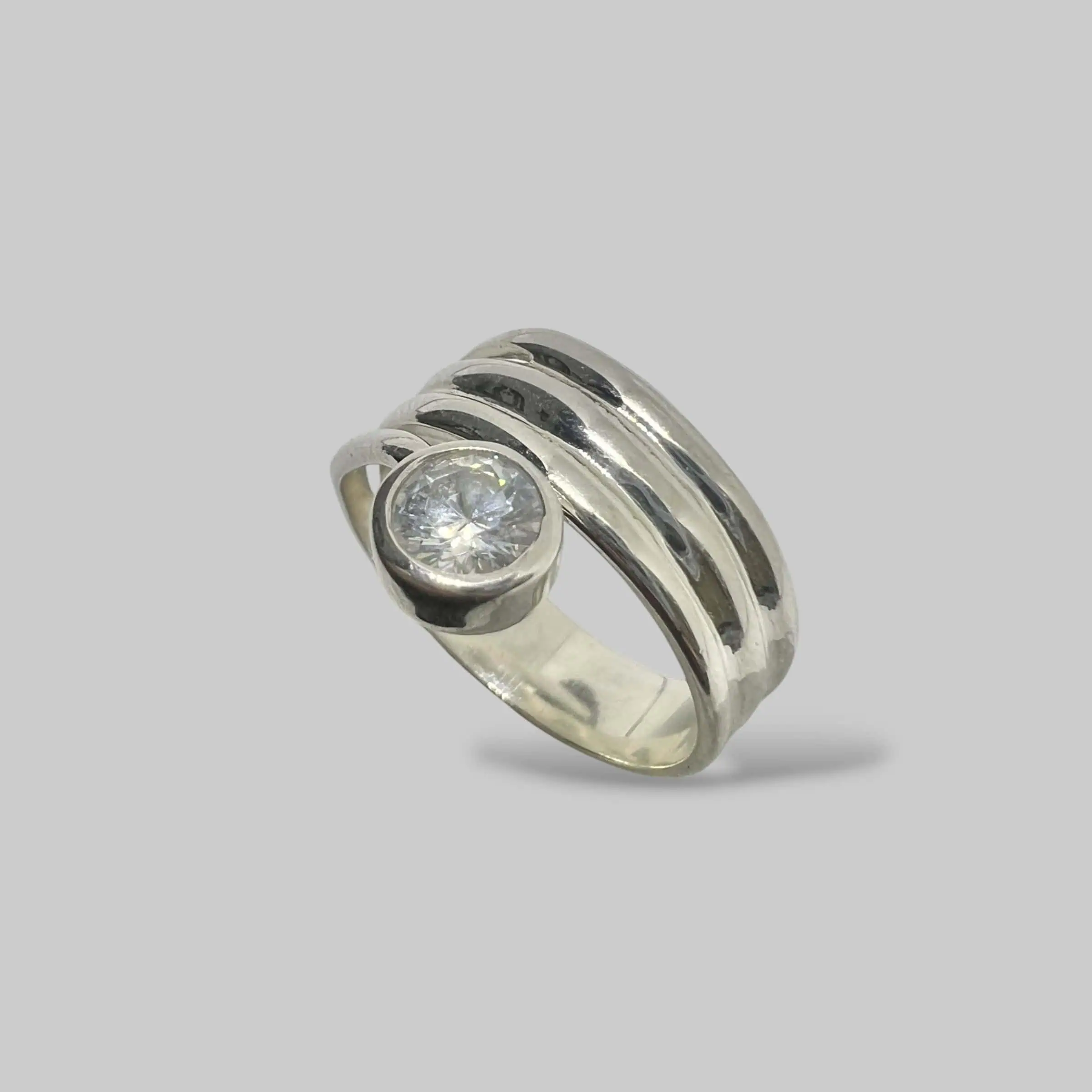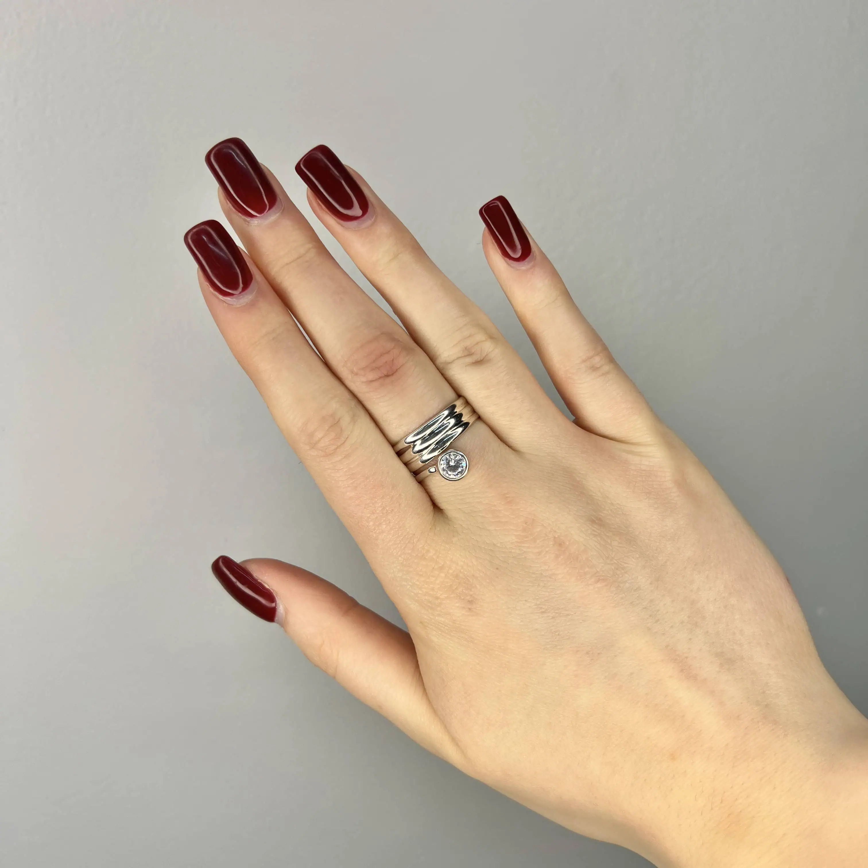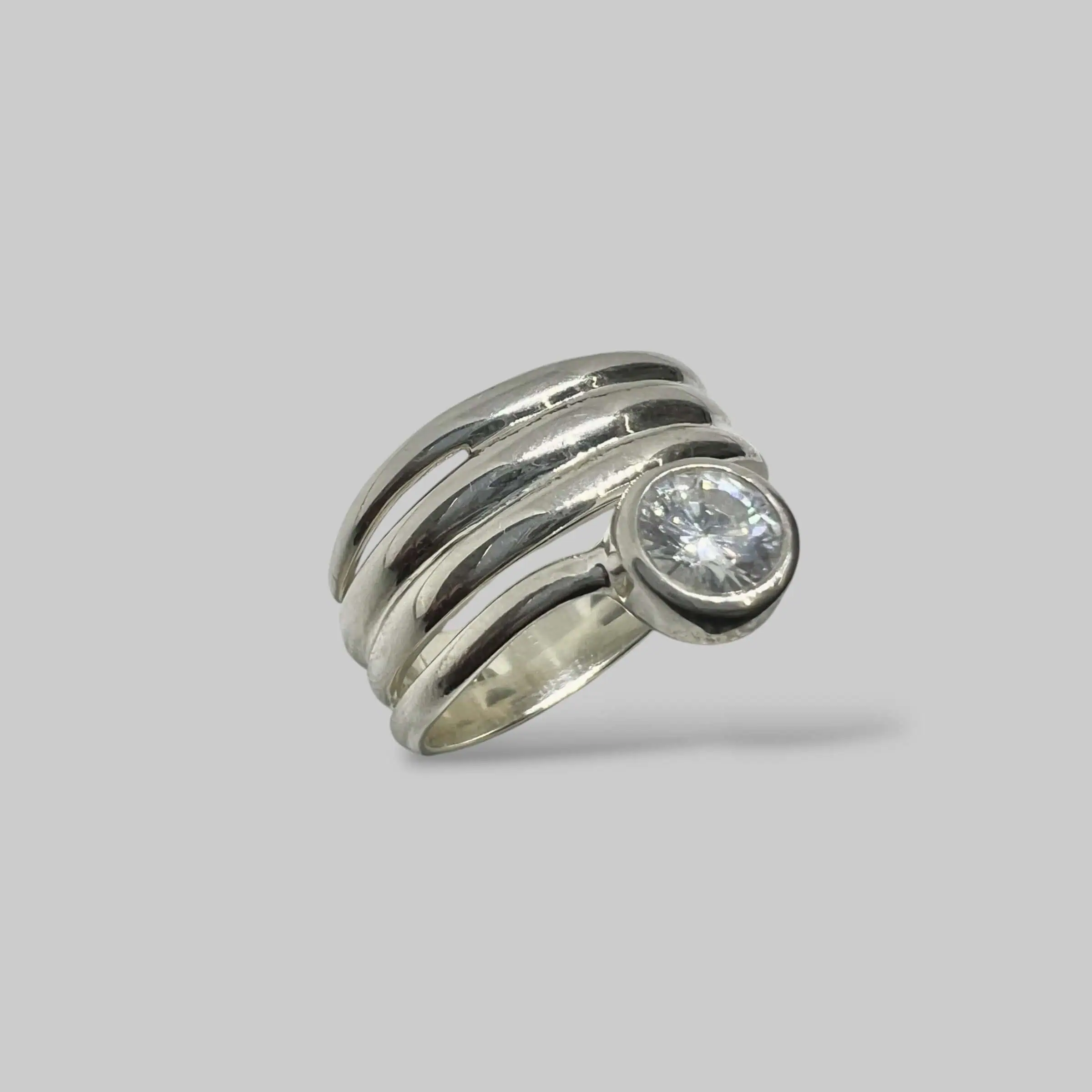 Ювелірна композиція з трьох срібних смуг, що звучать в унісон. Центральний циркон у глухій оправі виглядає дуже стильно та надійно, що робить цю каблучку ідеальним варіантом для щоденного носіння.