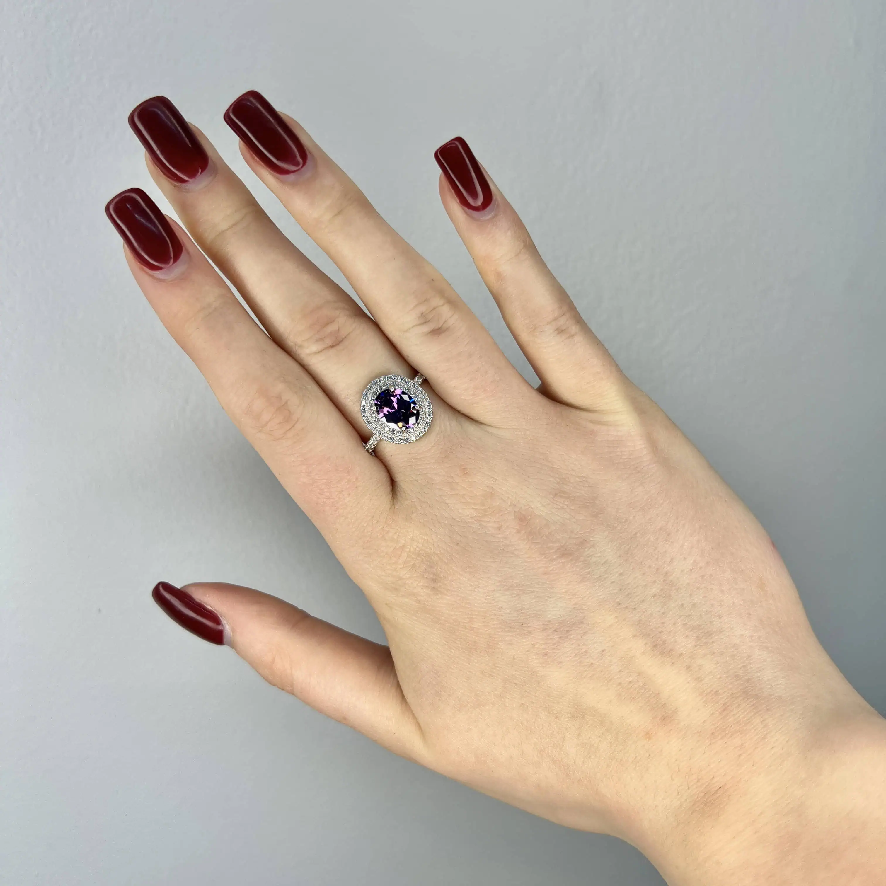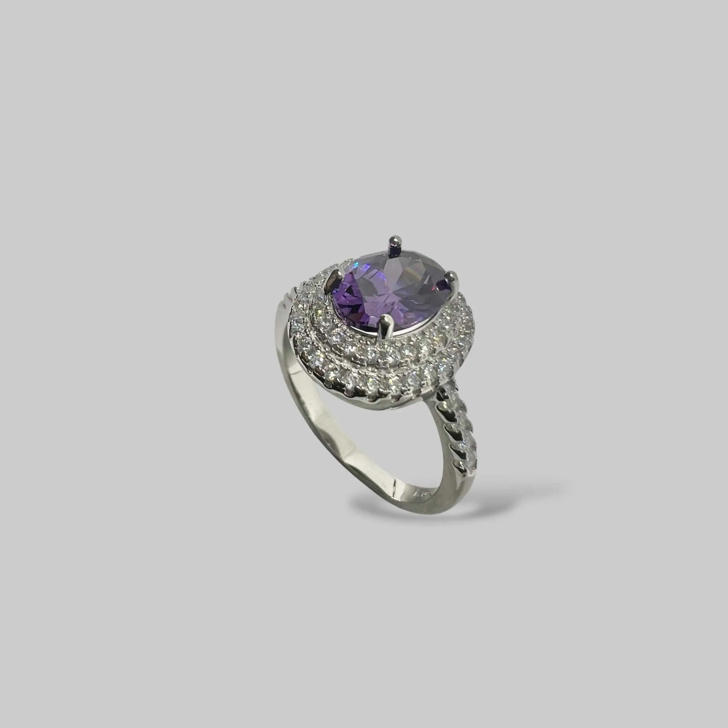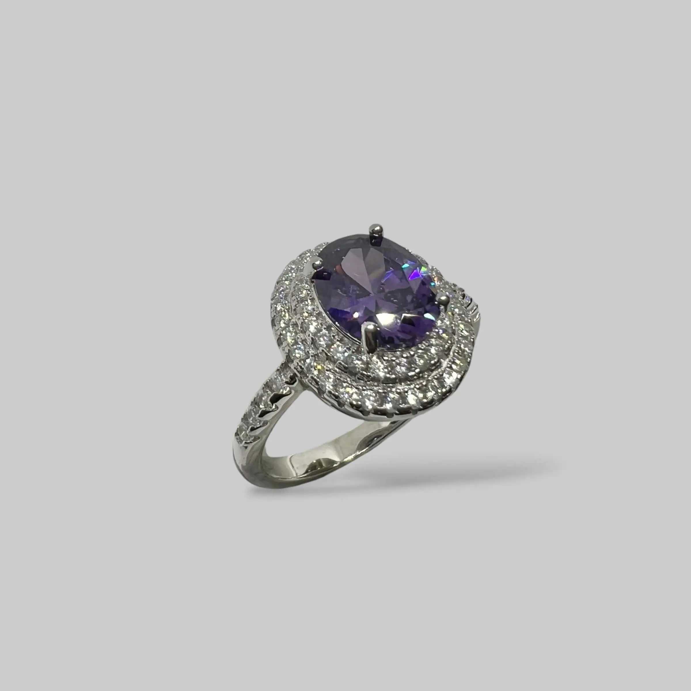 Велична прикраса з великим овальним цирконом насиченого фіолетового кольору. Подвійний ореол із дрібних білих кристалів та витончене інкрустування шинки створюють королівський блиск.