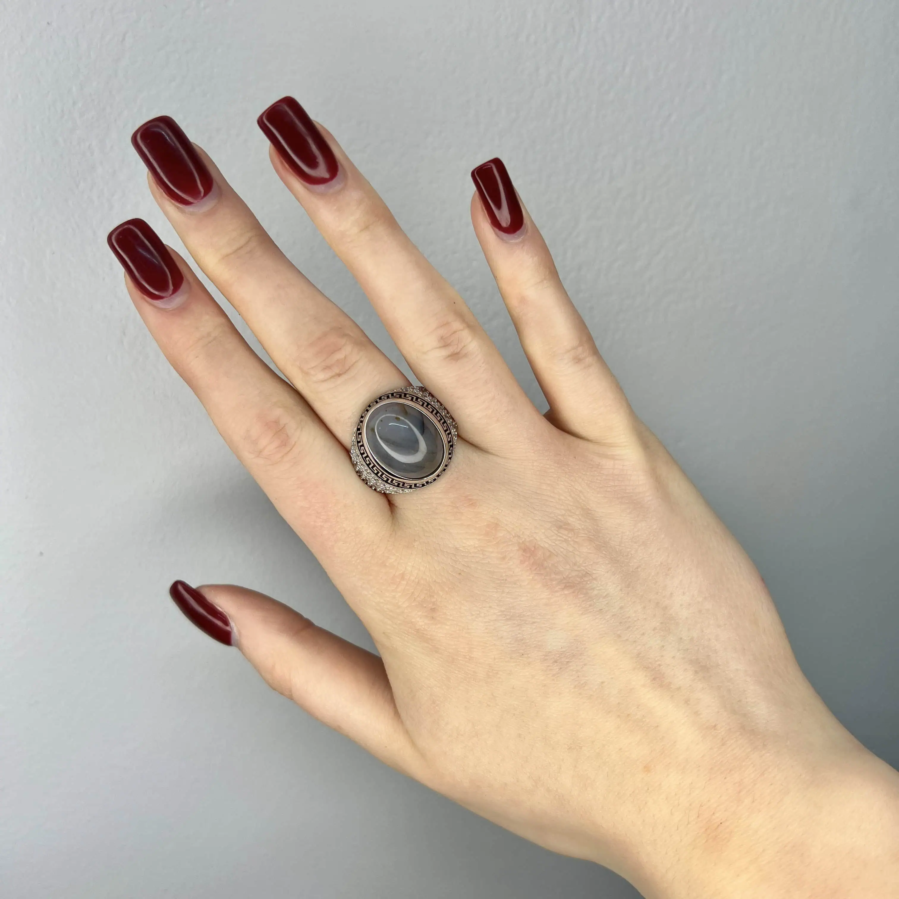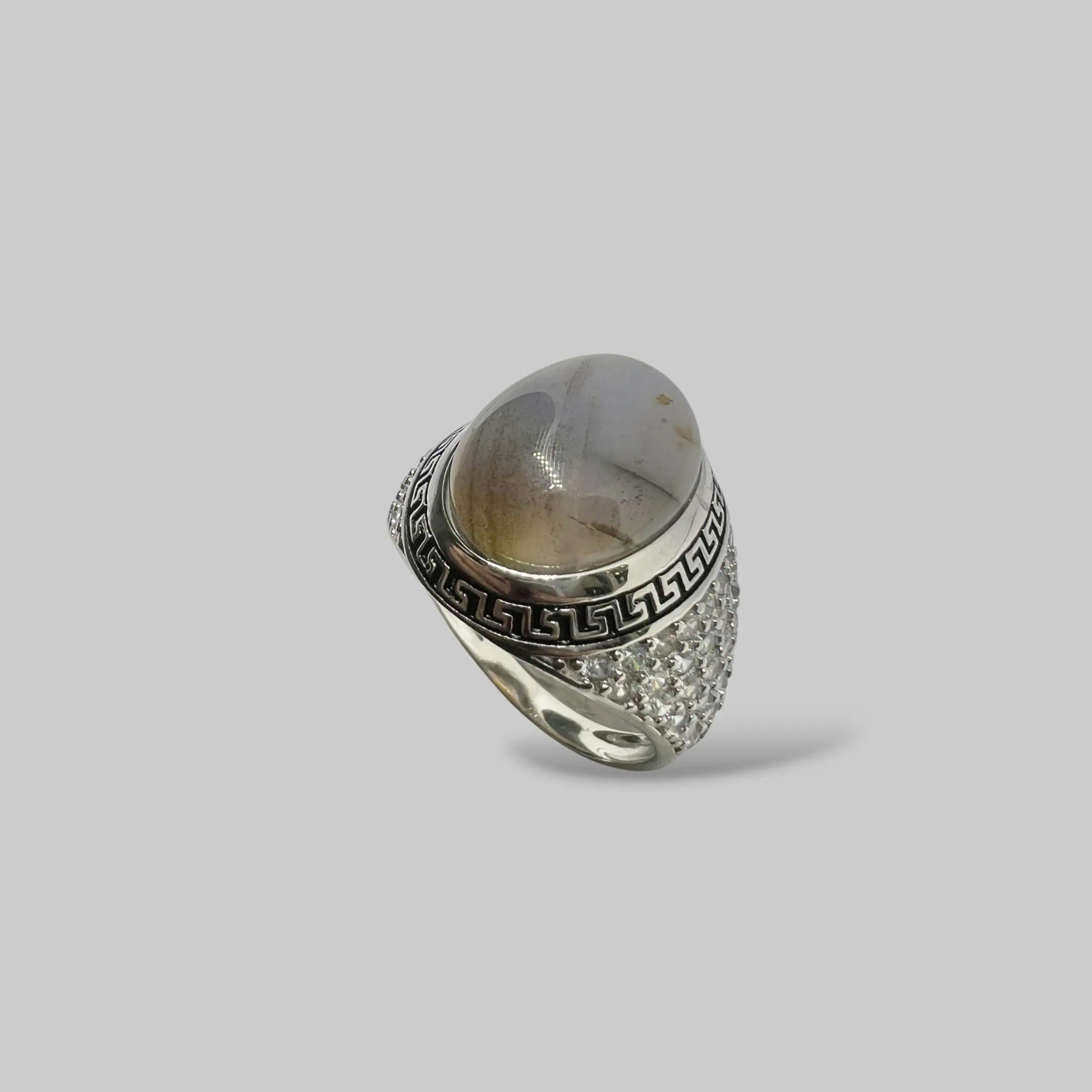 Монументальна печатка з великим димчастим агатом у формі кабошона. Срібний кант із грецьким меандром та шинка, всипана цирконами, створюють розкішний образ.