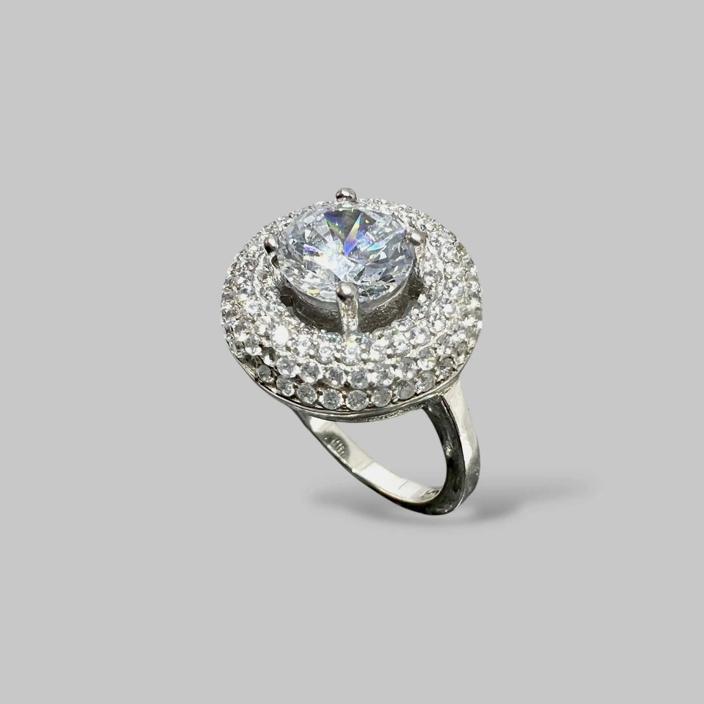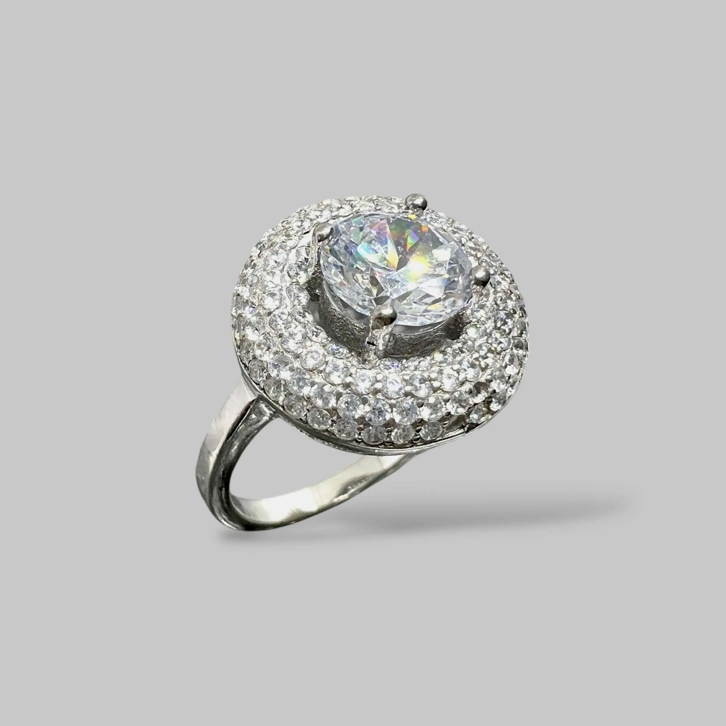 Розкішна срібна каблучка з великим центральним фіанітом, що закріплений чотирма крапанами. Масивна верхня частина декорована двома рядами дрібніших кристалів, які створюють неймовірну гру світла та підкреслюють об'ємний дизайн прикраси.