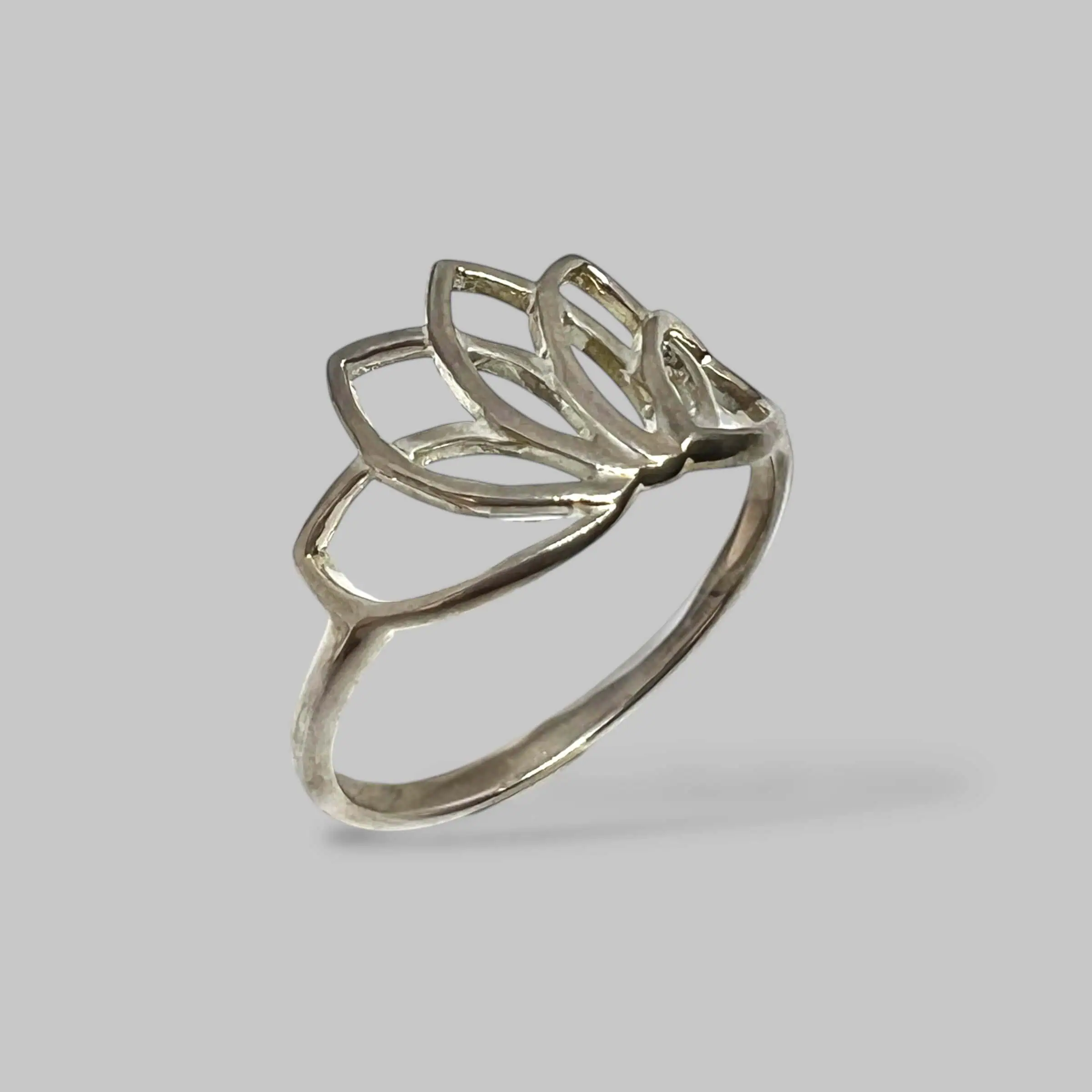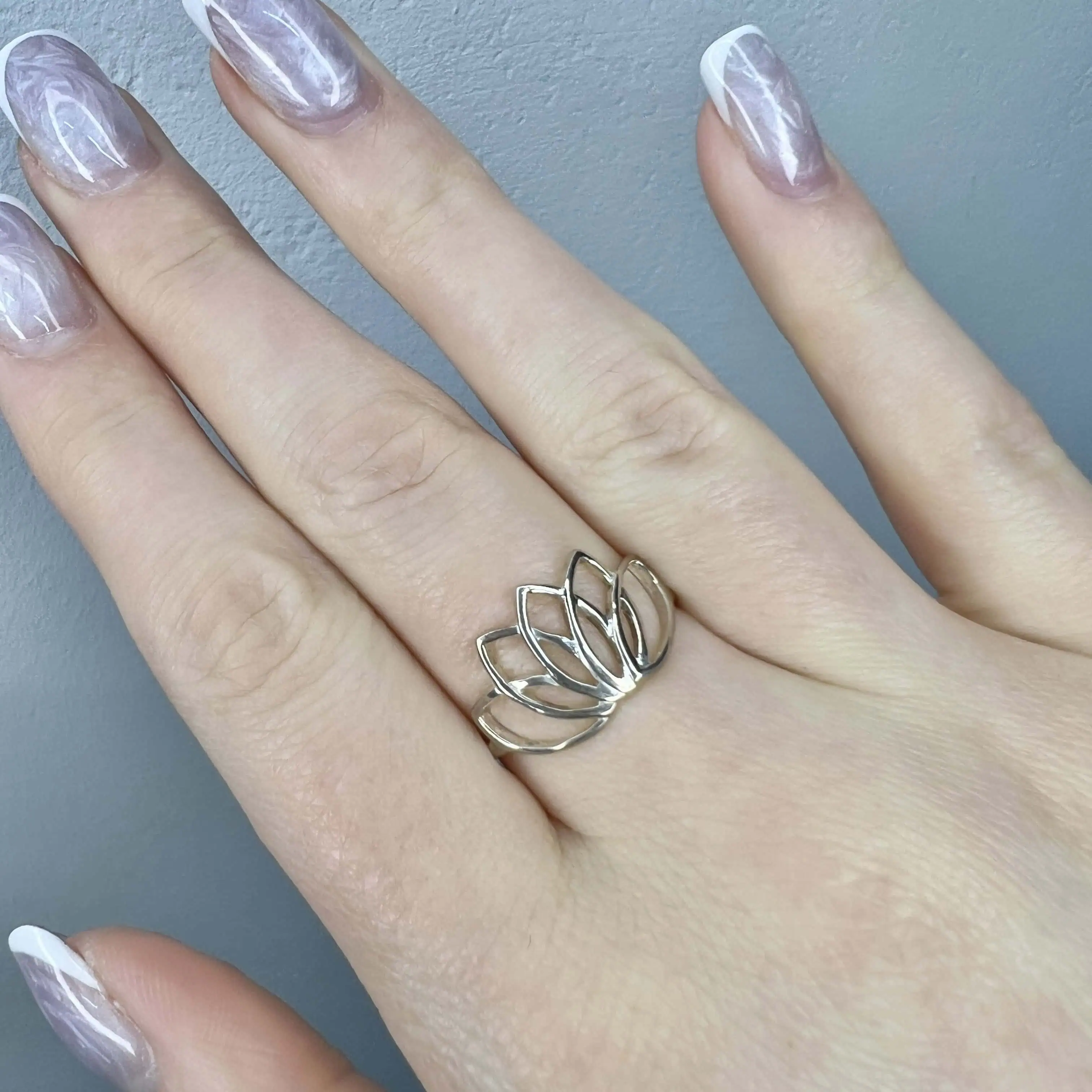 Лаконічна та витончена срібна каблучка з оригінальною вставкою у формі квітки лотоса. Тендітні металеві пелюстки створюють повітряний ажурний візерунок, що додає образу романтичності, легкості та природної гармонії, підкреслюючи витончений смак власниці.