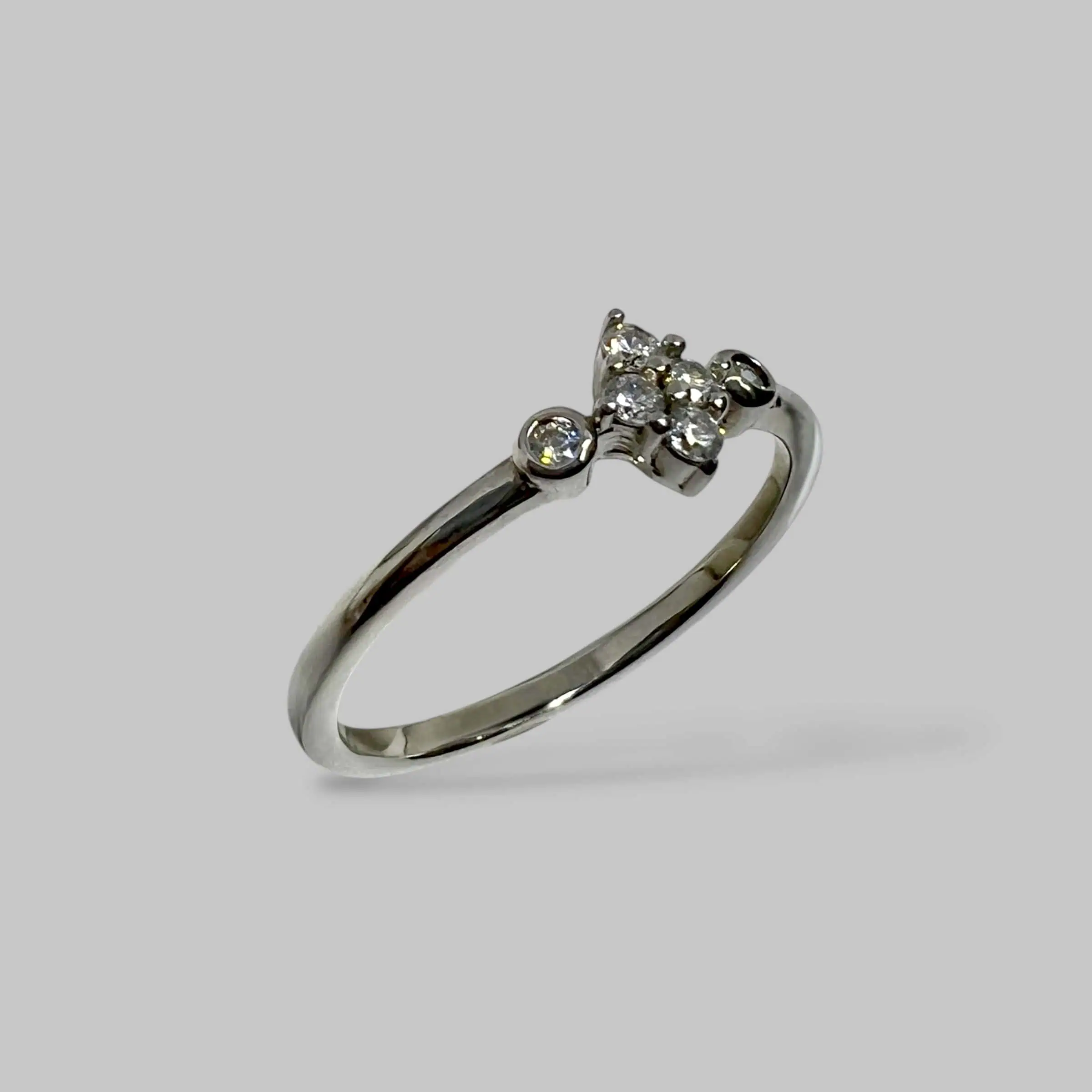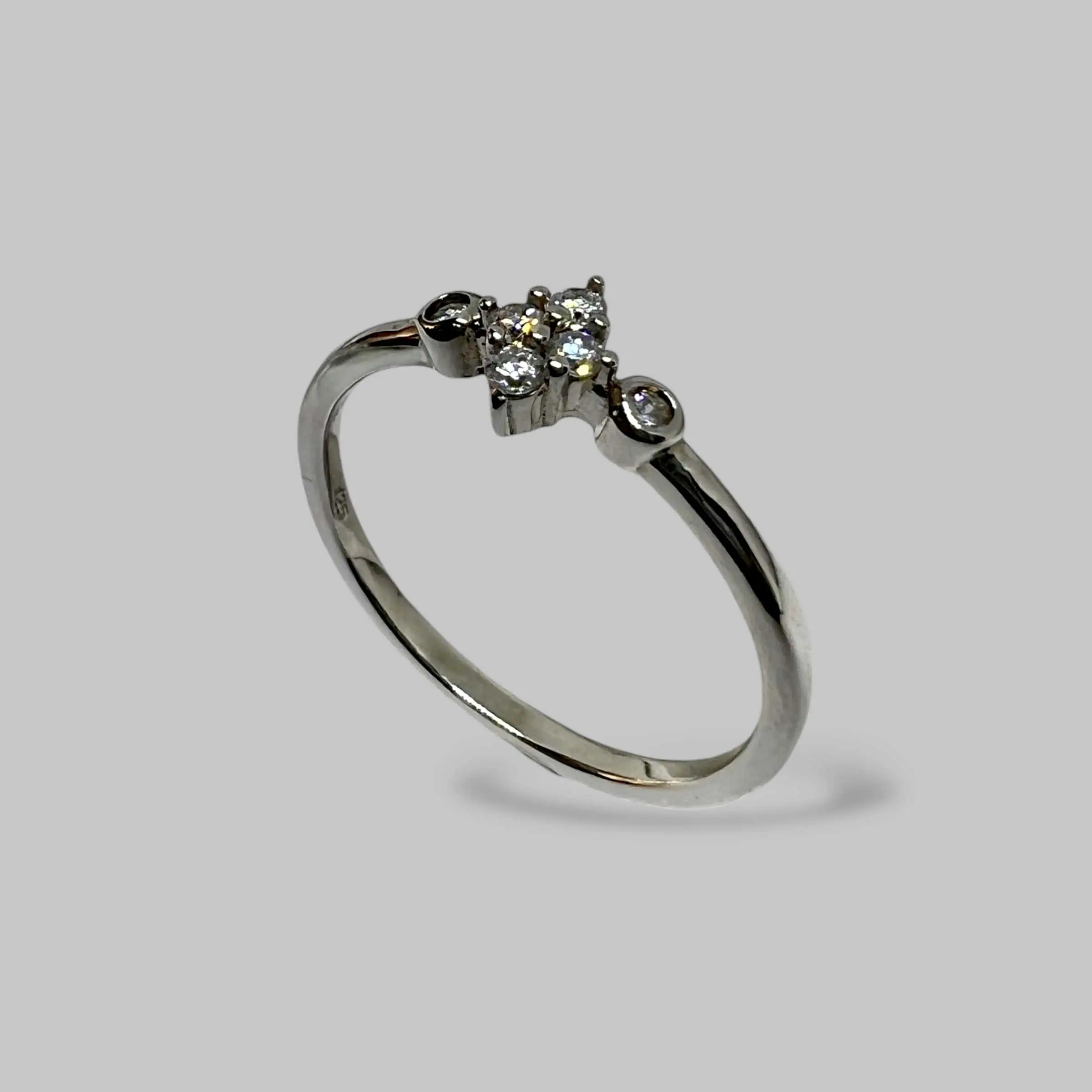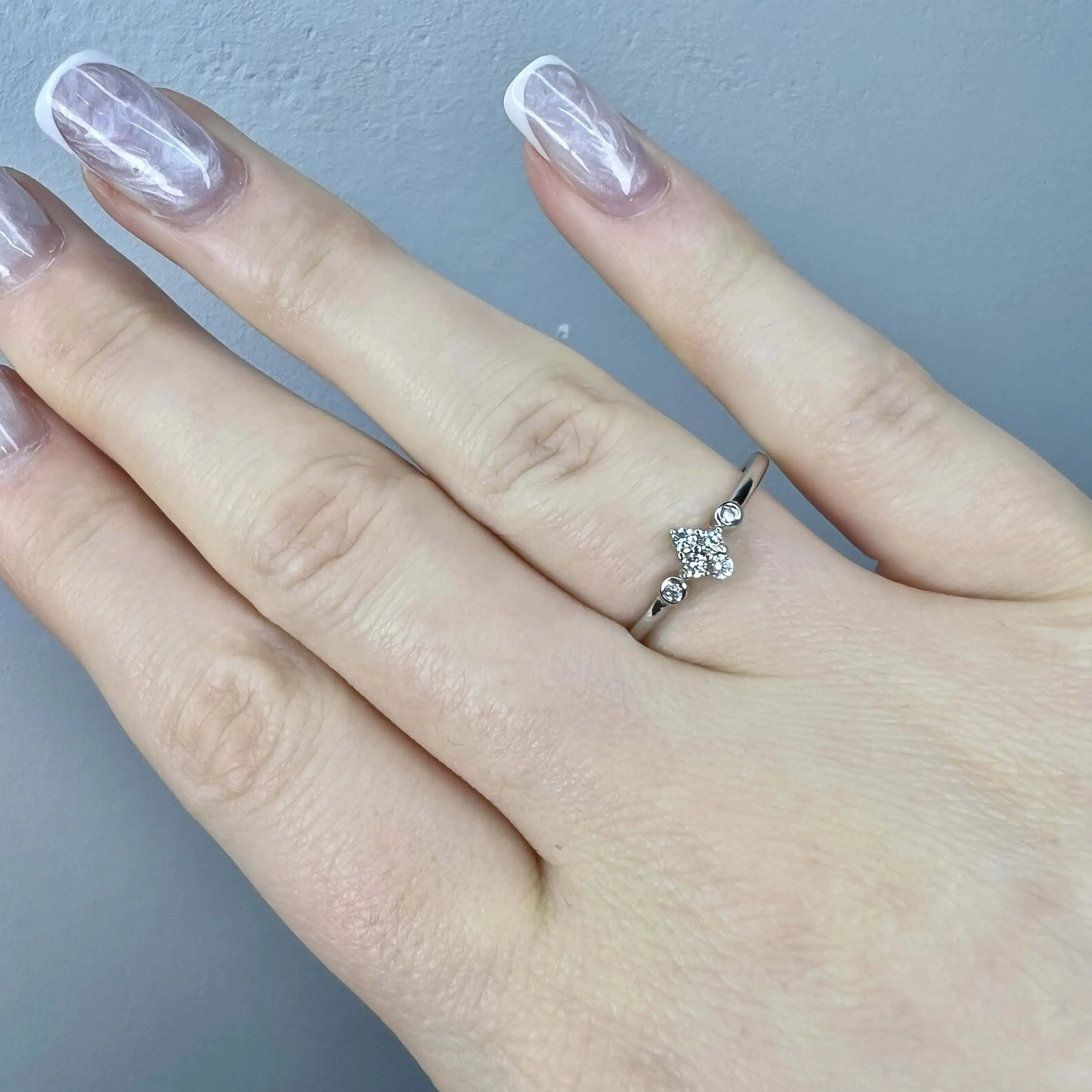 Ніжна срібна каблучка, центральна частина якої виконана у формі витонченого ромба, повністю заповненого дрібними білими цирконами. Додаткові камінці з боків підсилюють блиск, створюючи цілісну та гармонійну композицію.