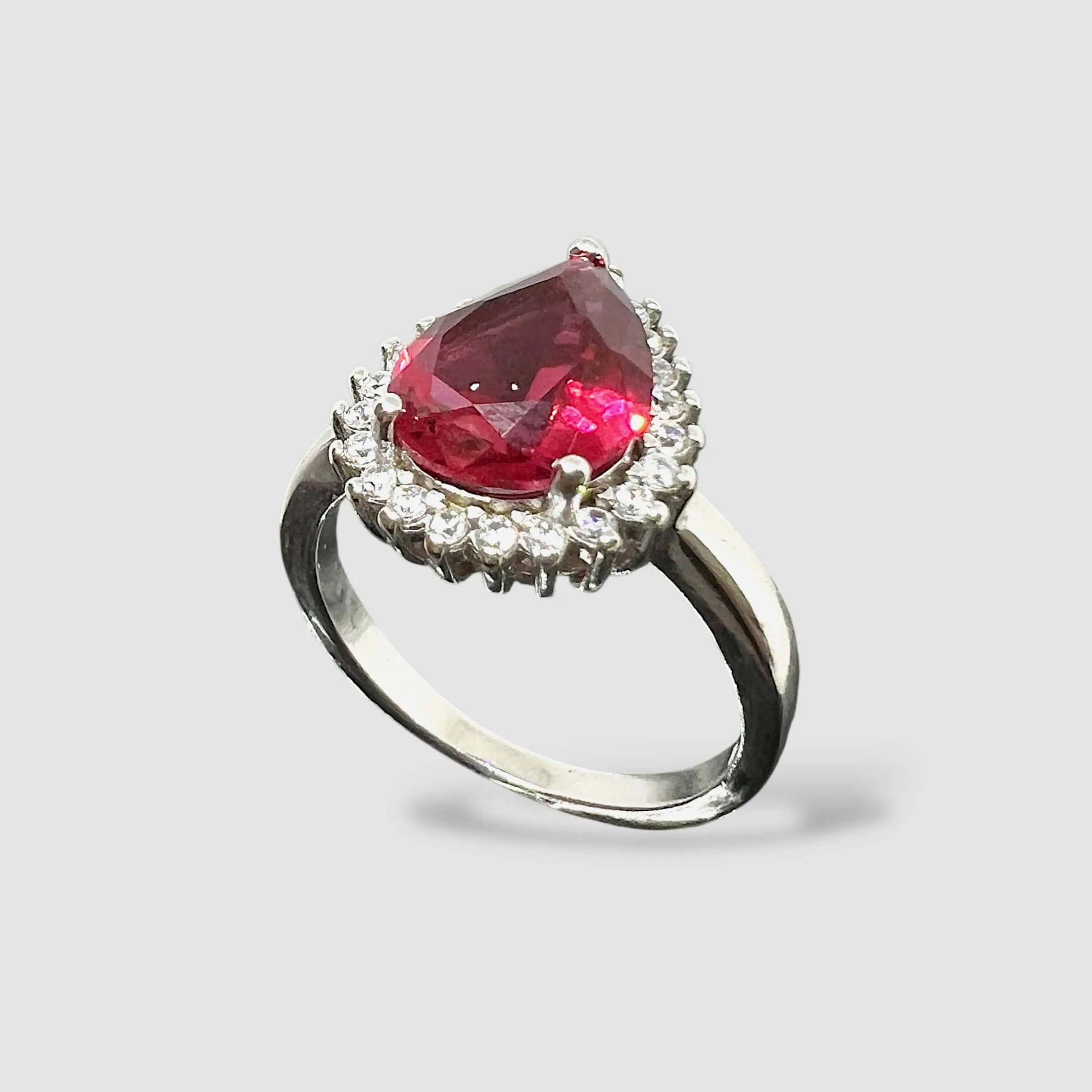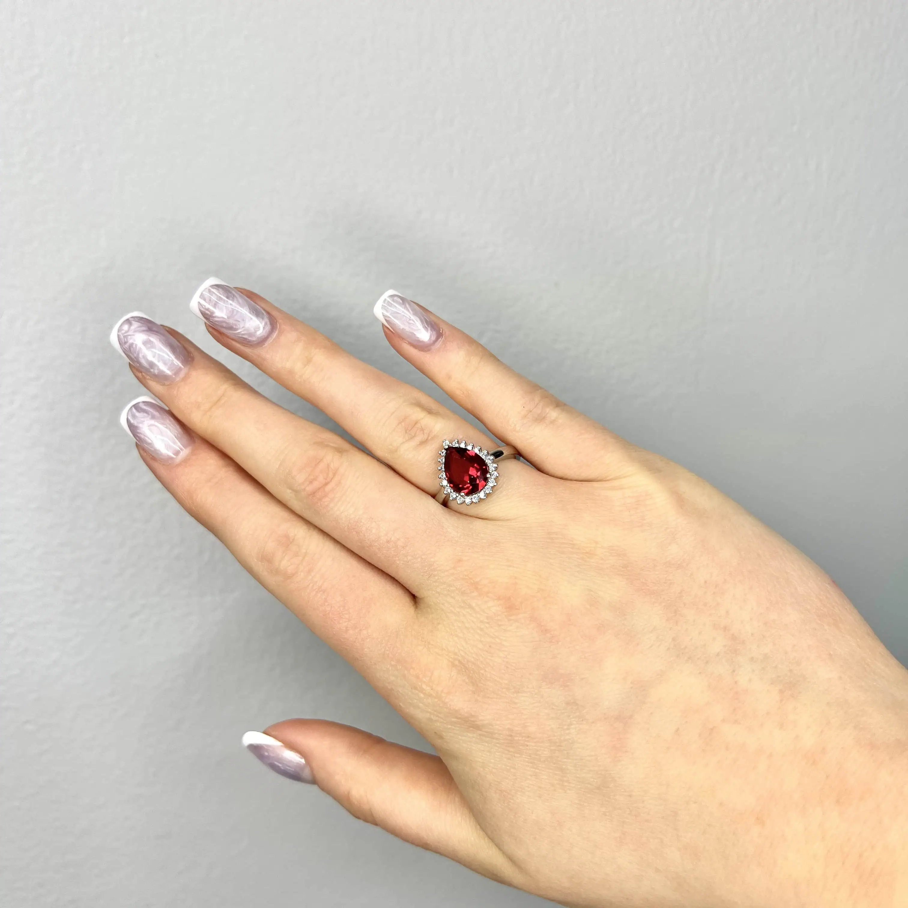 Елегантна каблучка з яскравим каменем у формі краплі. Сяючий ореол із цирконів підкреслює насичений колір та додає витонченості.