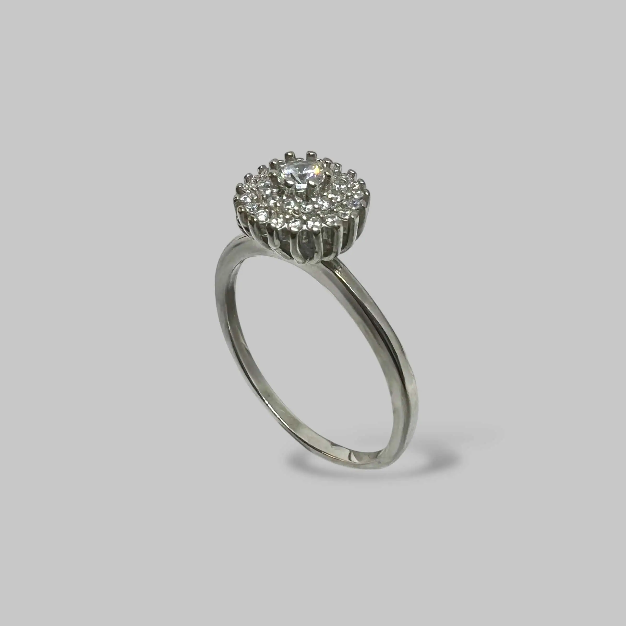 Витончена срібна каблучка з тонкою шинкою, центральним елементом якої є розкішна композиція у формі квітки, густо інкрустована прозорими цирконами.