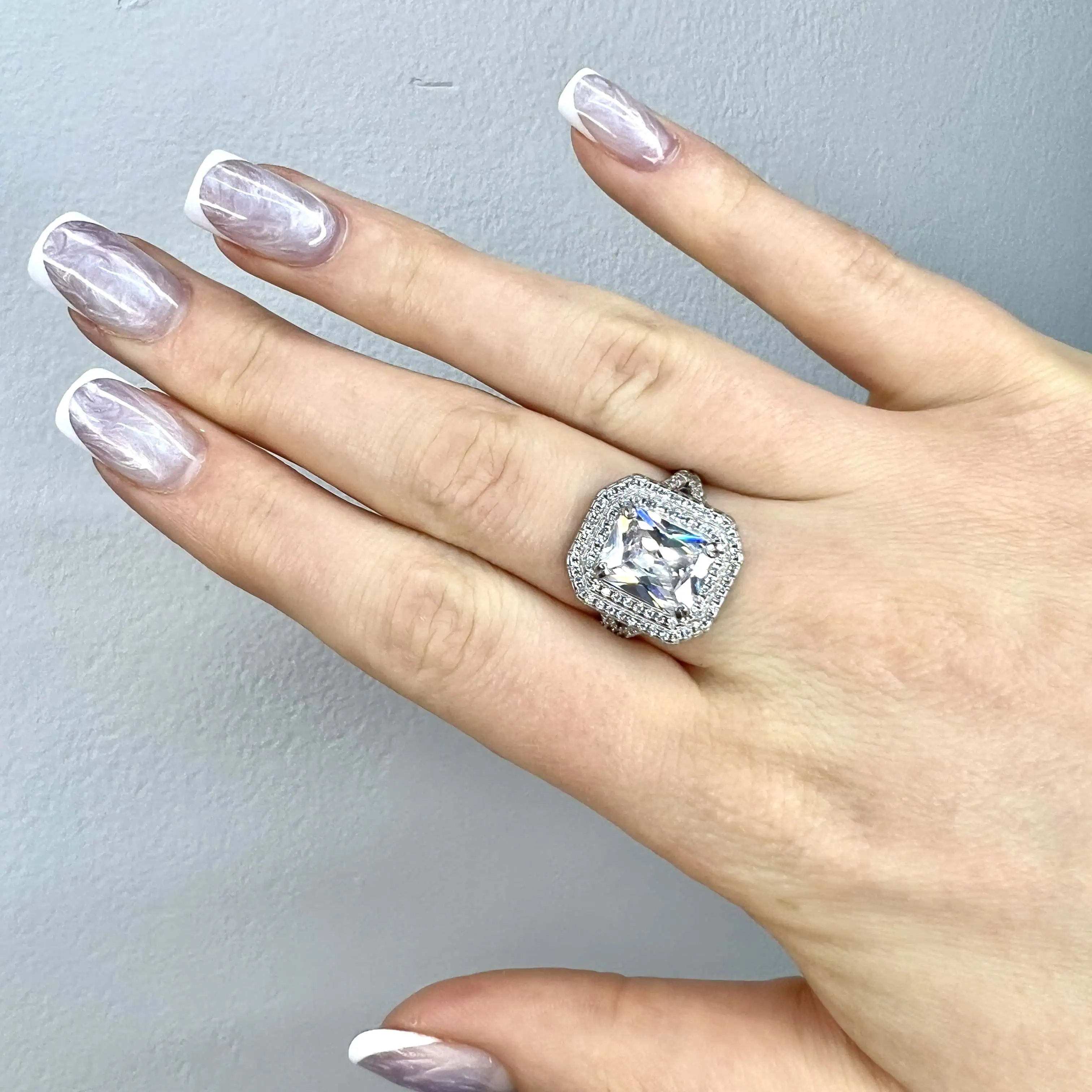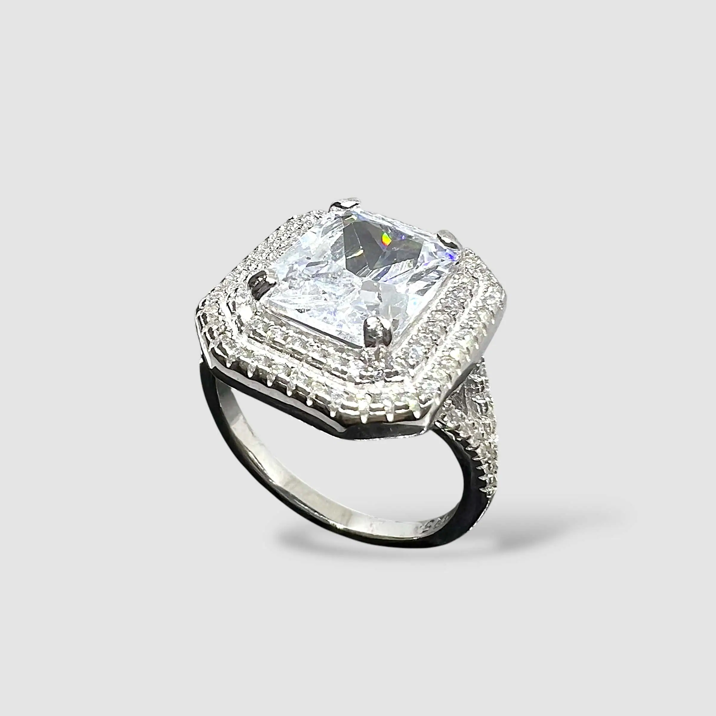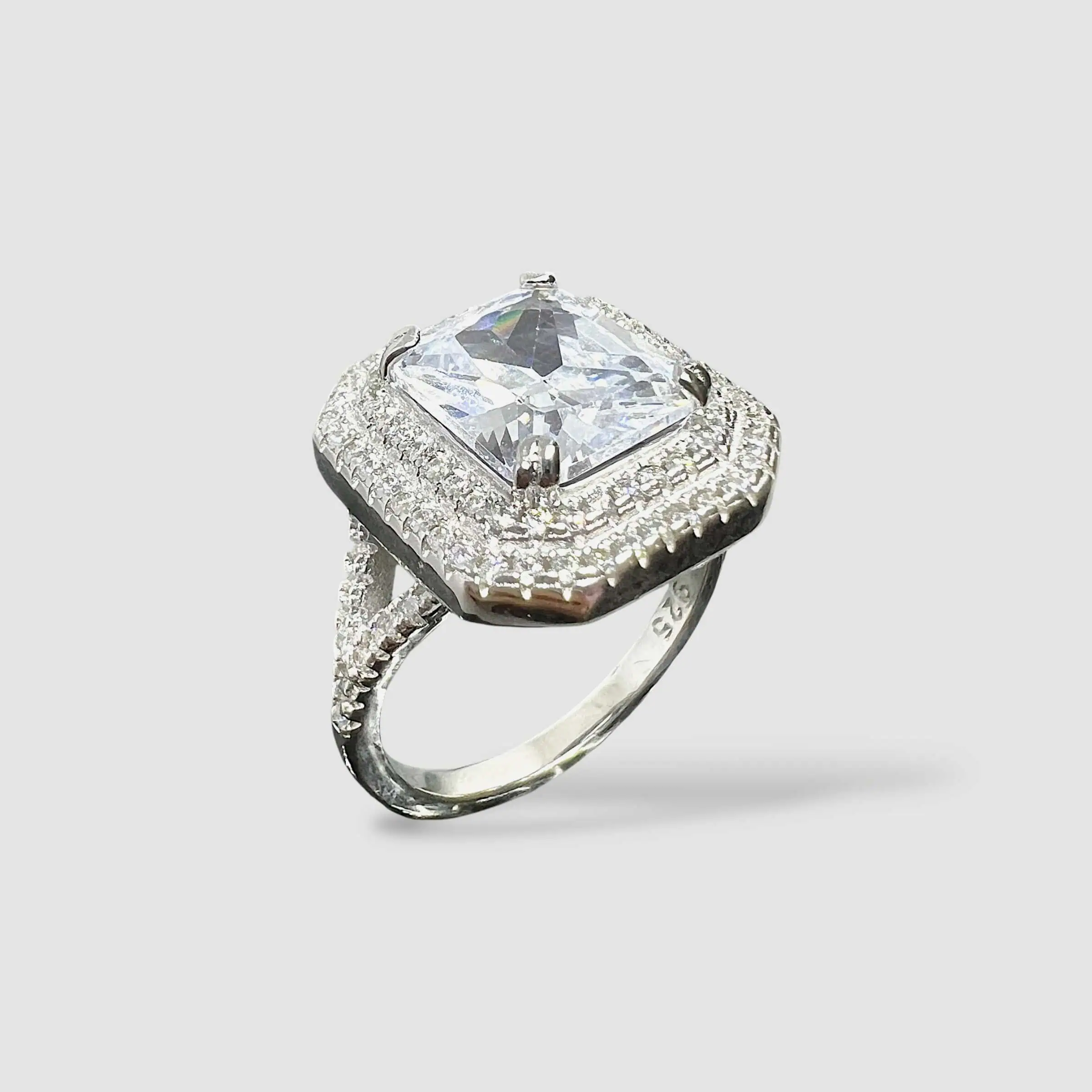 Масивна срібна прикраса, що вражає своїм блиском. Центральний прямокутний камінь оточений подвійним ореолом із дрібних каменів, а роздвоєна шинка також щедро інкрустована, що створює ефект нескінченного сяйва.