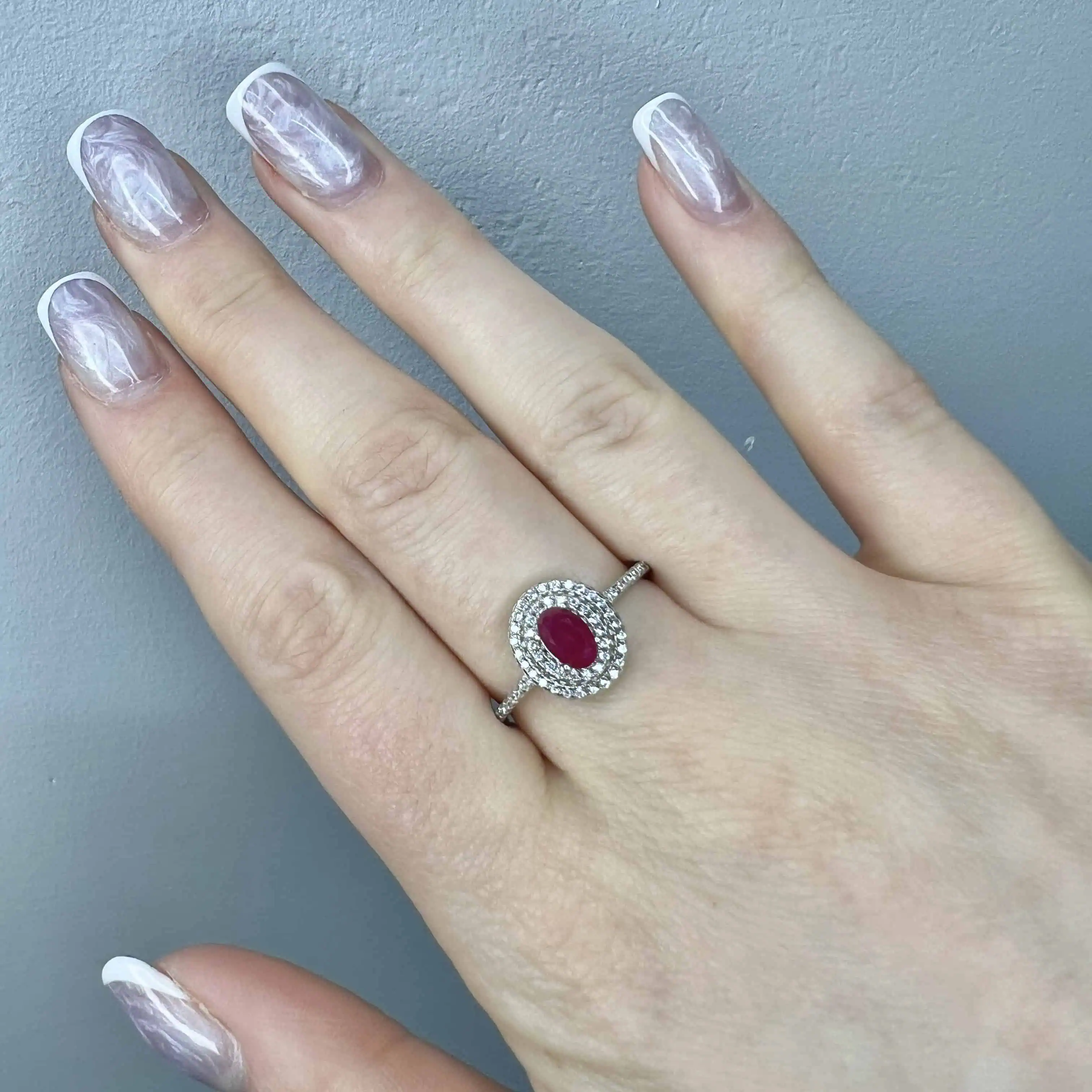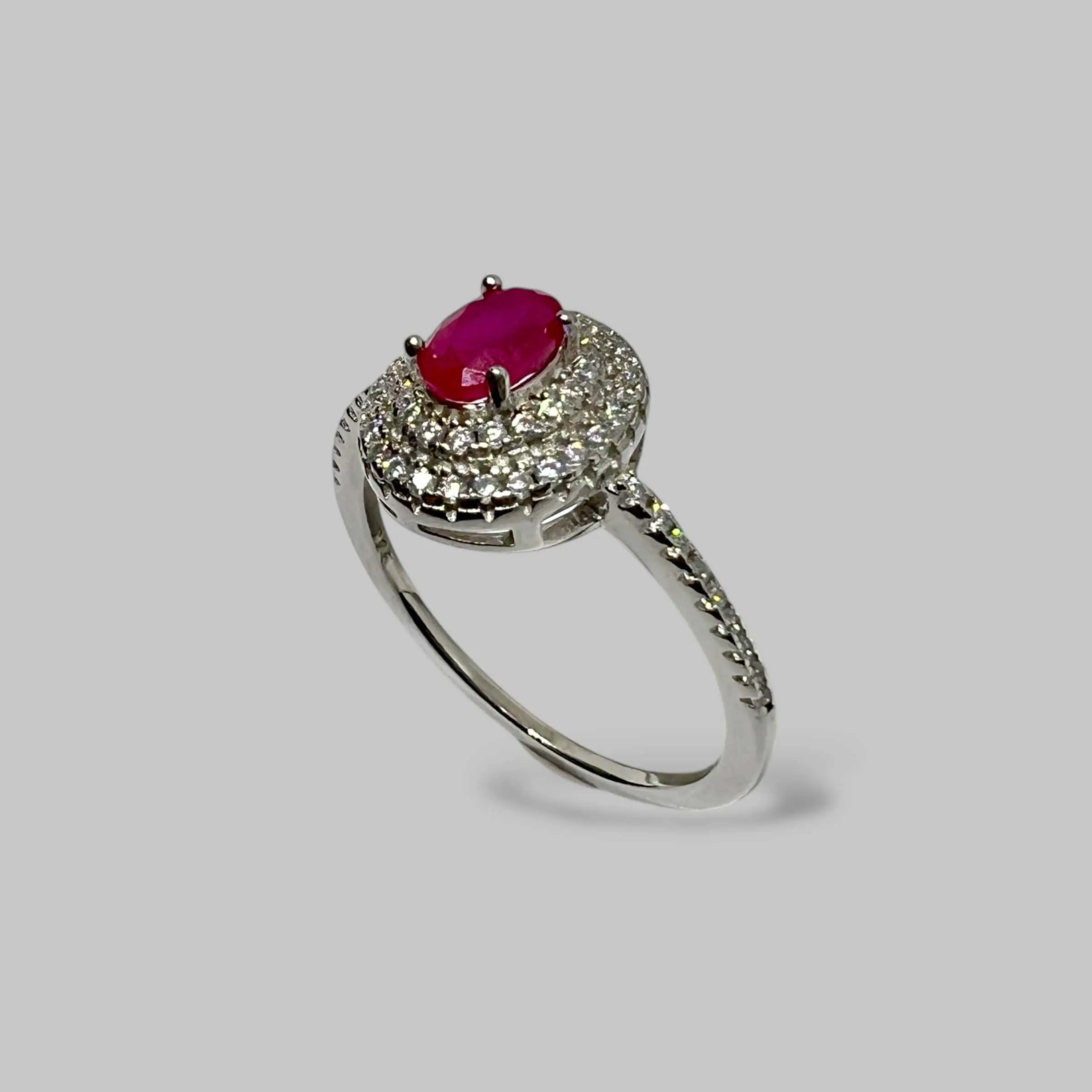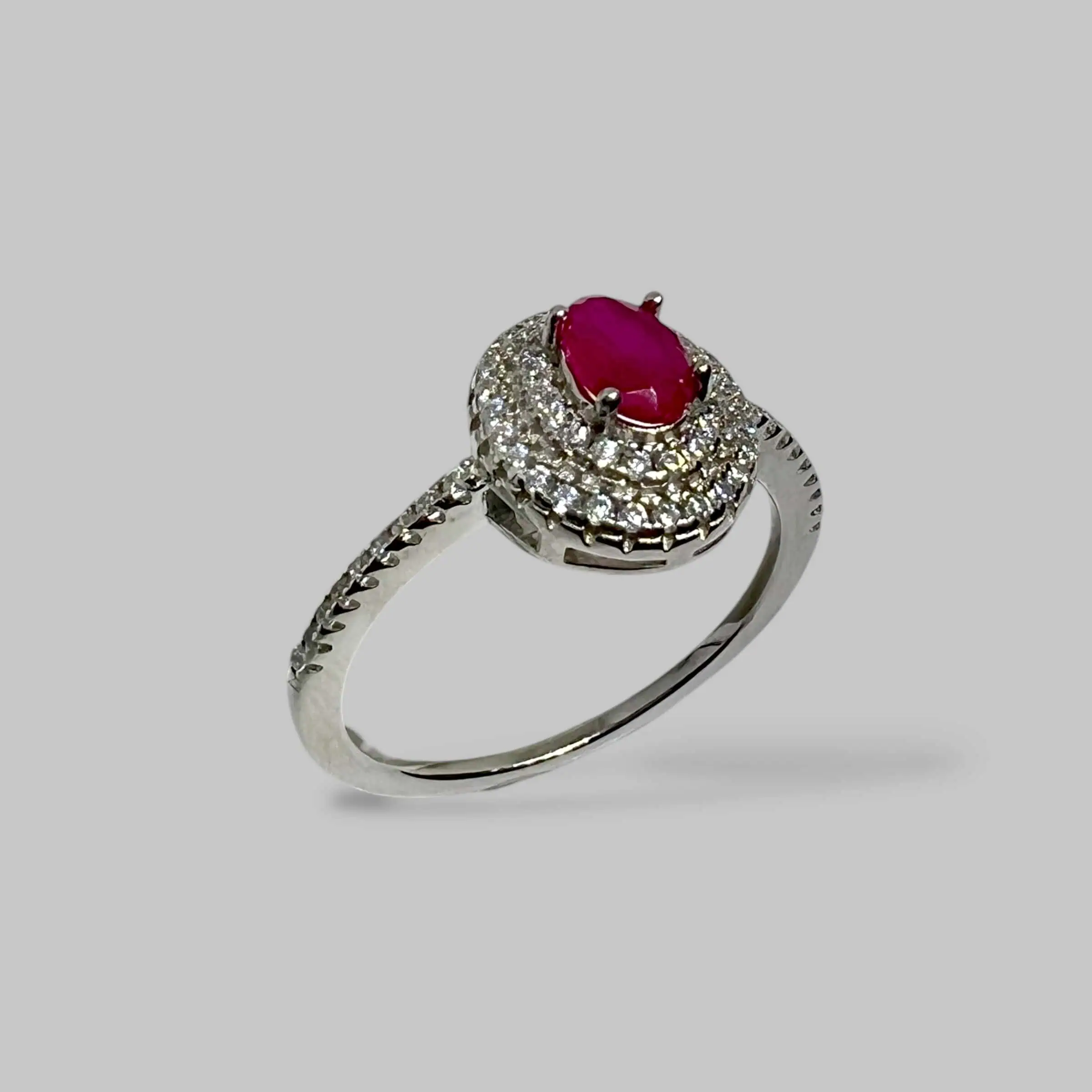 Розкішна срібна каблучка з великим центральним фіанітом у сяючому ореолі дрібних каменів. Масивна шинка виробу багато інкрустована прозорими кристалами різного огранювання, що створює неймовірну гру світла при кожному русі.