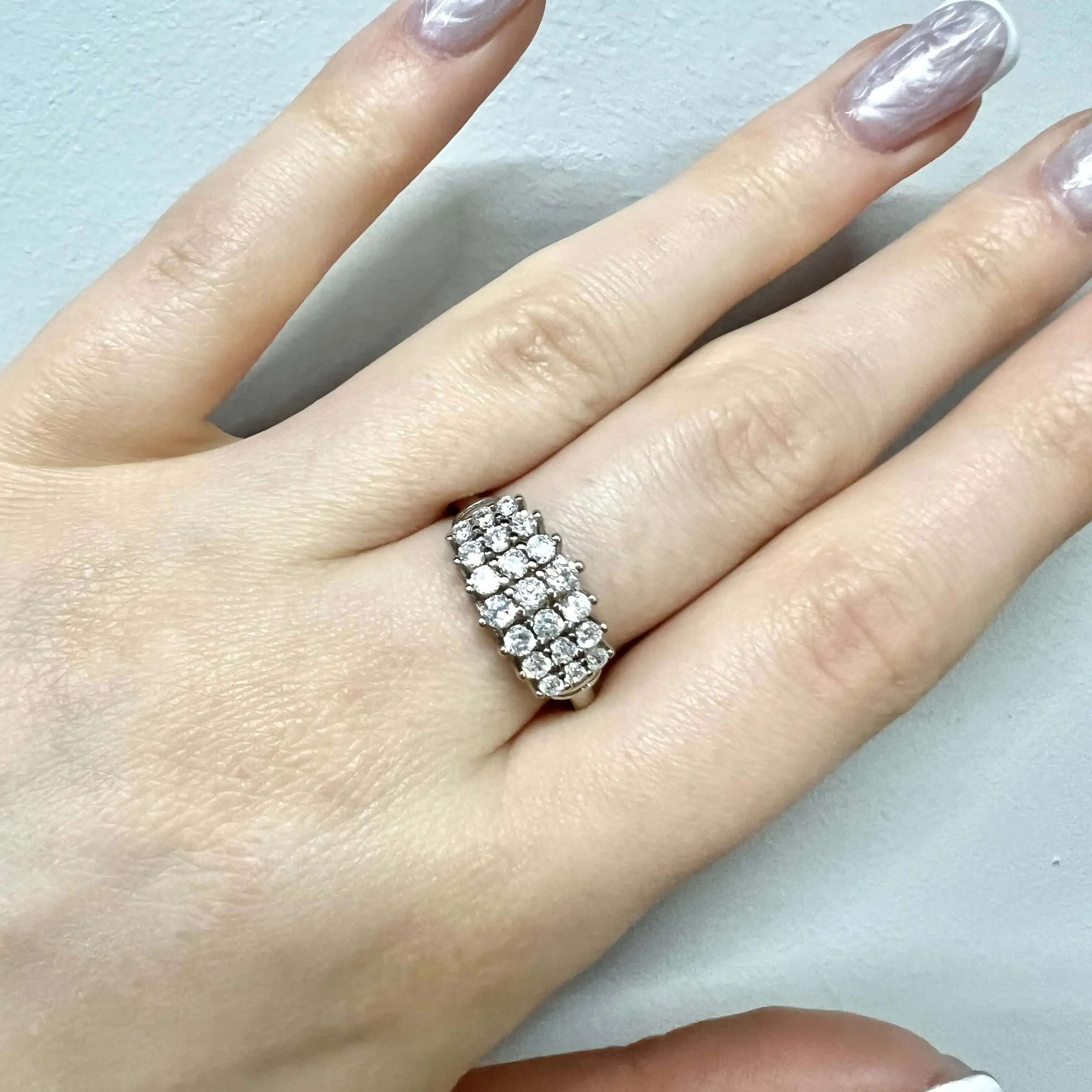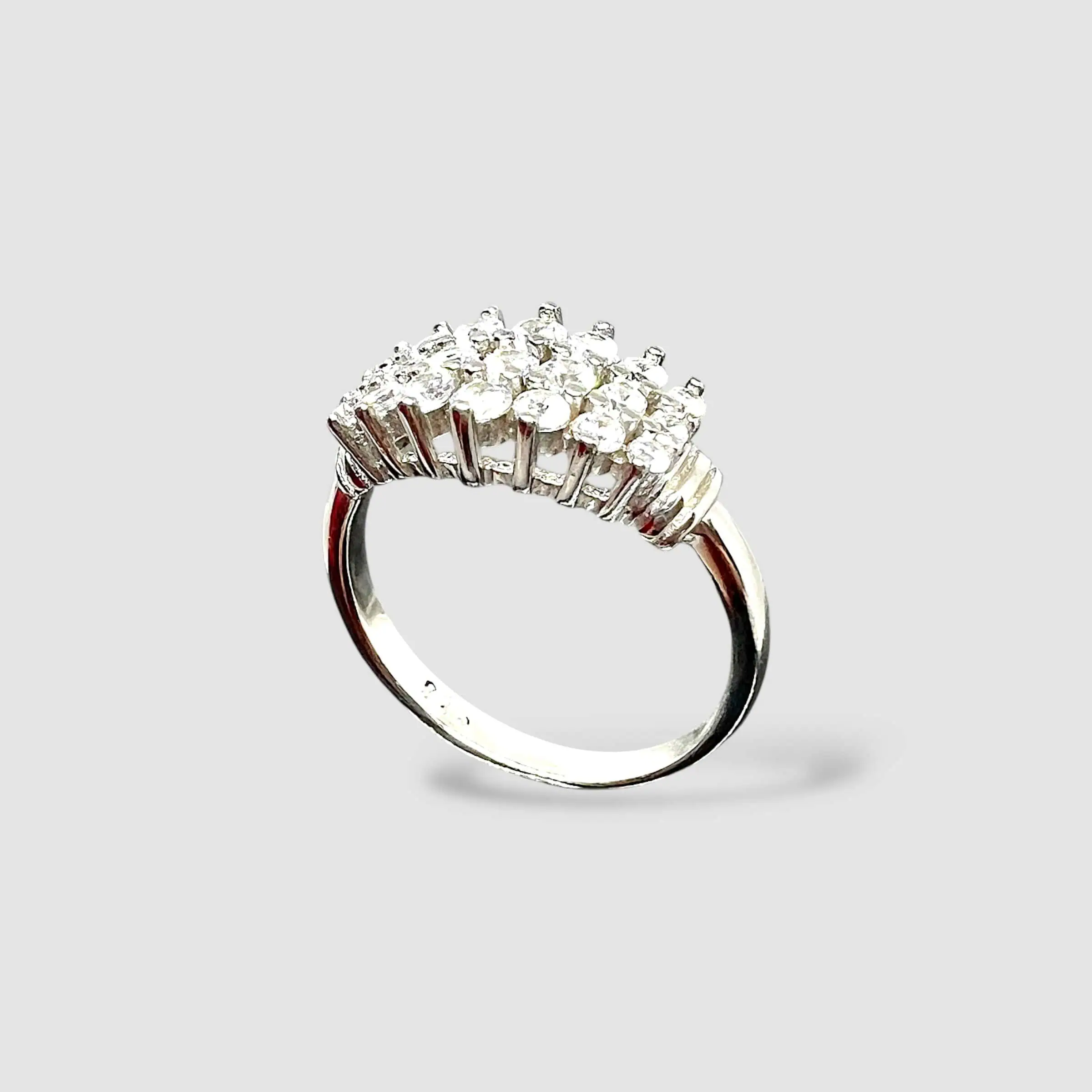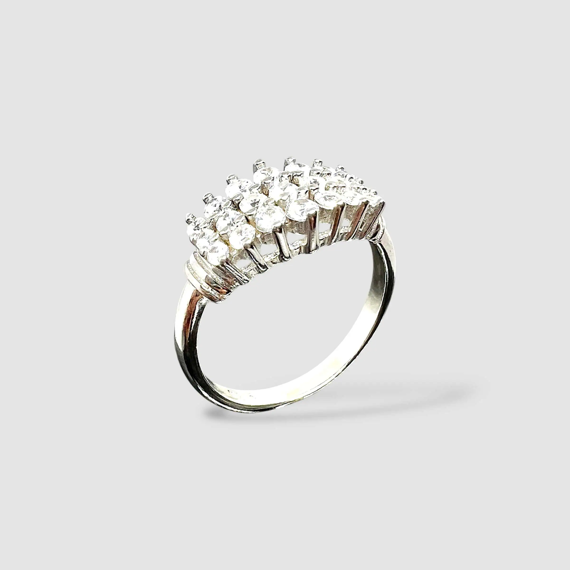 Витончена каблучка, що поєднує в собі сувору геометрію та розкішний блиск. Головною особливістю моделі є широка фронтальна частина, інкрустована трьома рядами прозорих кристалів цирконію.