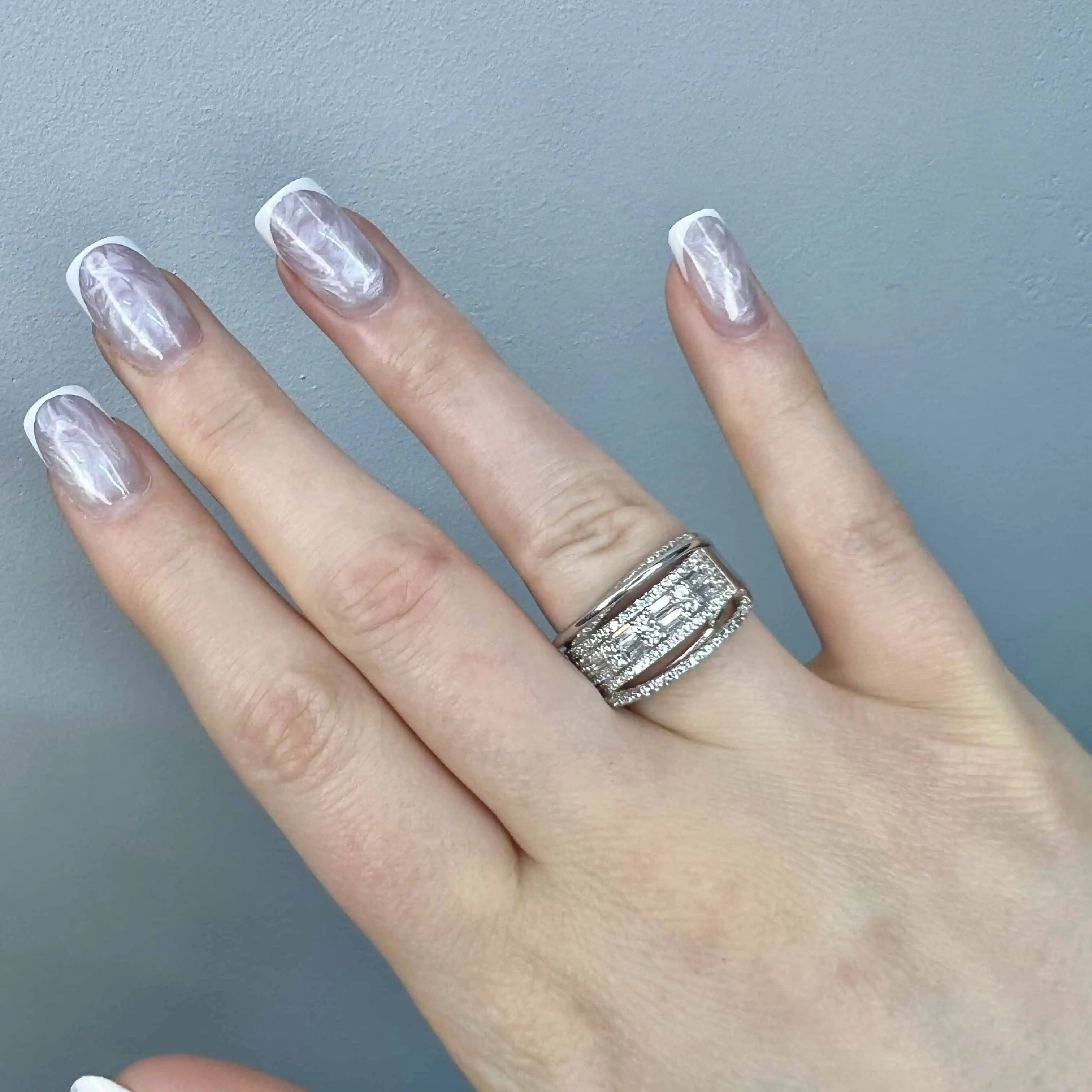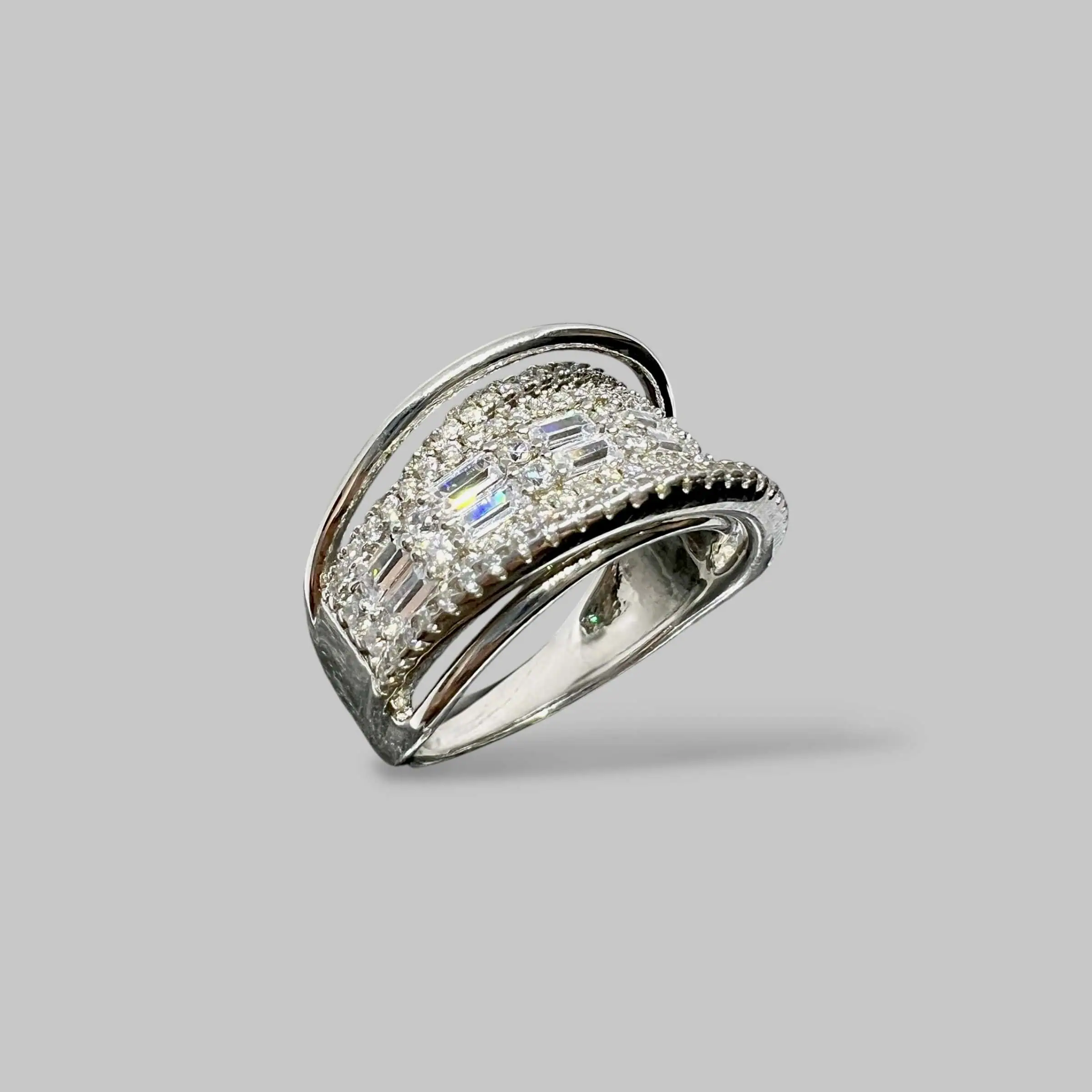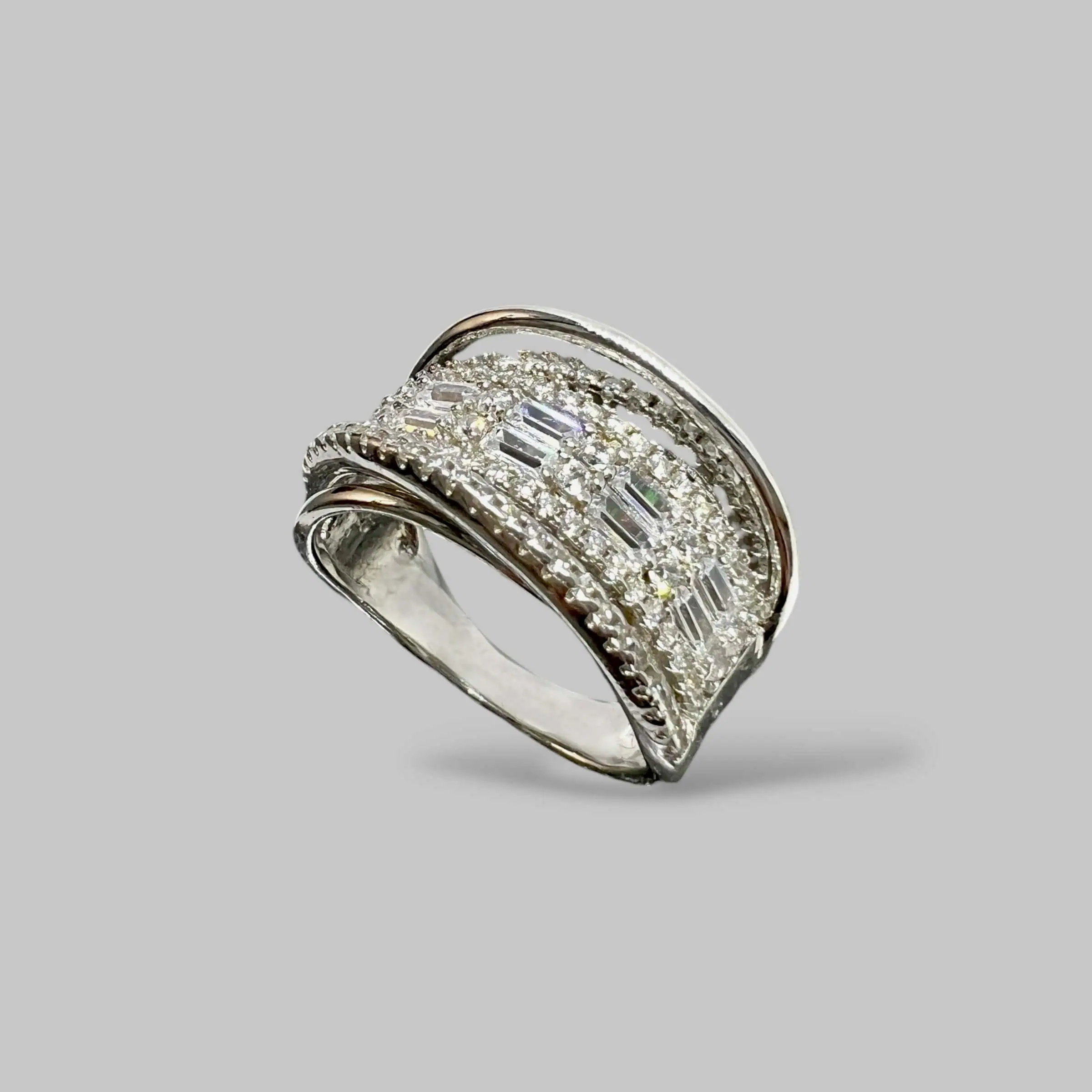 Масивна срібна каблука з багатою інкрустацією прозорими цирконами. Поверхня виробу густо вкрита дрібними кристалами, а центральна доріжка з більших каменів у круглому огранюванні додає прикрасі особливого об'єму та неймовірного блиску.