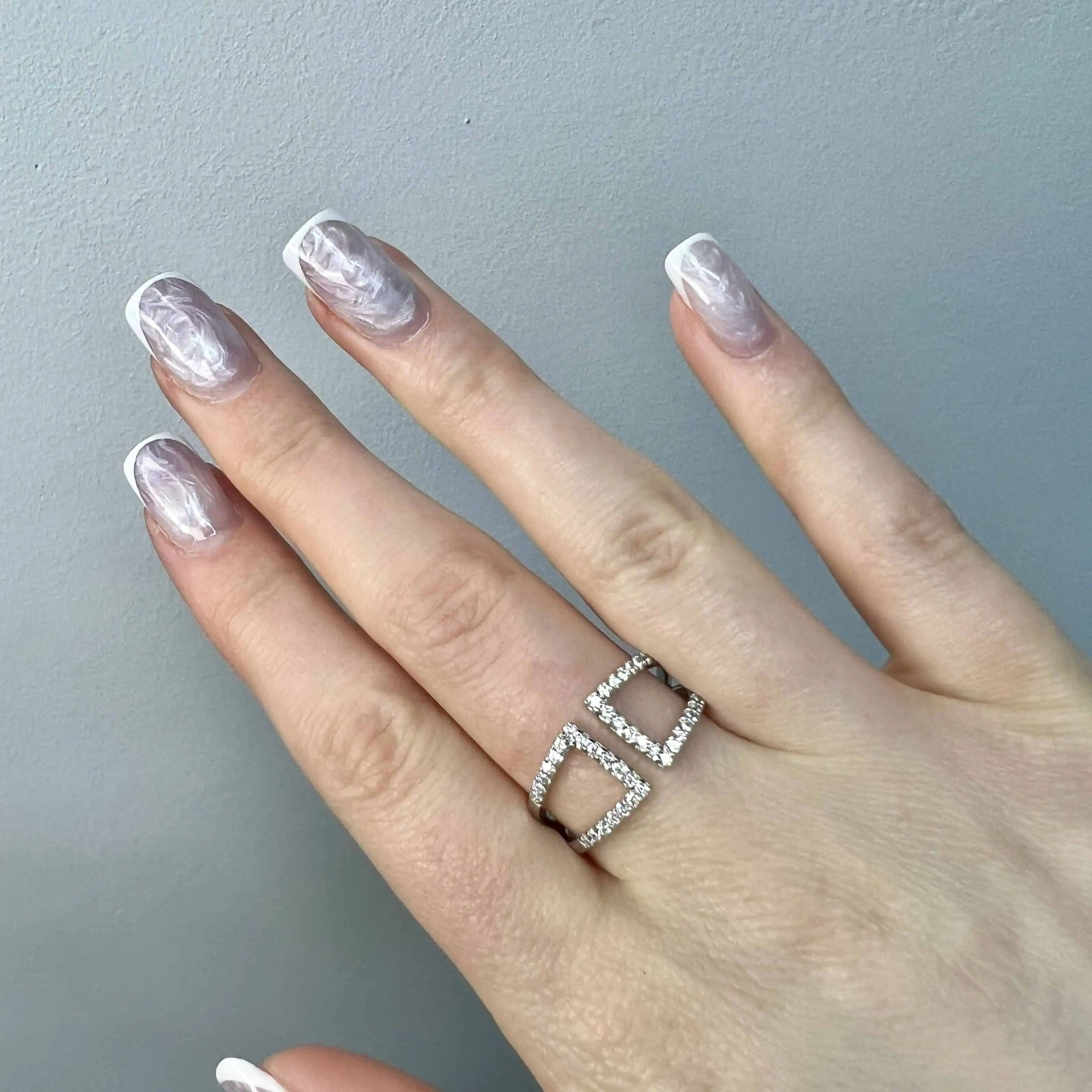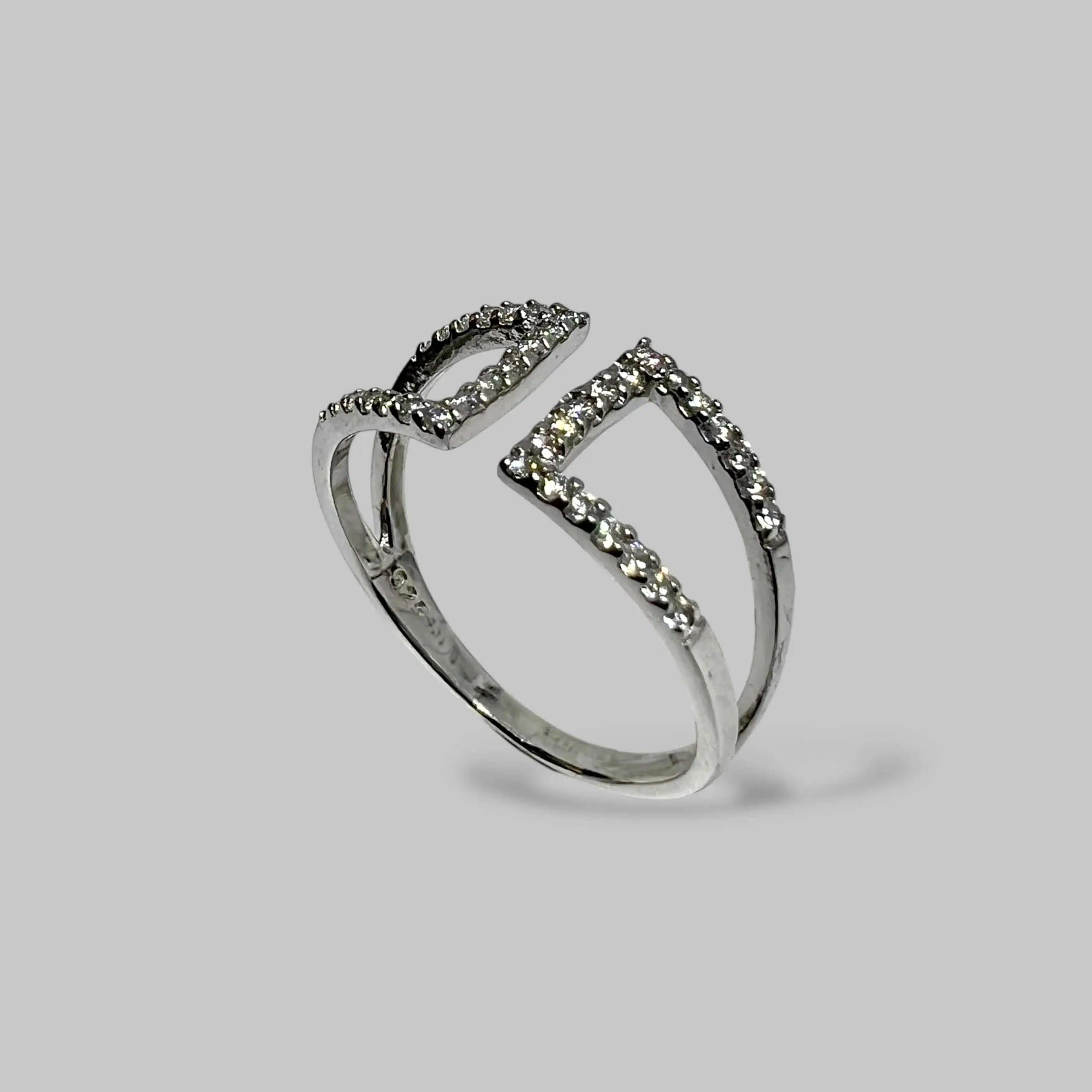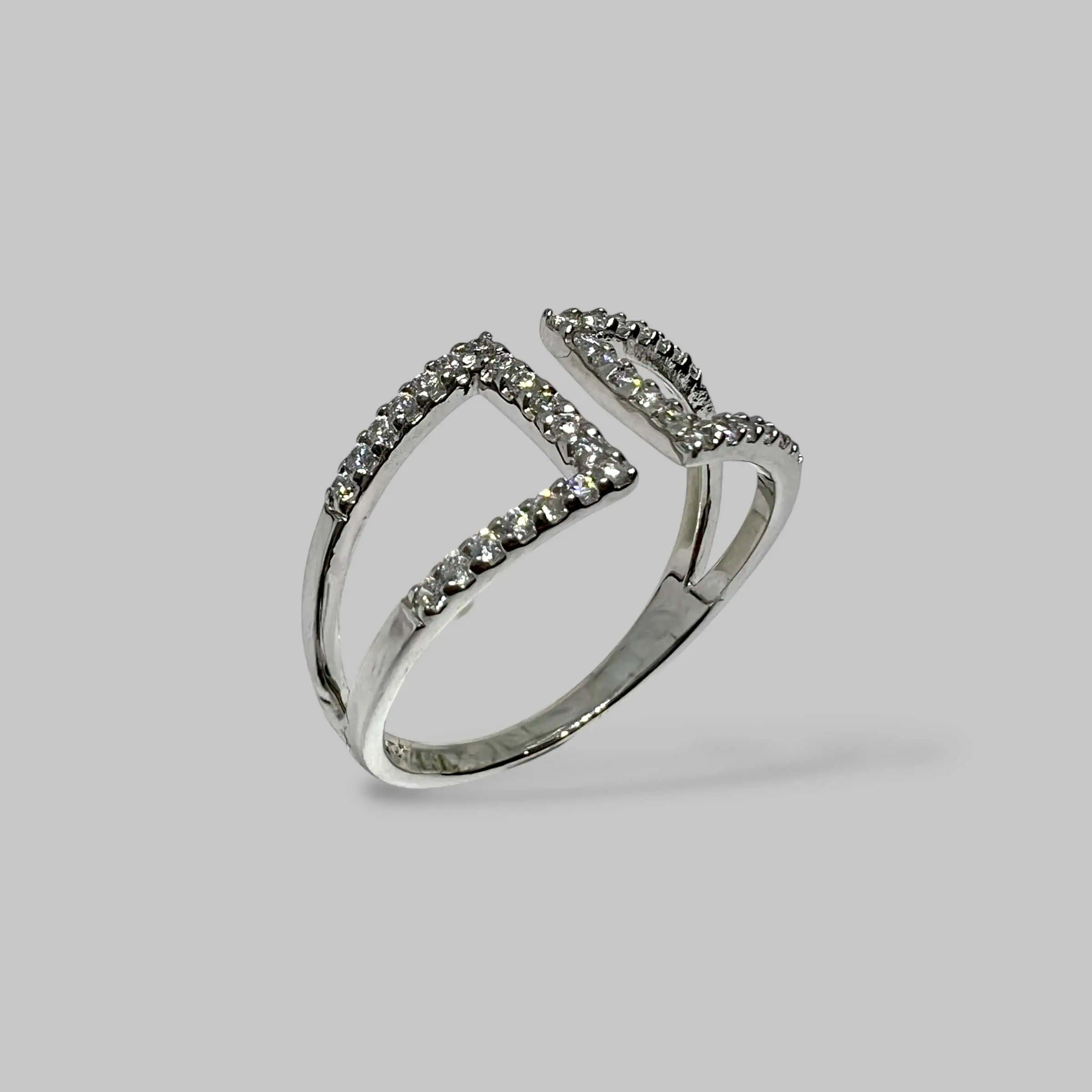 Ефектна розімкнена каблучка зі срібла, прикрашена двома симетричними трапецієподібними елементами. Суцільна інкрустація дрібними цирконами по контуру створює витончену гру світла, додаючи образу сучасної елегантності та візуальної легкості.