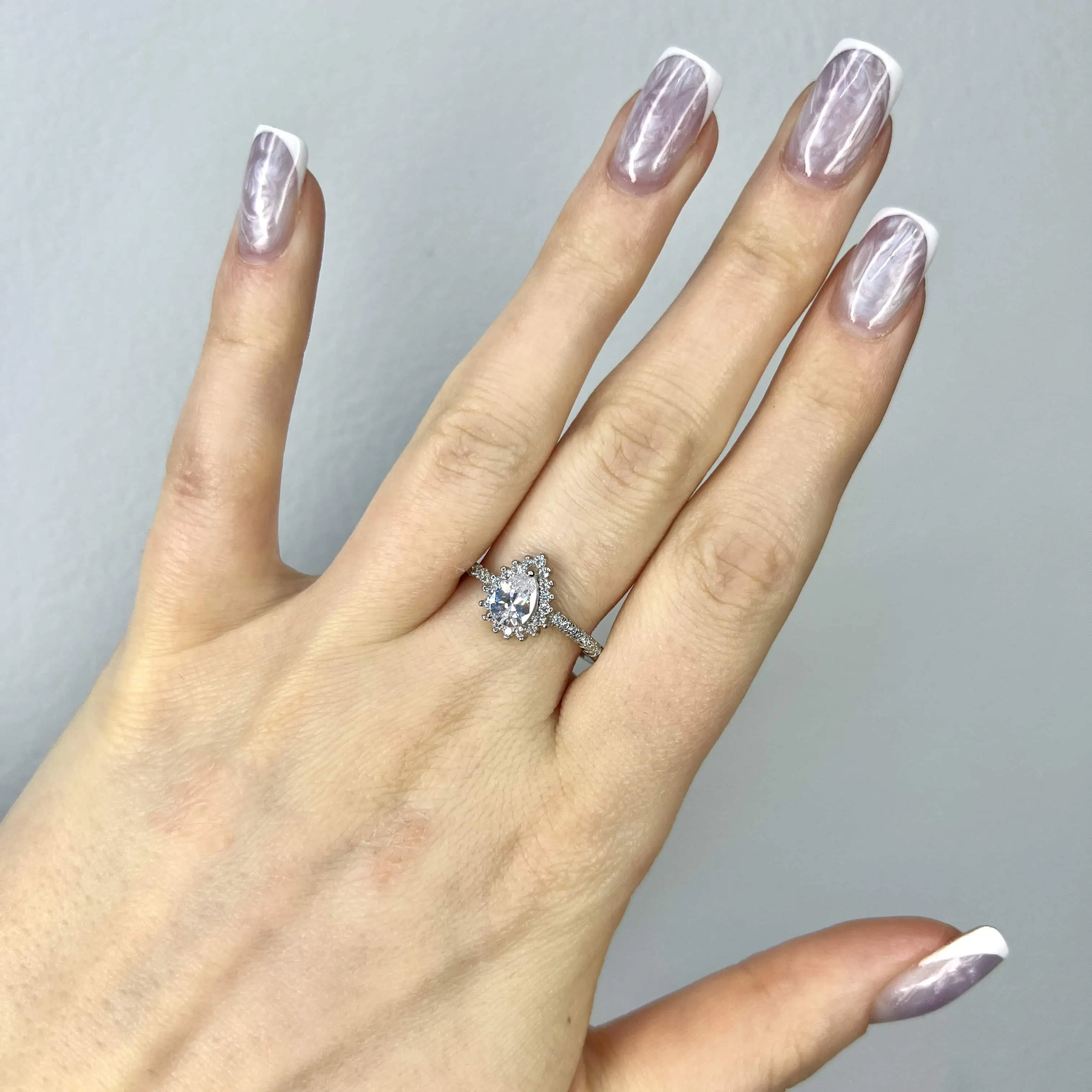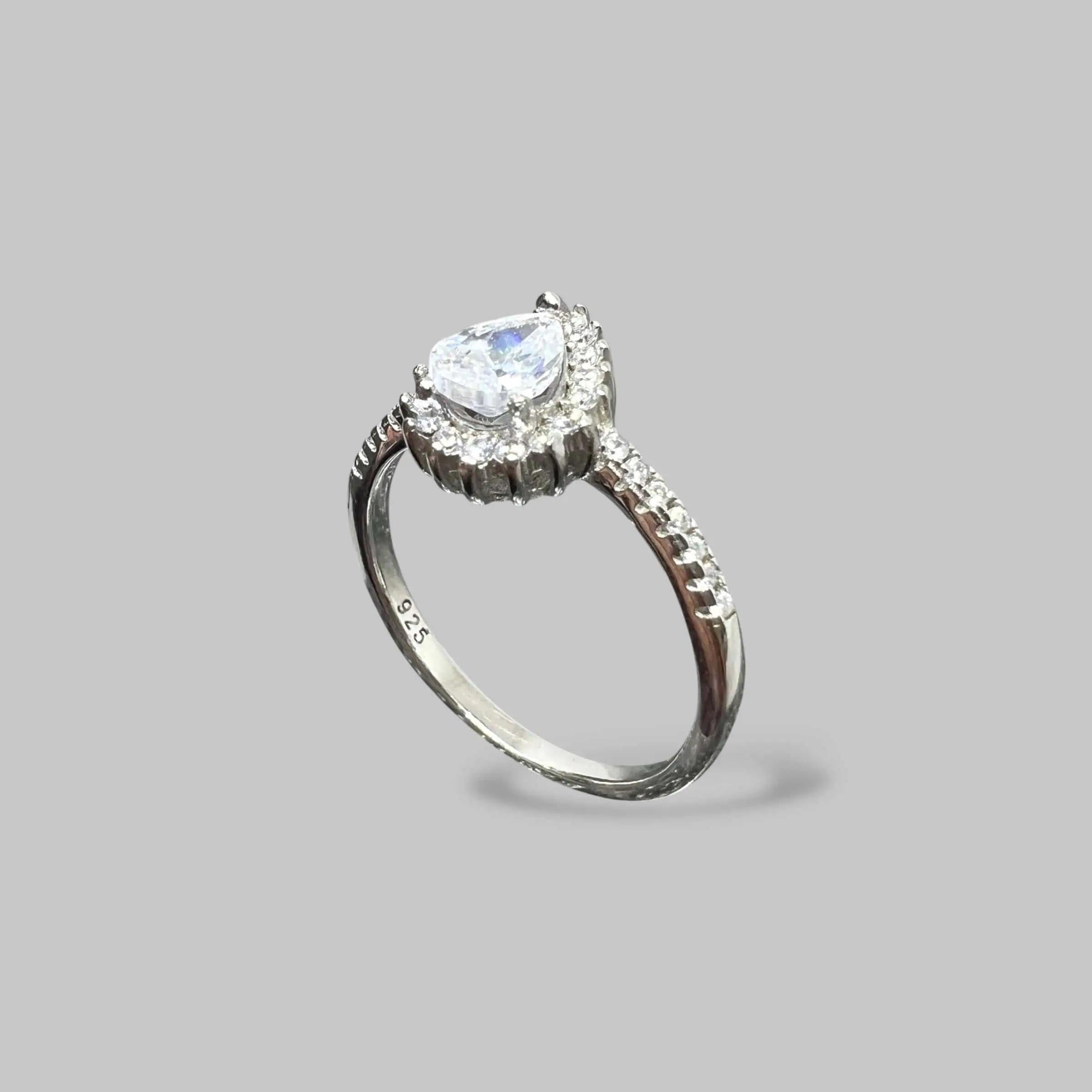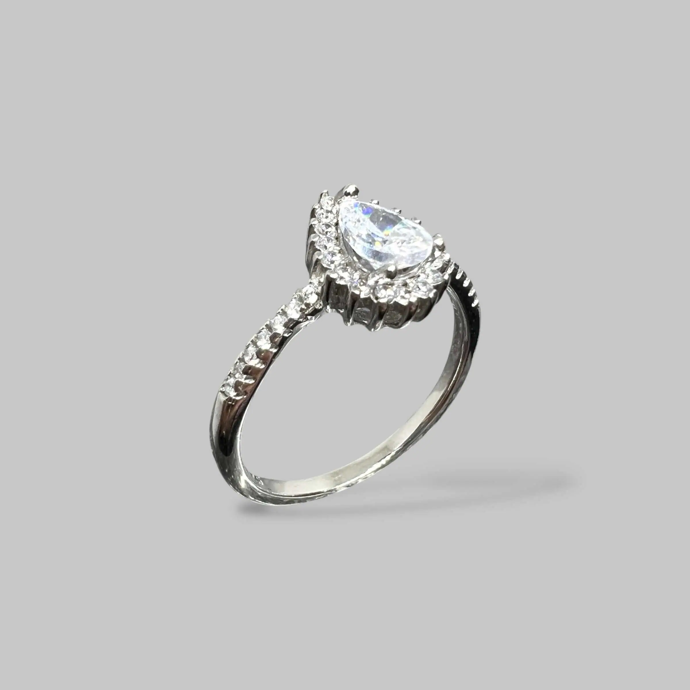 Вишукана срібна каблучка з великим фіанітом у формі краплі (груші). Центральний камінь оточений сяючим німбом, а тонка шинка прикрашена іскристими доріжками, що створює ефектний королівський образ.