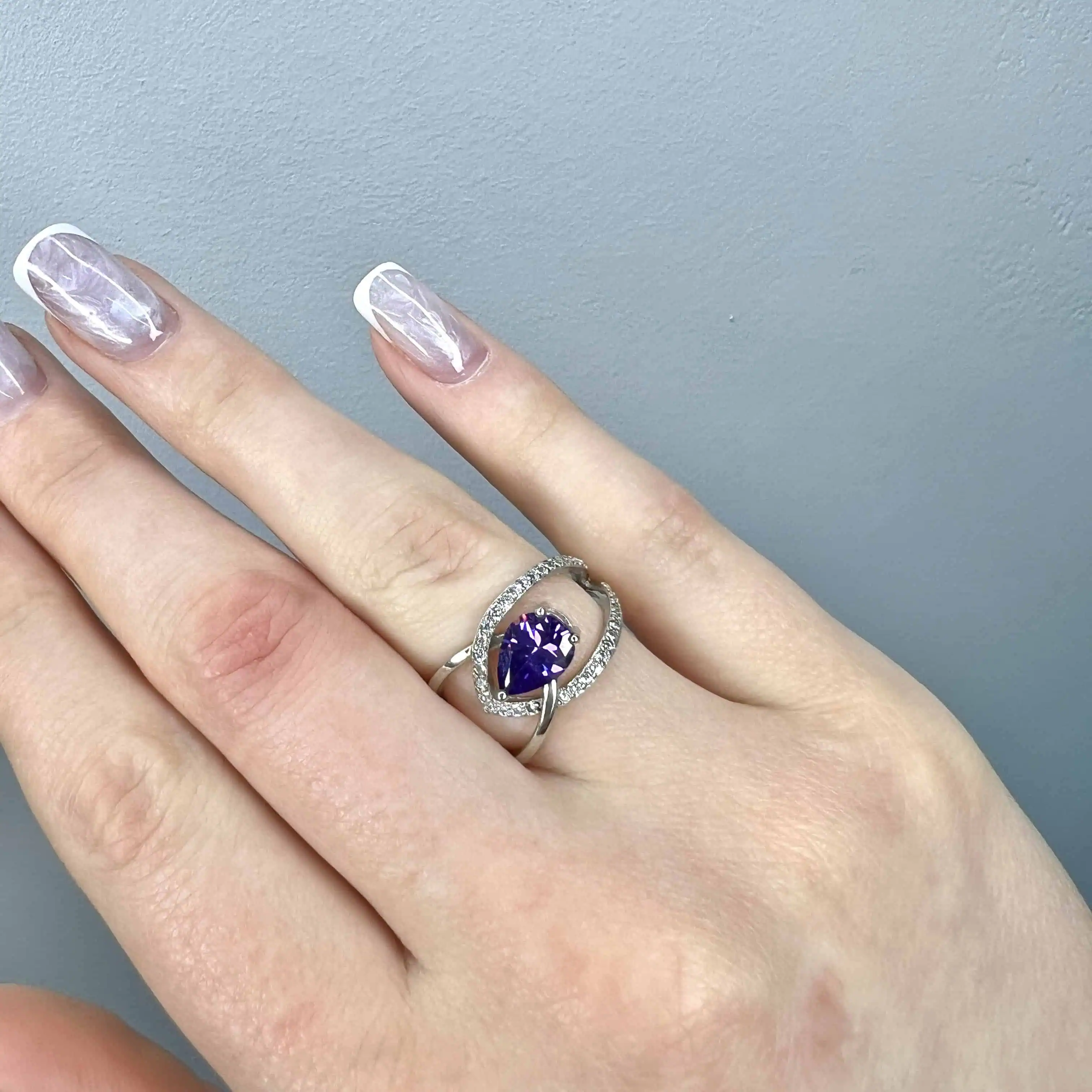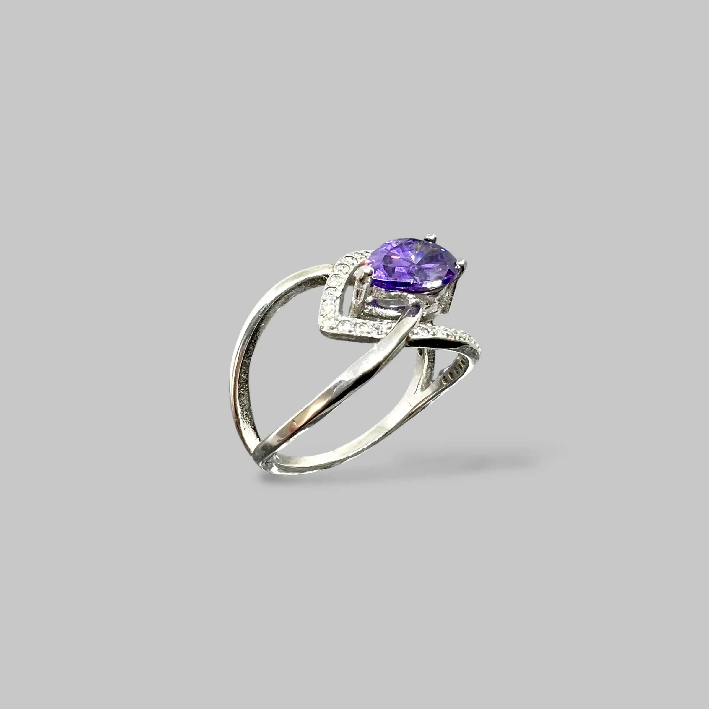 Ефектна срібна каблучка з фантазійною роздвоєною шинкою, що інкрустована доріжкою прозорих цирконів. Головною прикрасою є великий камінь насиченого фіолетового кольору у формі краплі, що додає образу витонченості та яскравості.
