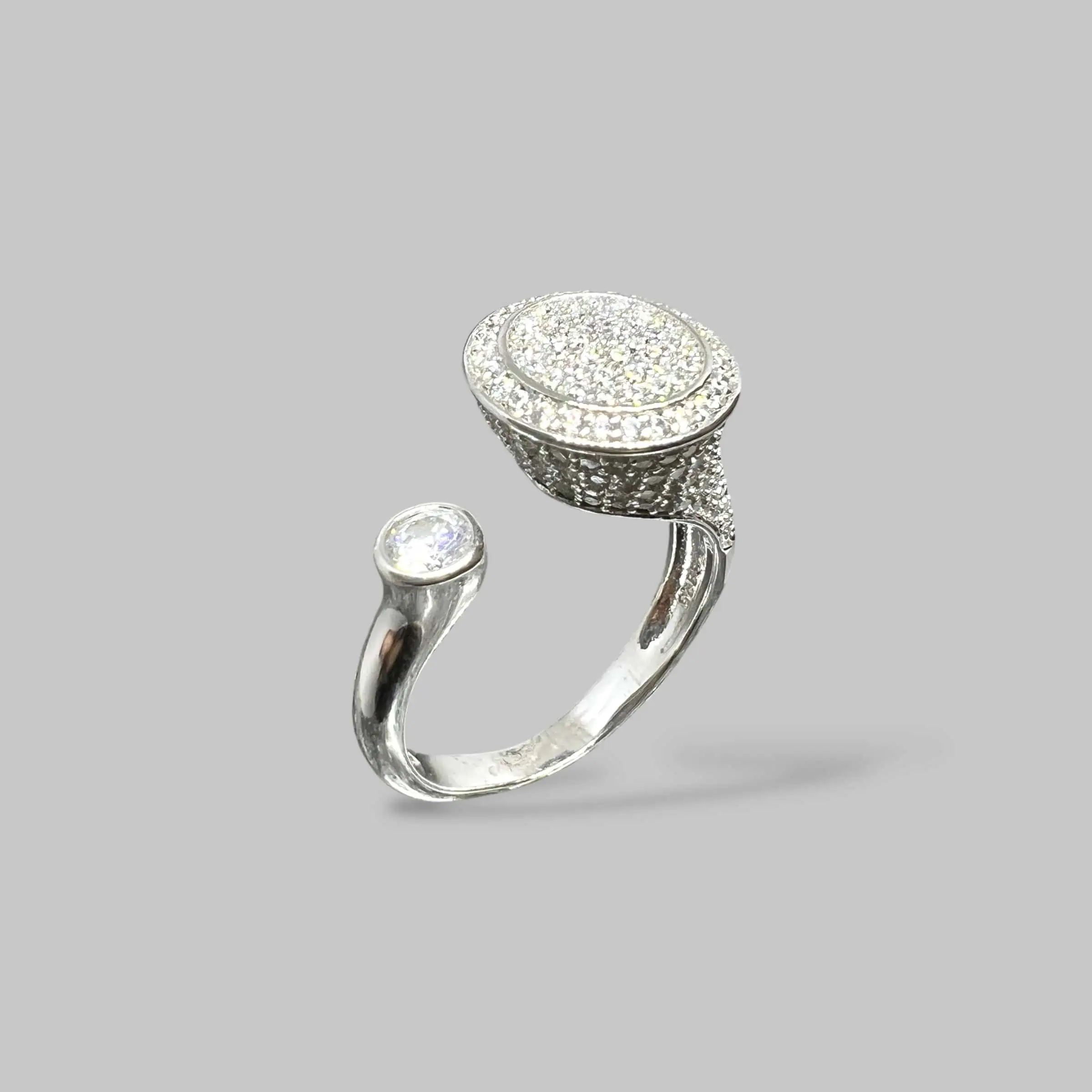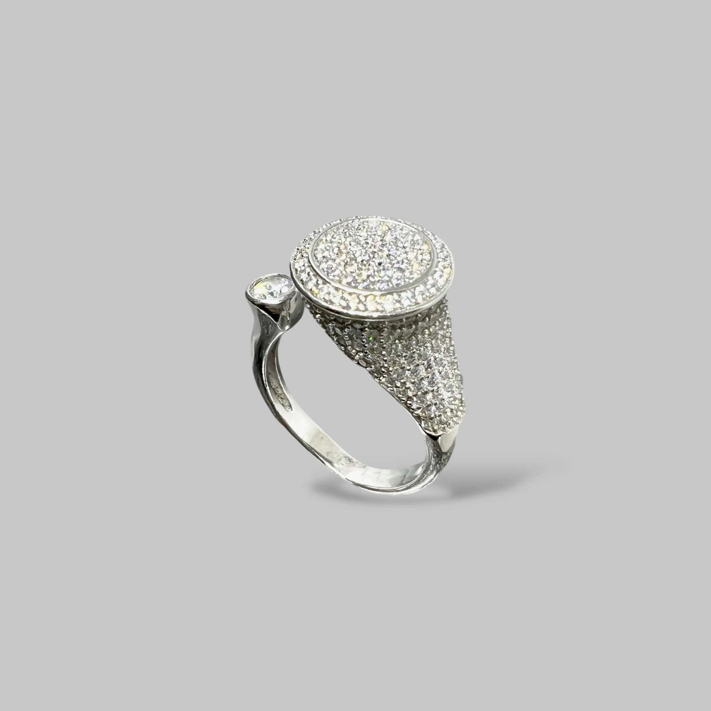 Масивна срібна каблука у формі печатки, що вражає своєю ювелірною роботою: верхня плашка та бічні грані повністю вкриті щільним паве з цирконів.