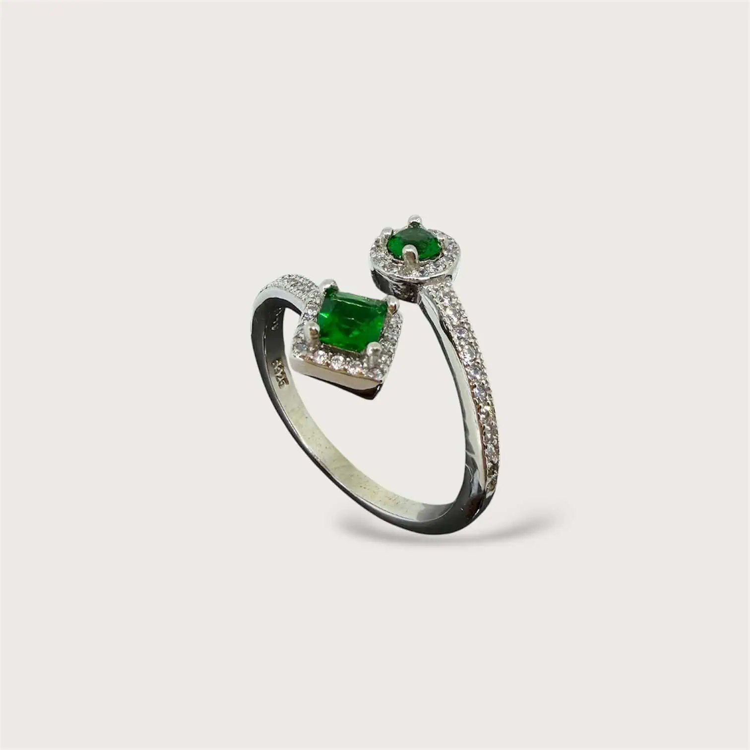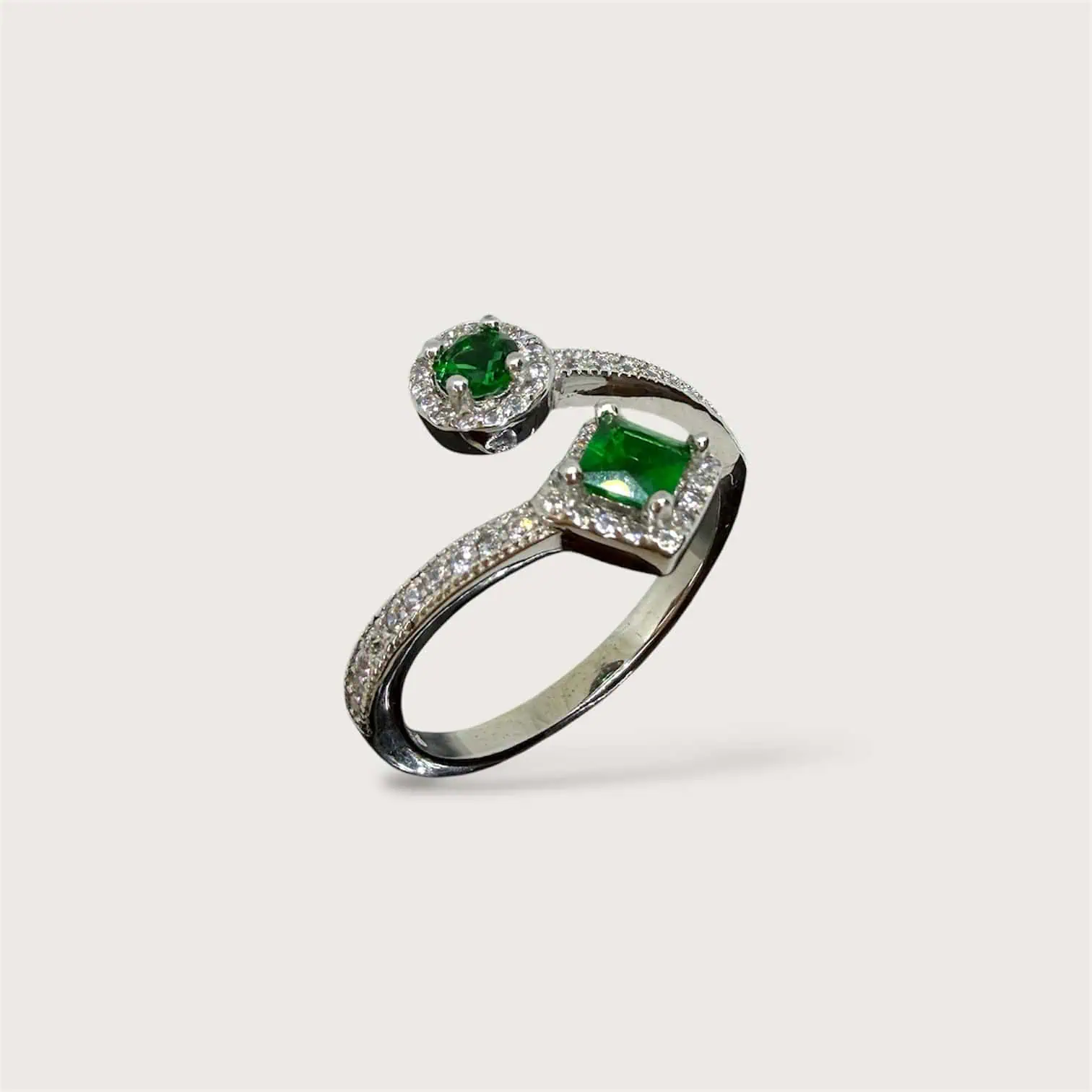 Срібна каблучка "Геометрія" - це ніжна прикраса, з яскравими зеленими цирконами. Каблучка покрита родієм для блиску та стійкості від зносу.