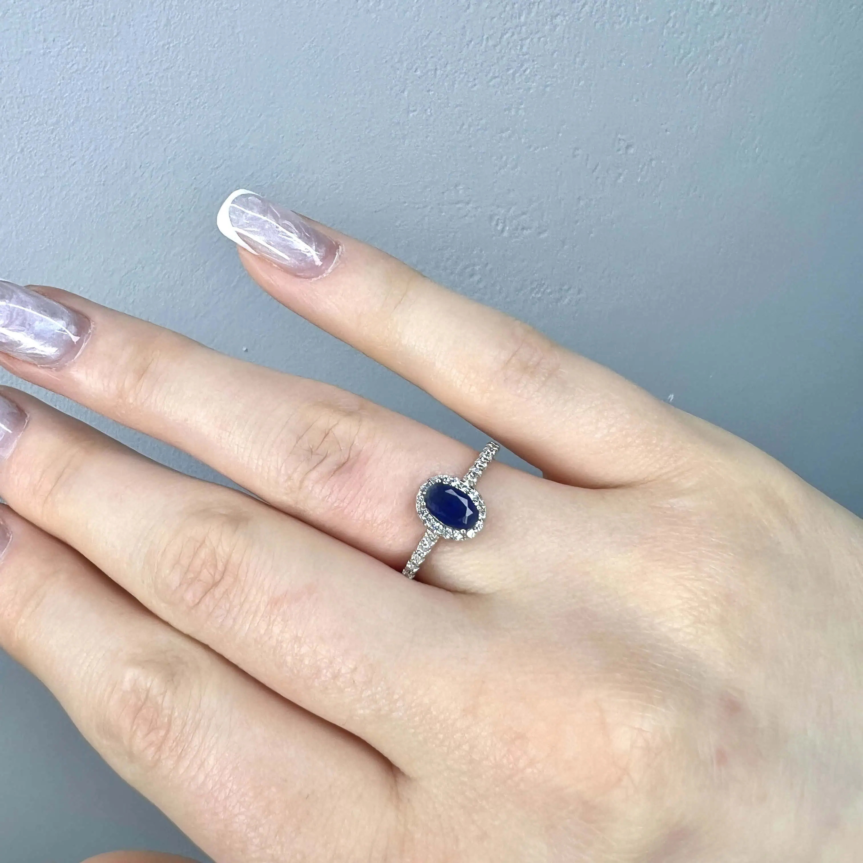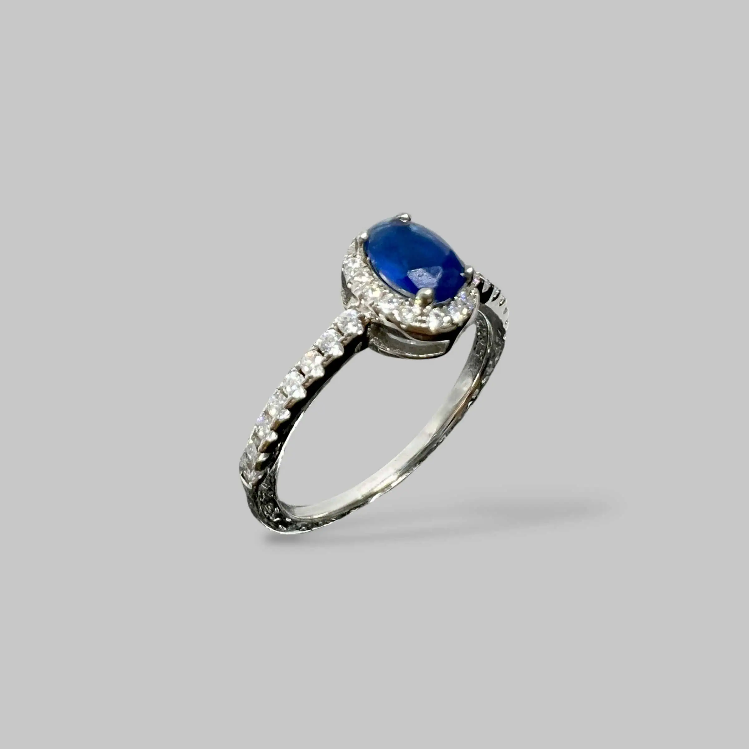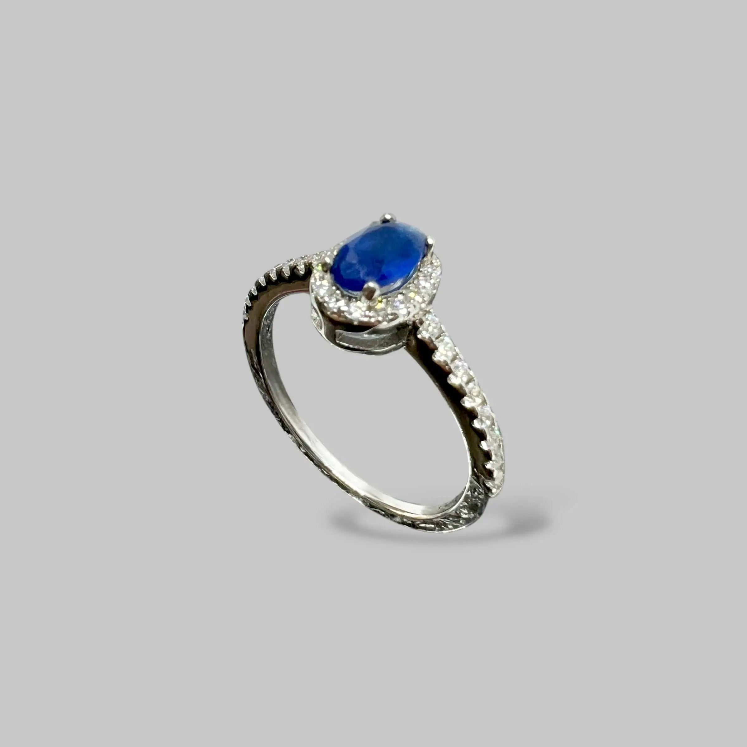 Елегантна срібна каблучка з центральним овальним каменем глибокого синього кольору. Вишуканий ореол та шинка прикраси інкрустовані дрібними прозорими кристалами, що створюють розкішний контраст та підкреслюють благородний відтінок вставки.