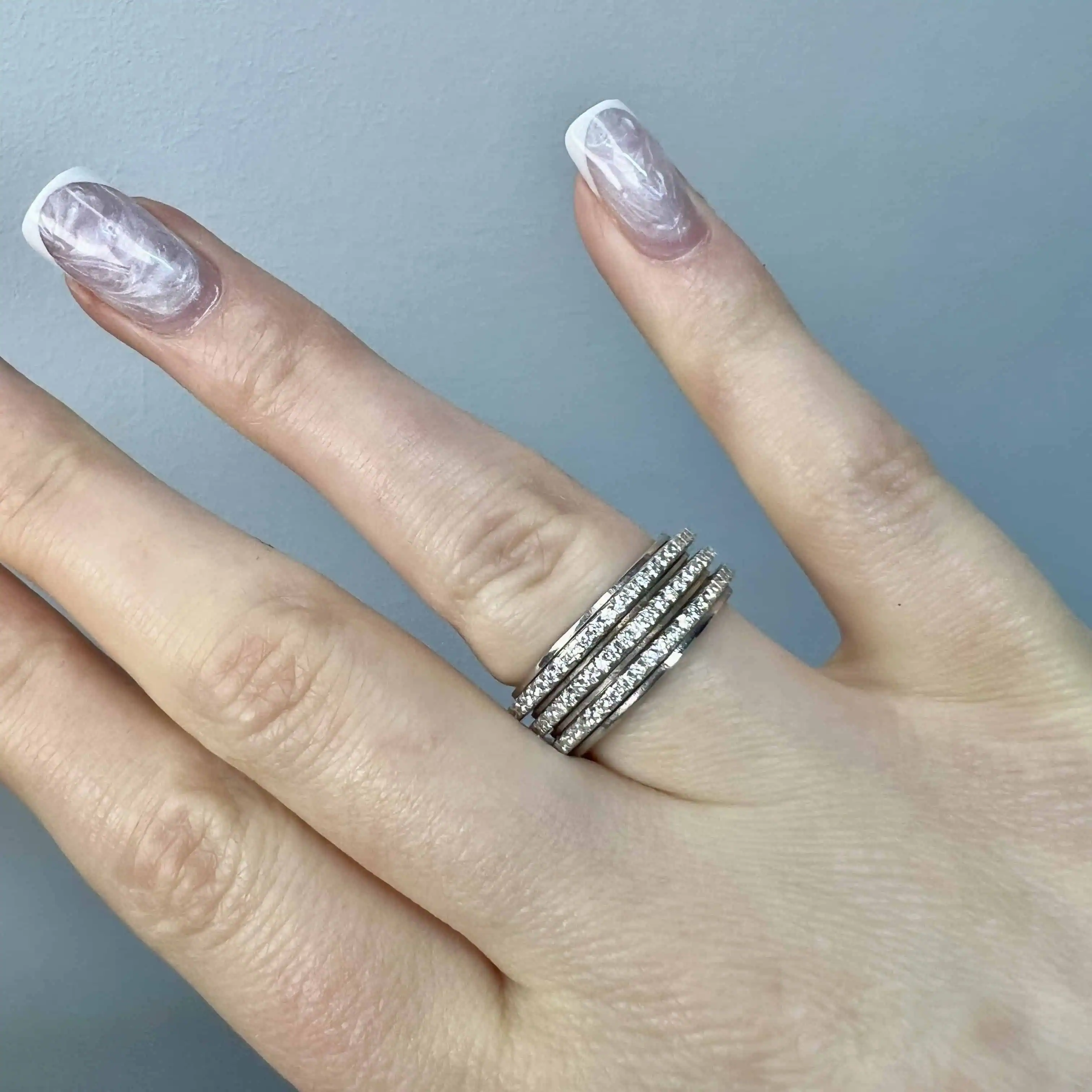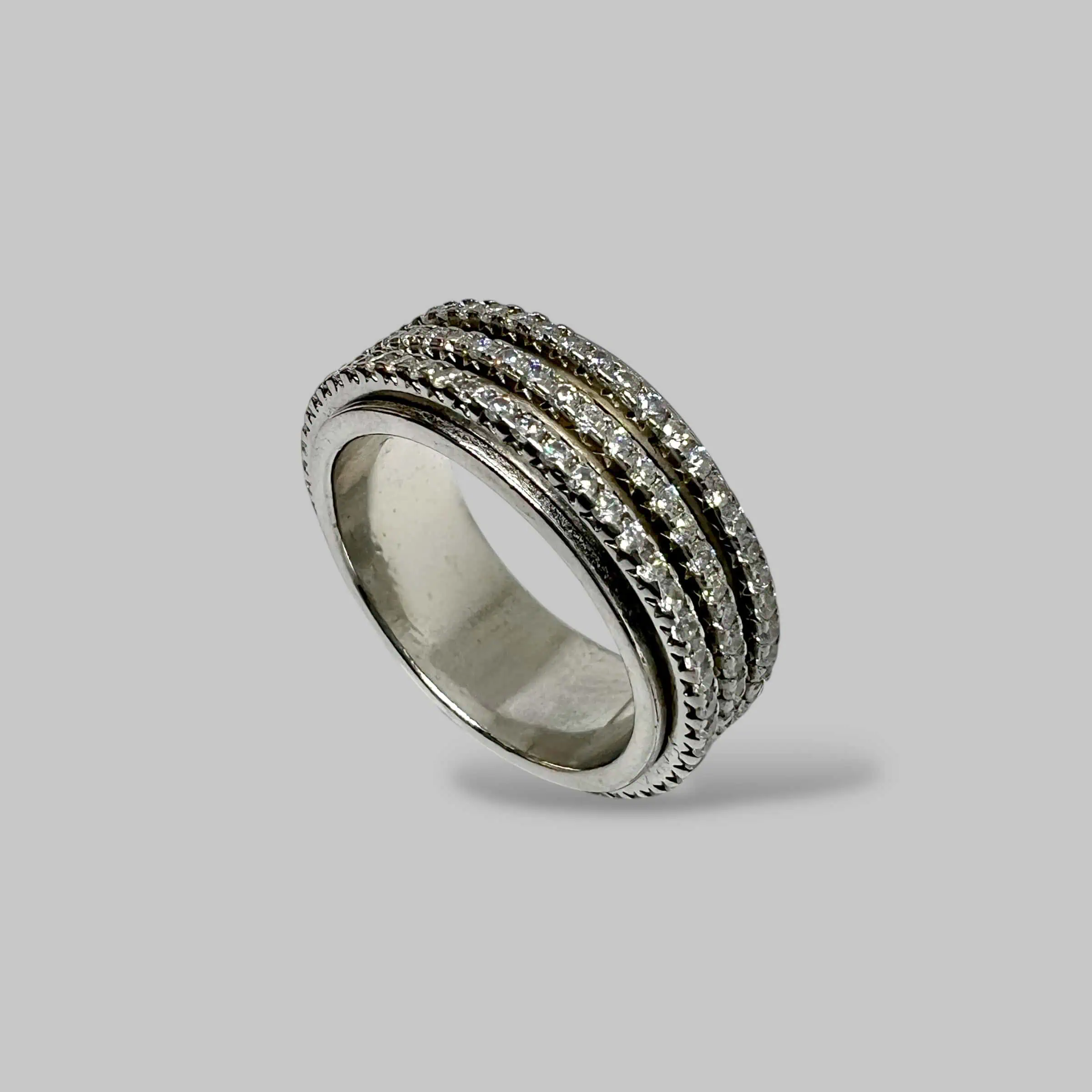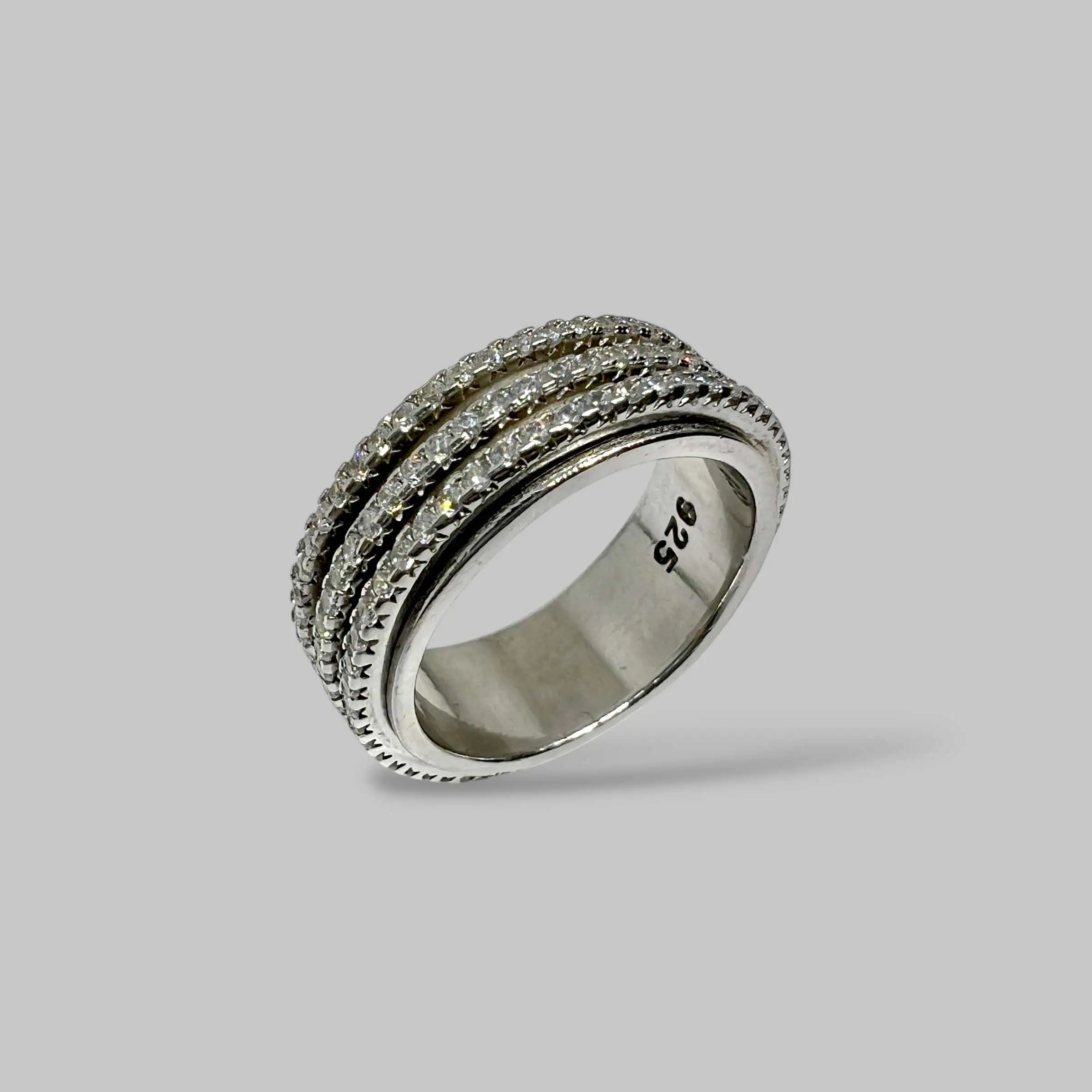 Оригінальна срібна каблучка, особливістю якої є три рухливі доріжки, густо інкрустовані сяючими білими цирконами.