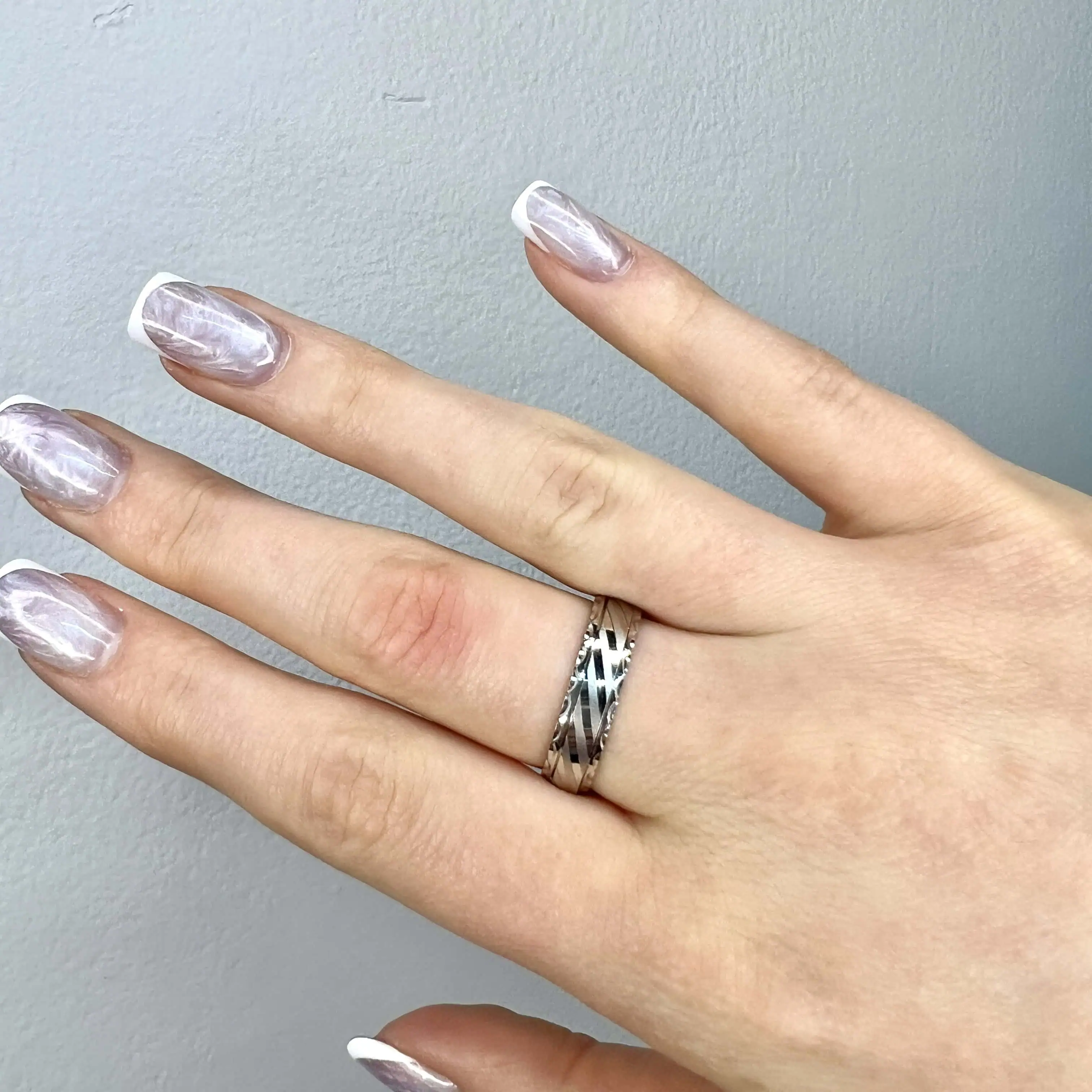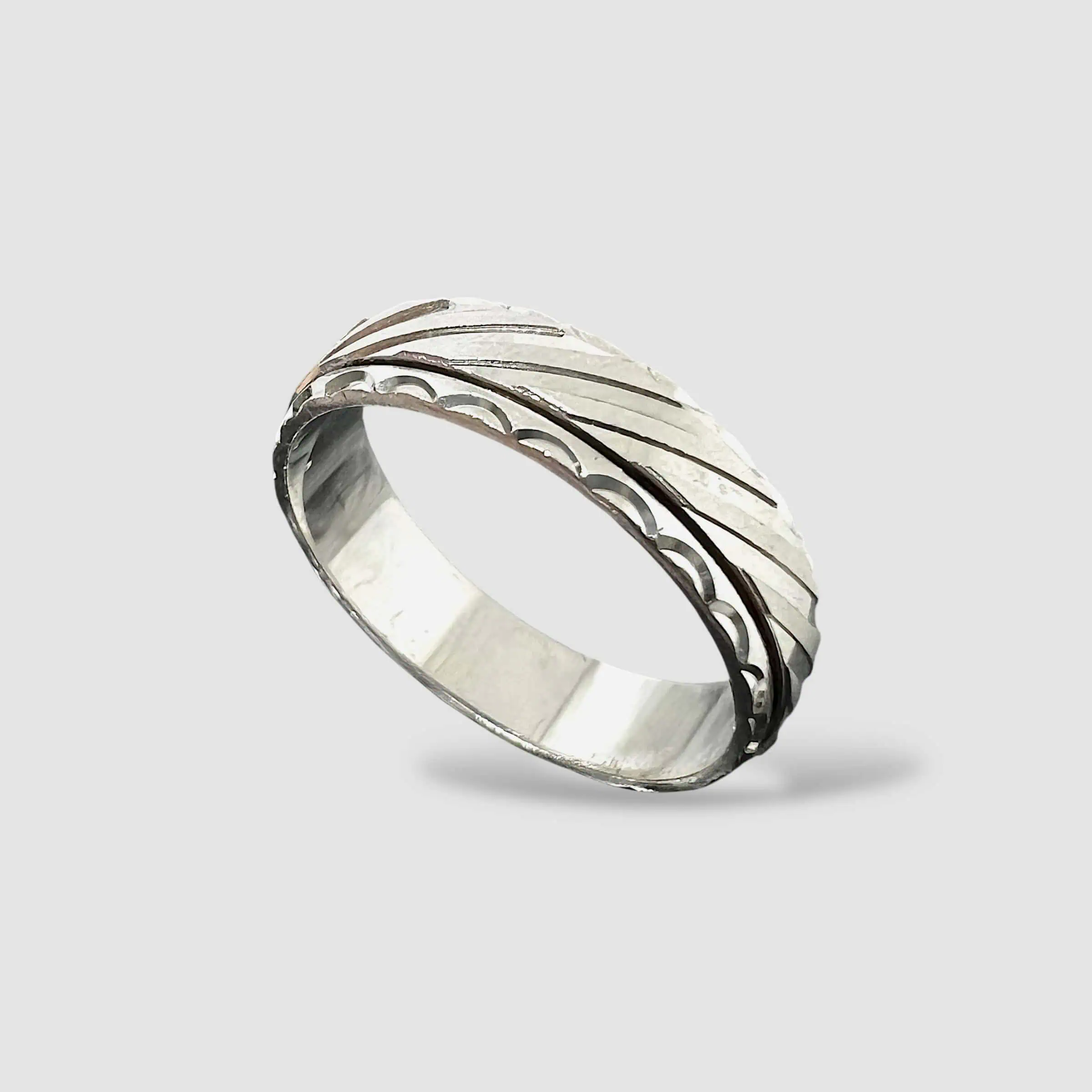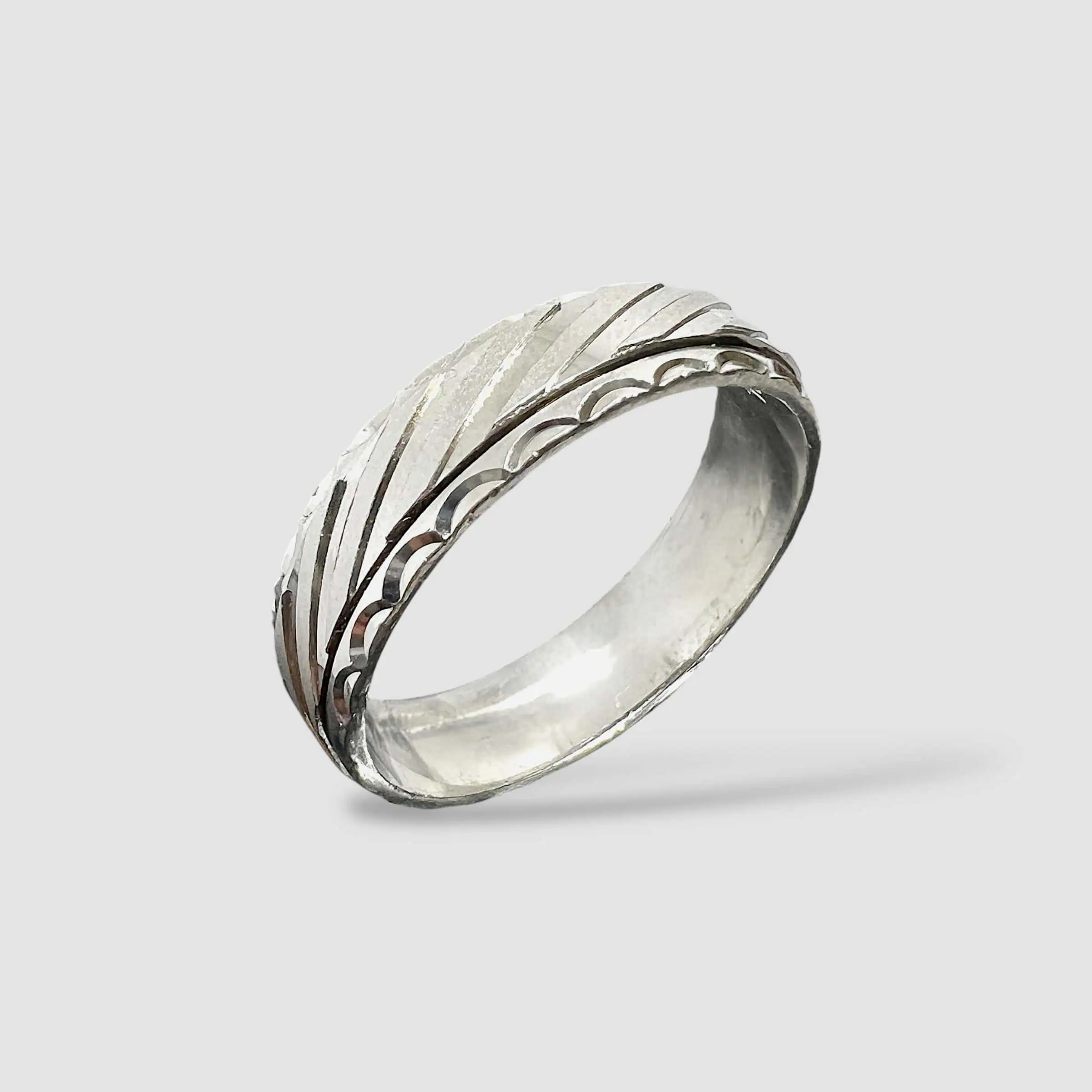 Стильна каблучка з лаконічним геометричним дизайном. Поверхня прикрашена алмазним гравіюванням у вигляді діагональних ліній, що створюють динамічний візерунок та цікаву гру світла.