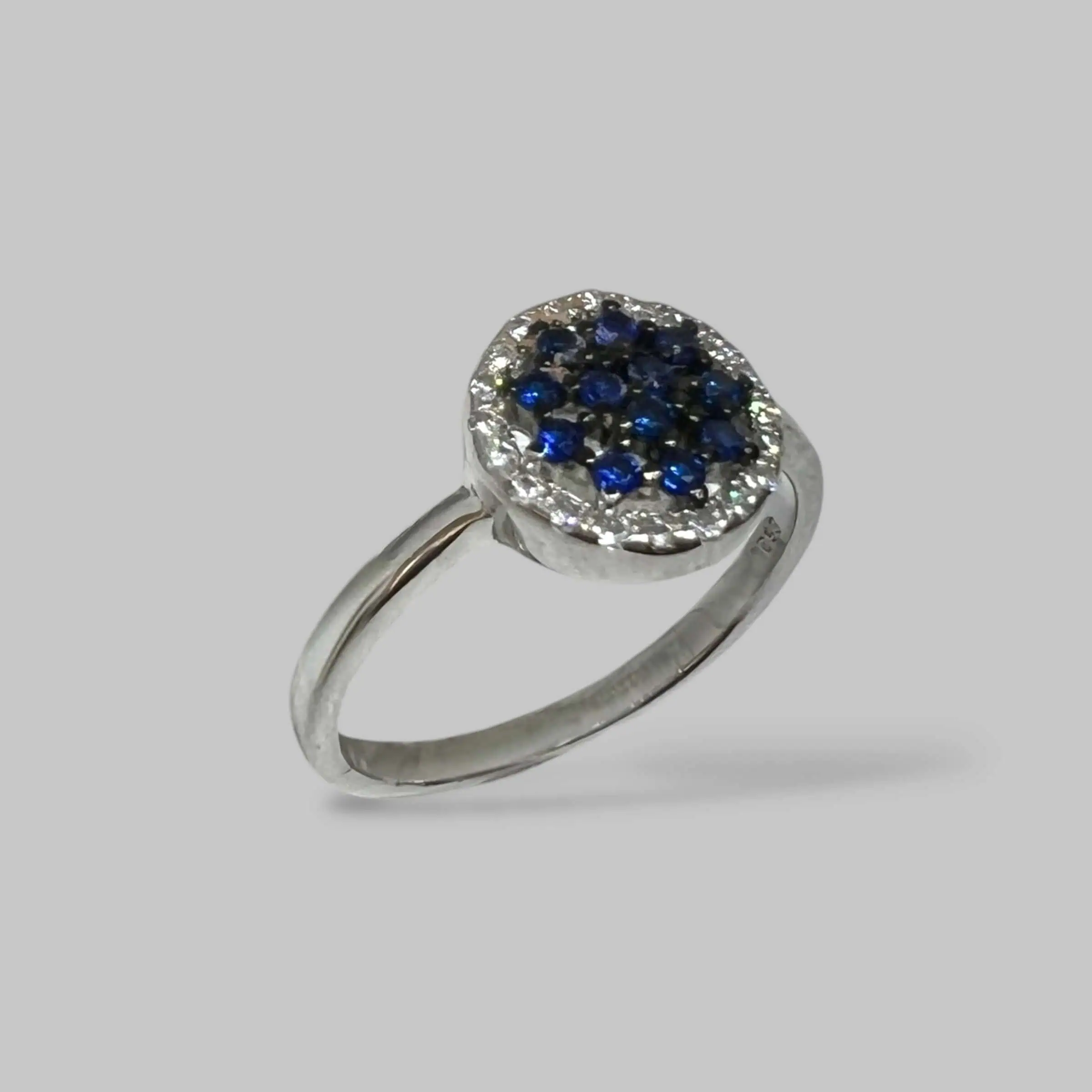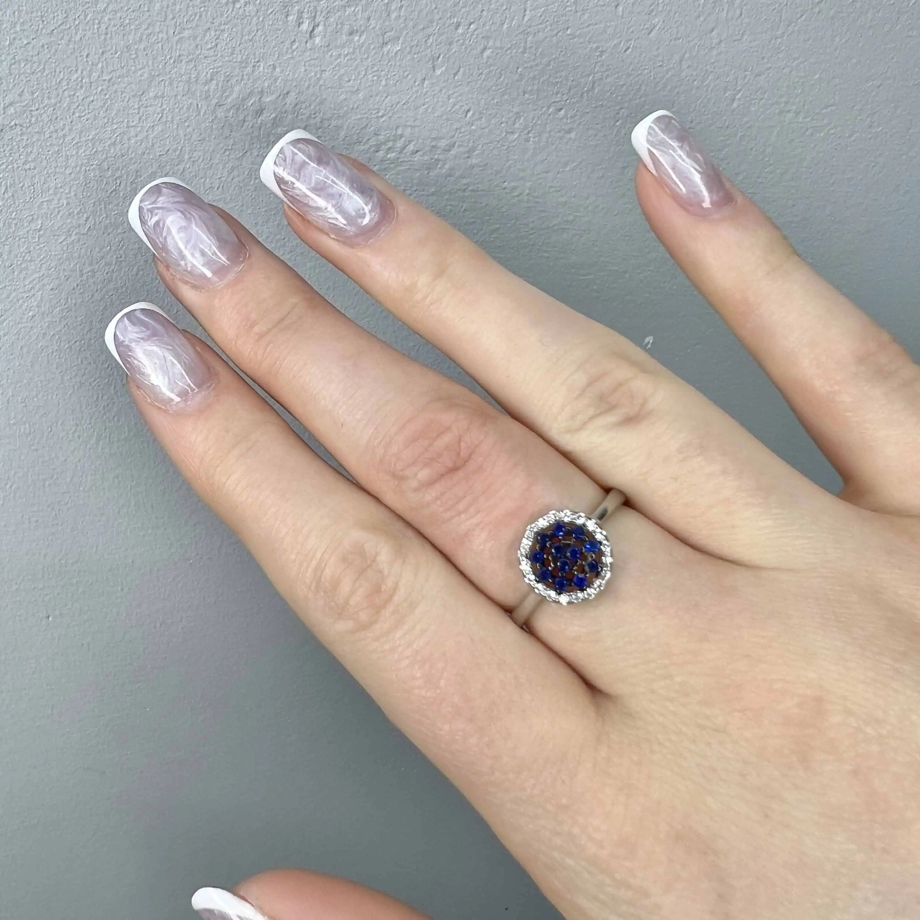 Ефектна срібна каблучка-доріжка, центральну частину якої прикрашає розсип дрібних синіх цирконів. Насичену кольорову смугу обрамляють з обох боків дві паралельні лінії прозорих кристалів, що підсилюють блиск та створюють витончений контраст.