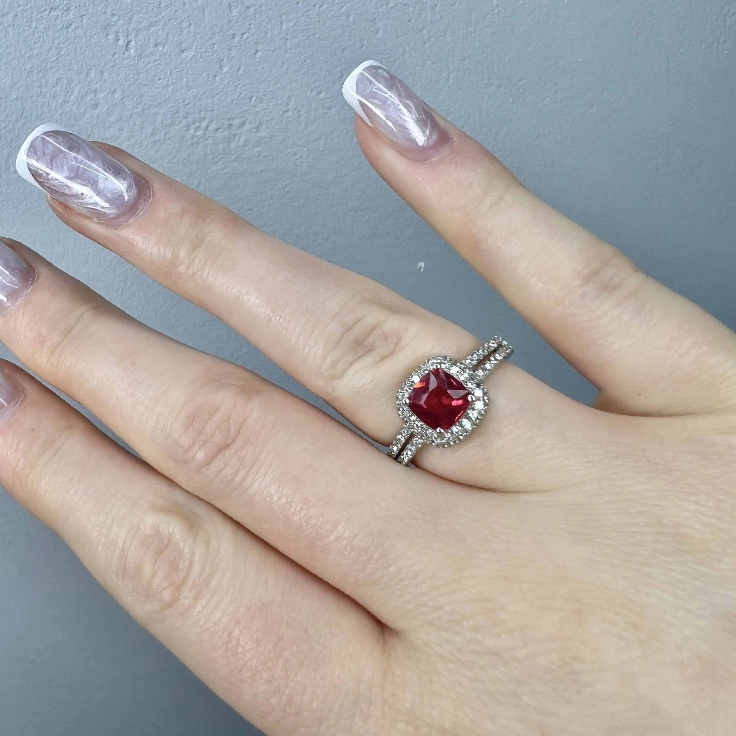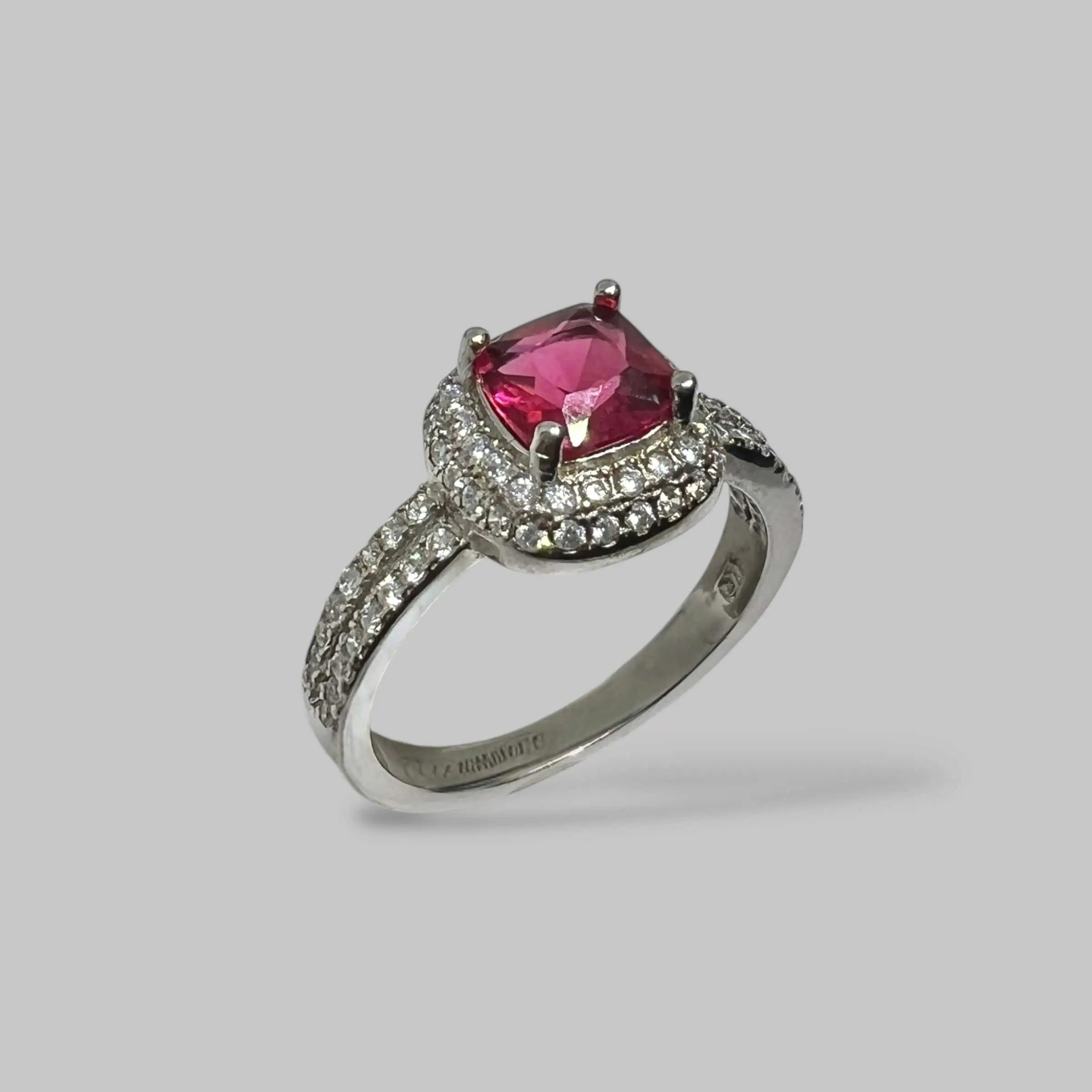 Розкішна срібна каблучка з великим центральним цирконом насиченого червоного кольору у формі квадрата. Сліпуче гало з білих цирконів навколо головного каменя та подвійна доріжка кристалів на шинці створюють неймовірний блиск.