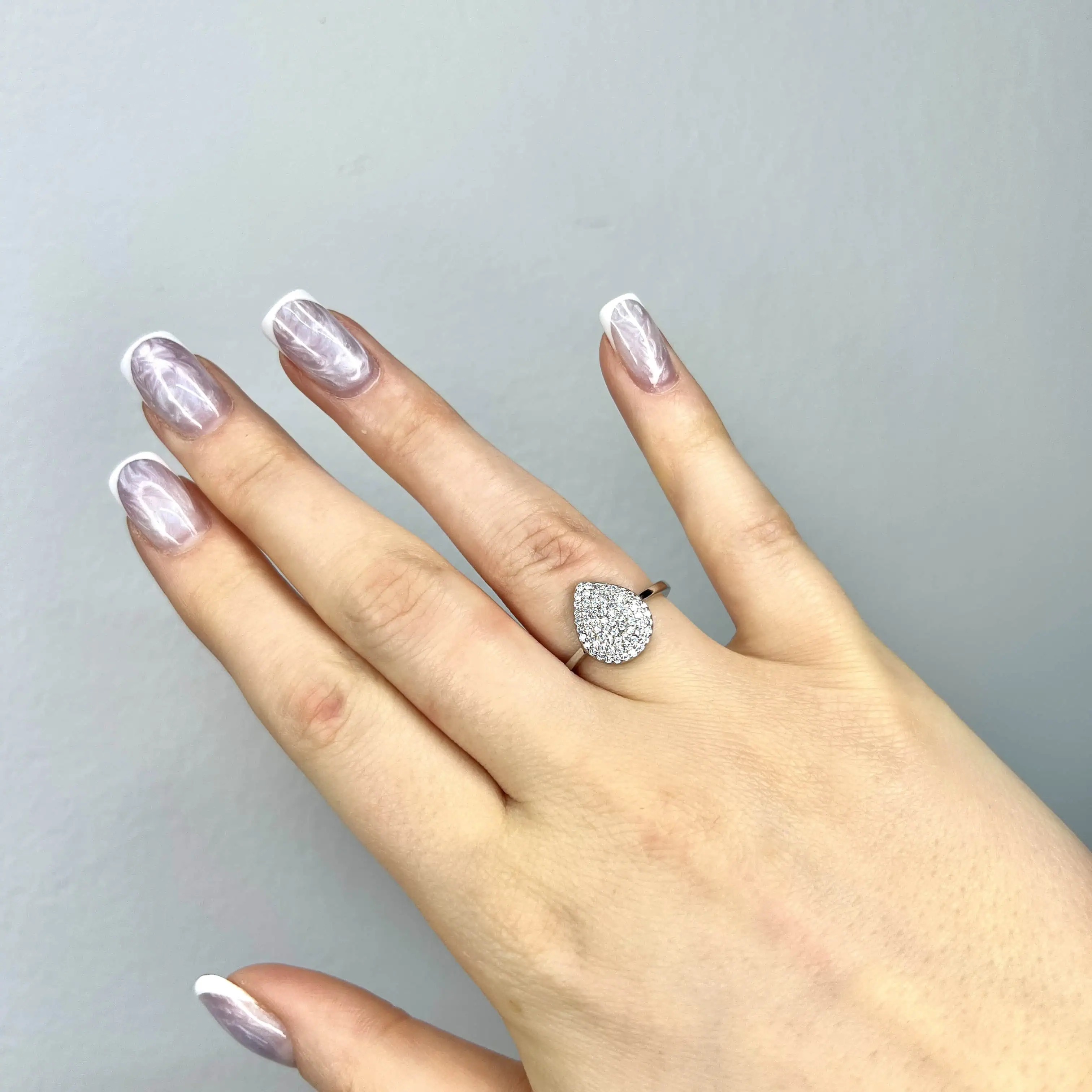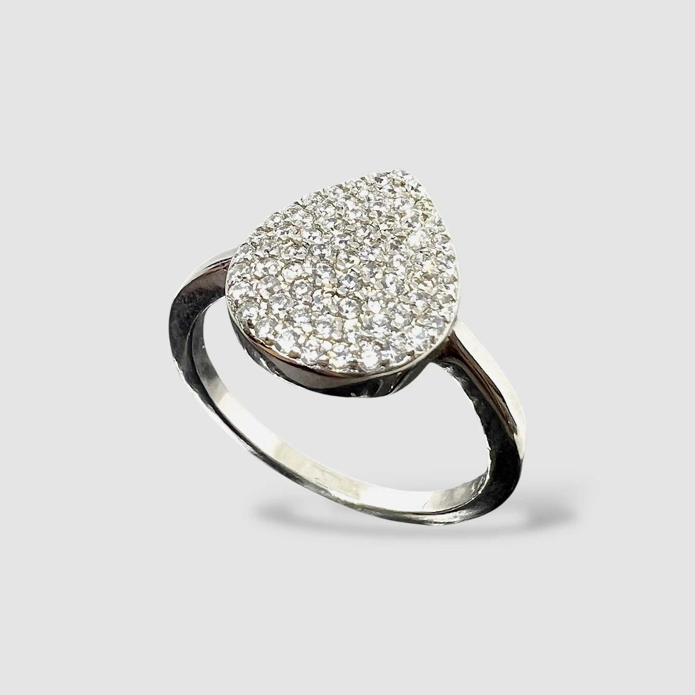 Елегантна срібна каблучка 925 проби з центральним елементом у формі об'ємної краплі. Поверхня виробу густо інкрустована дрібними каменями, що створює ефект безперервного мерехтіння та додає образу ніжності.