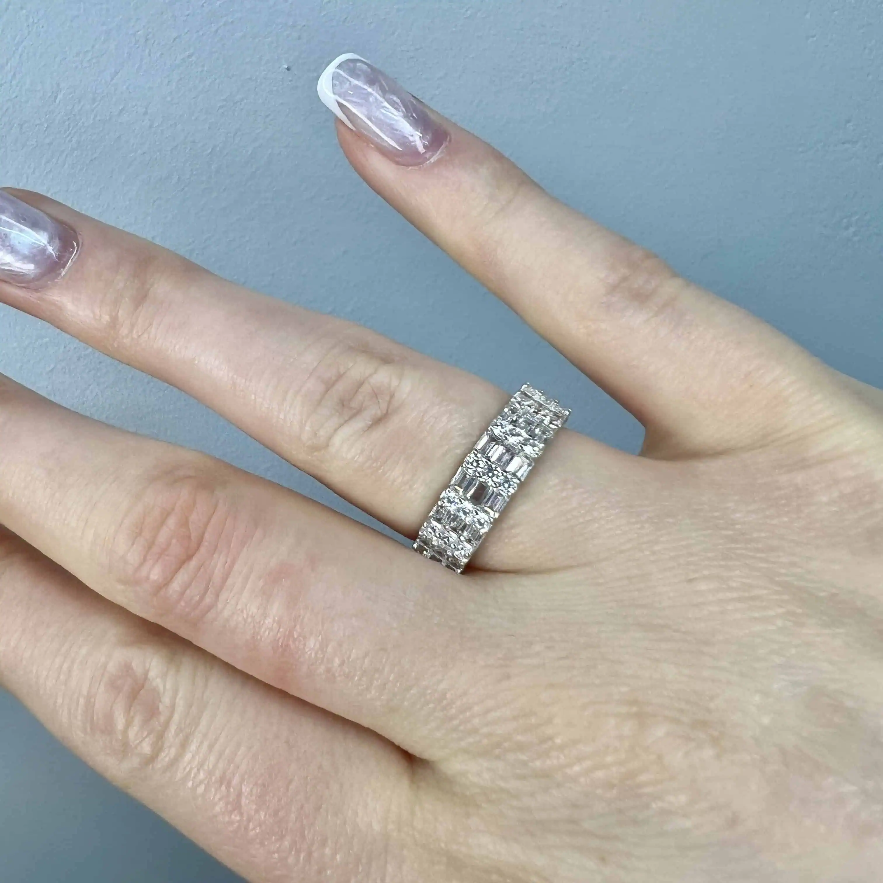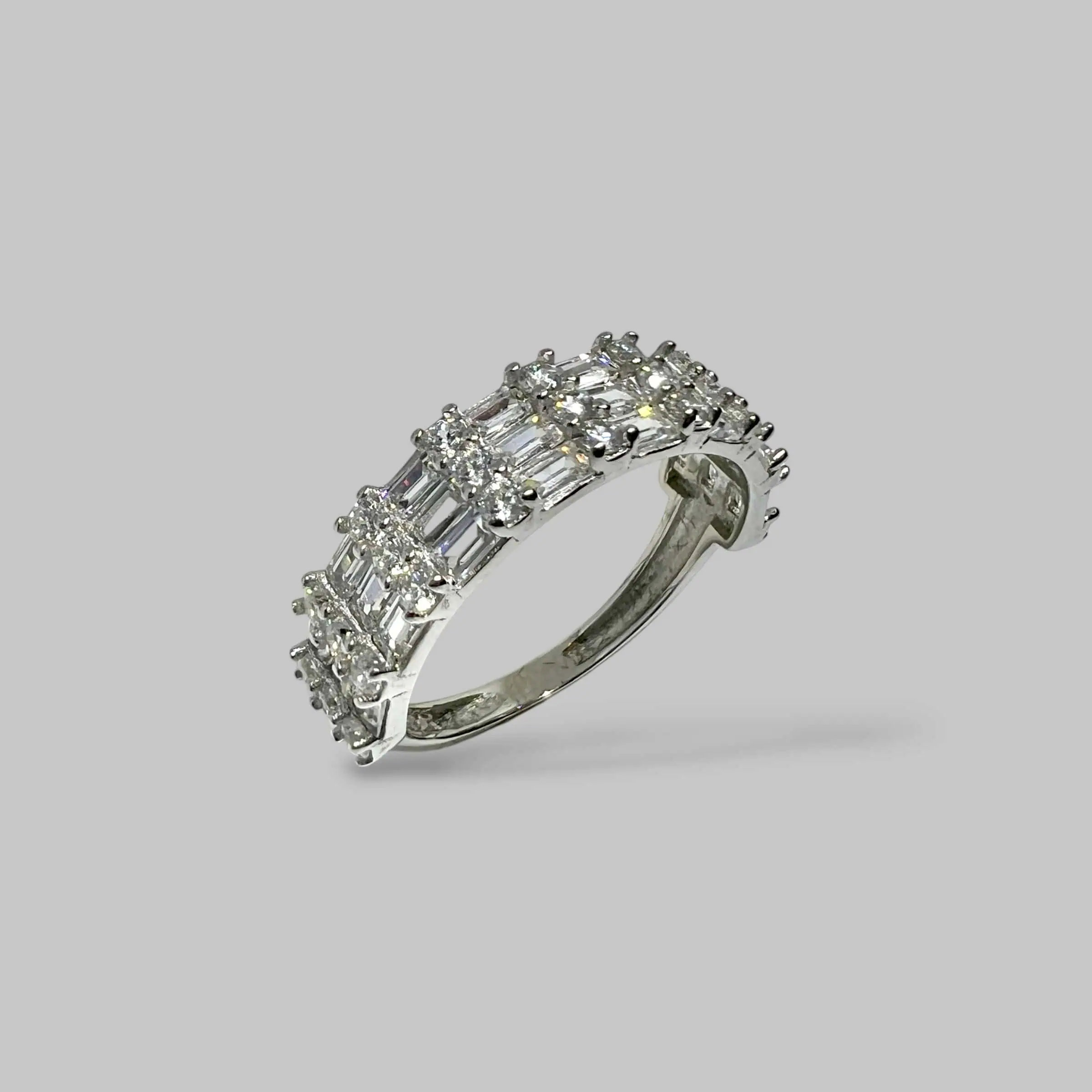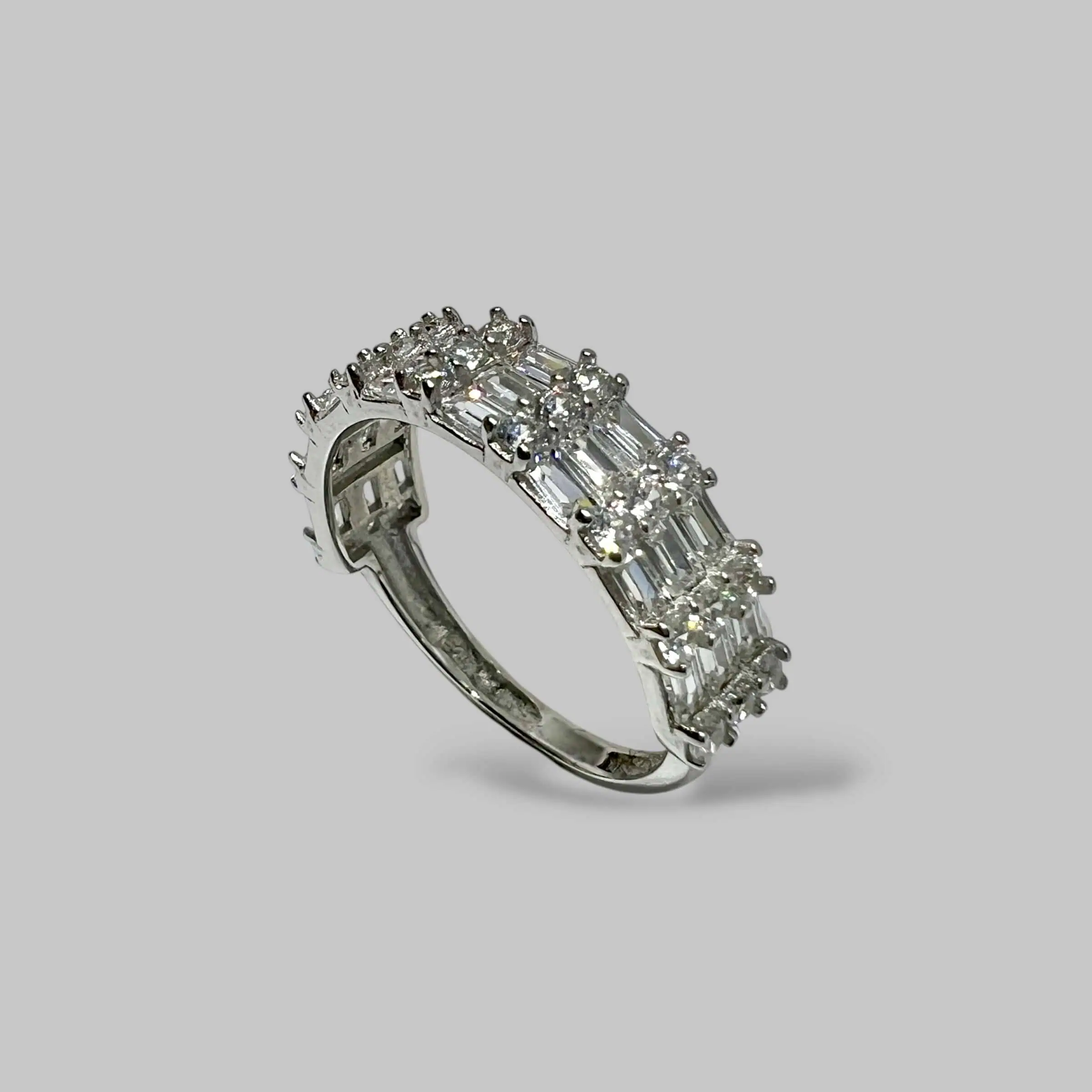 Стильна срібна каблучка з комбінованою інкрустацією білими цирконами. Центральна доріжка з великих квадратних каменів обрамлена рядами дрібних круглих кристалів, що створює багаторівневий блиск і робить дизайн стриманим, але неймовірно витонченим.