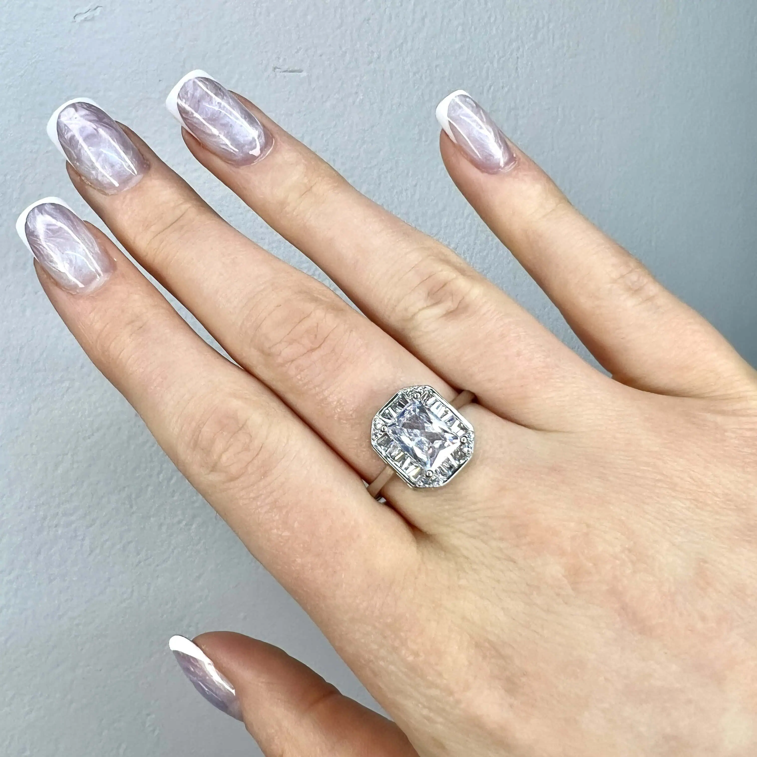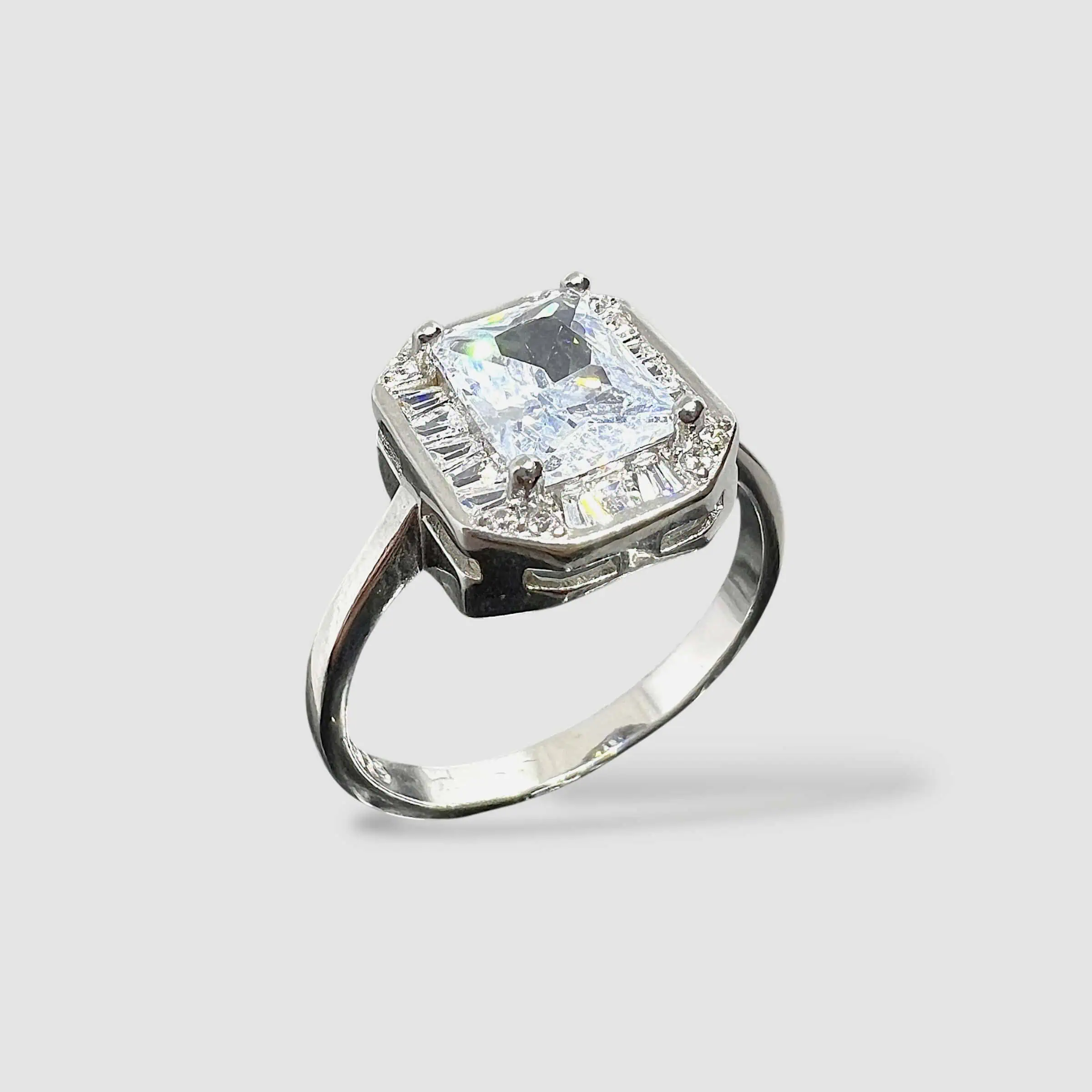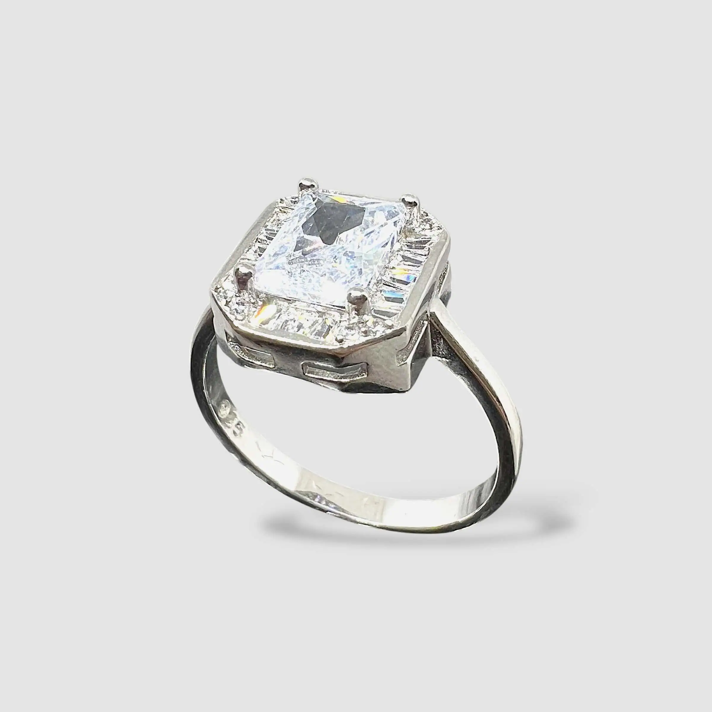 Вишукана каблучка з великим центральним каменем. Прямокутна форма та складна інкрустація навколо додають прикрасі вигляду вінтажної розкоші.