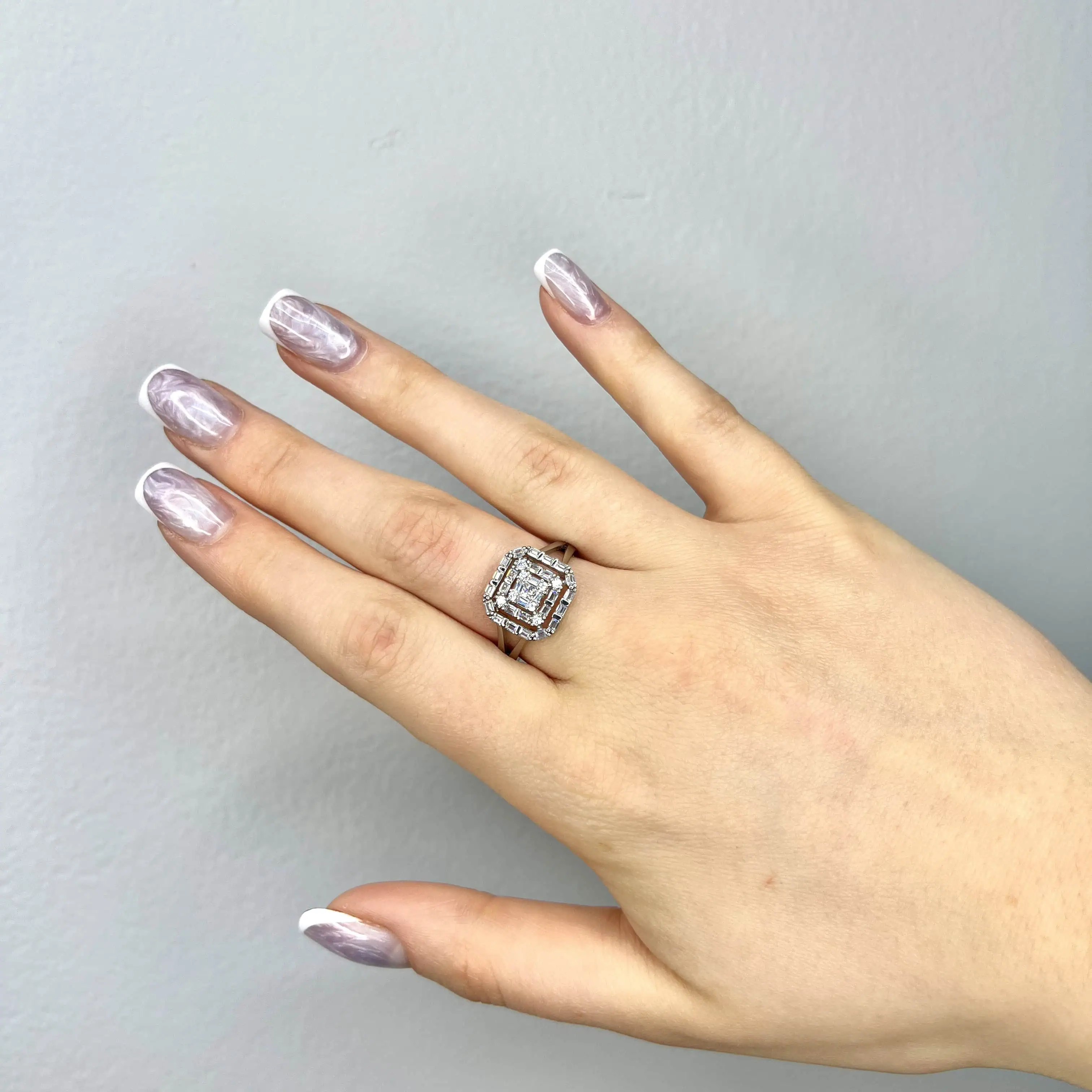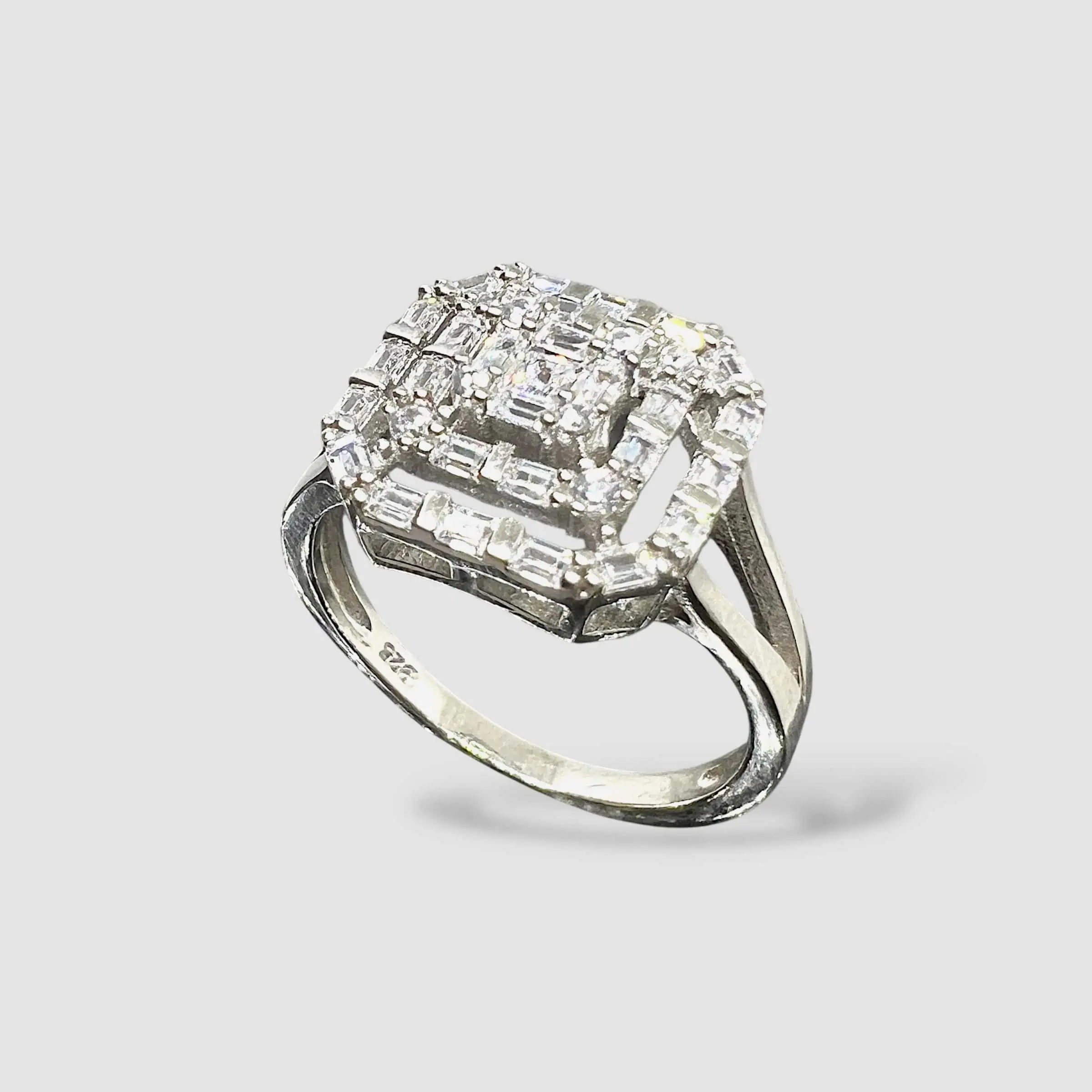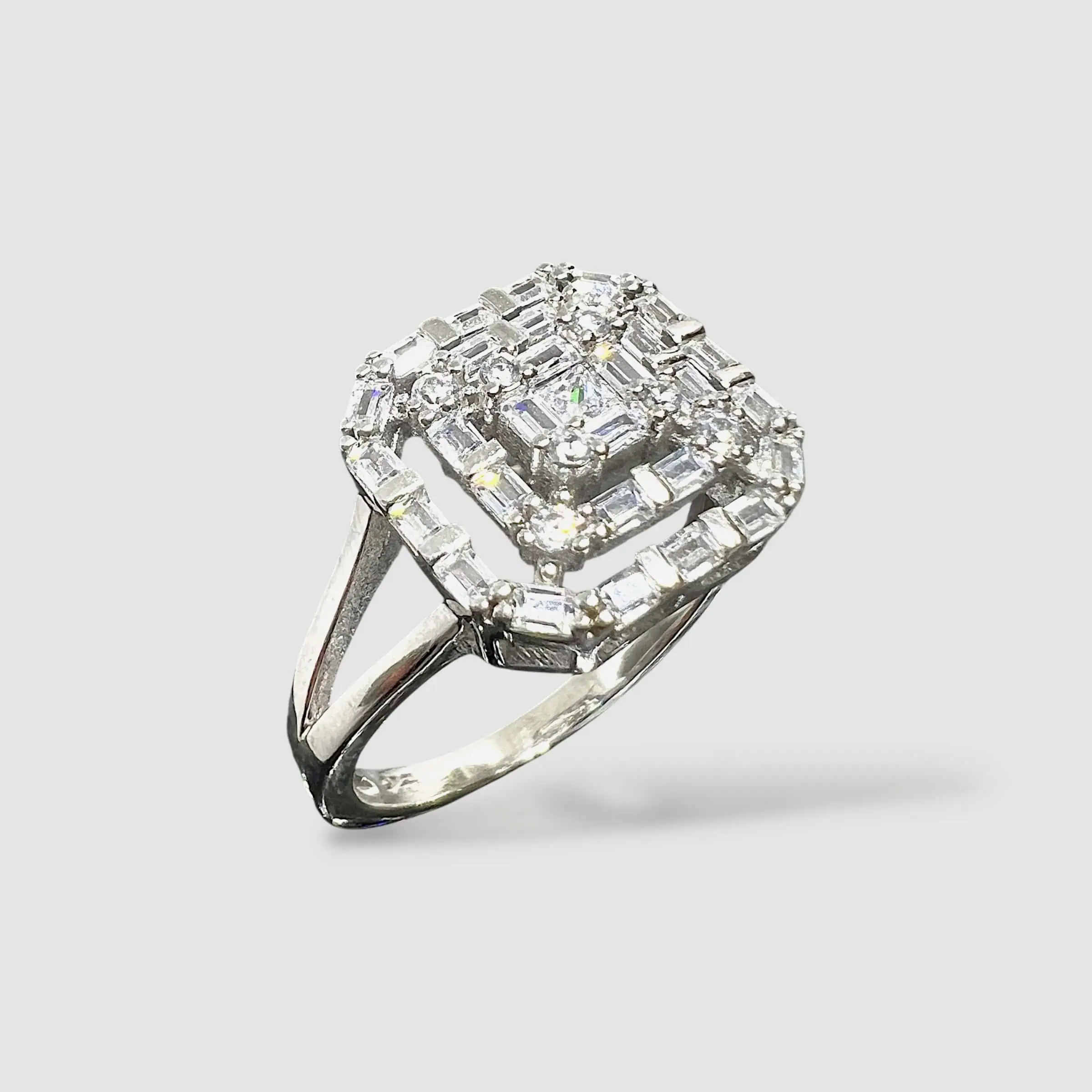 Стильна срібна каблучка 925 проби з багаторівневим квадратним кастом. Дизайн поєднує строгі геометричні лінії з роздвоєною шинкою, що додає прикрасі сучасного вигляду та об'єму.