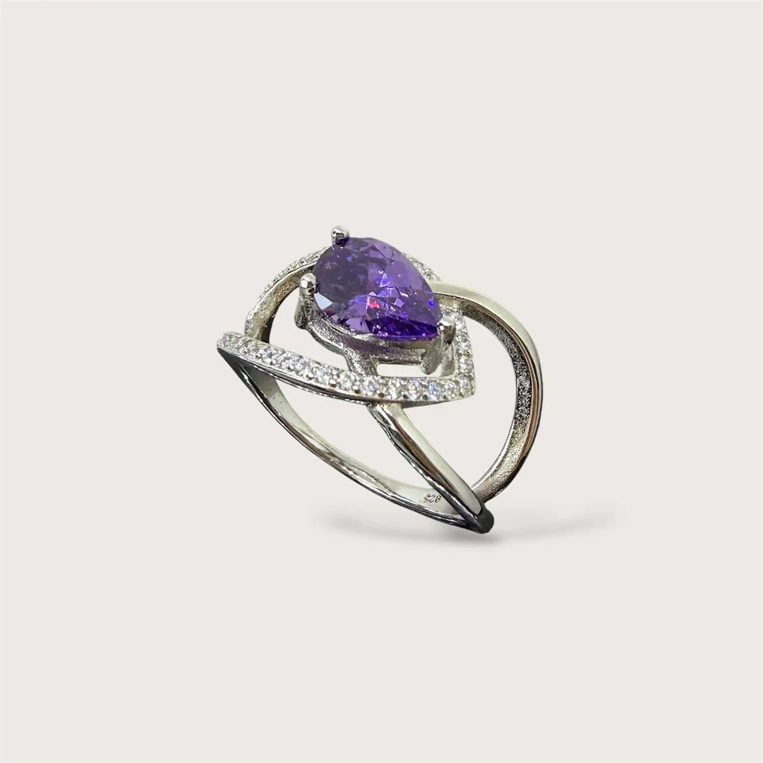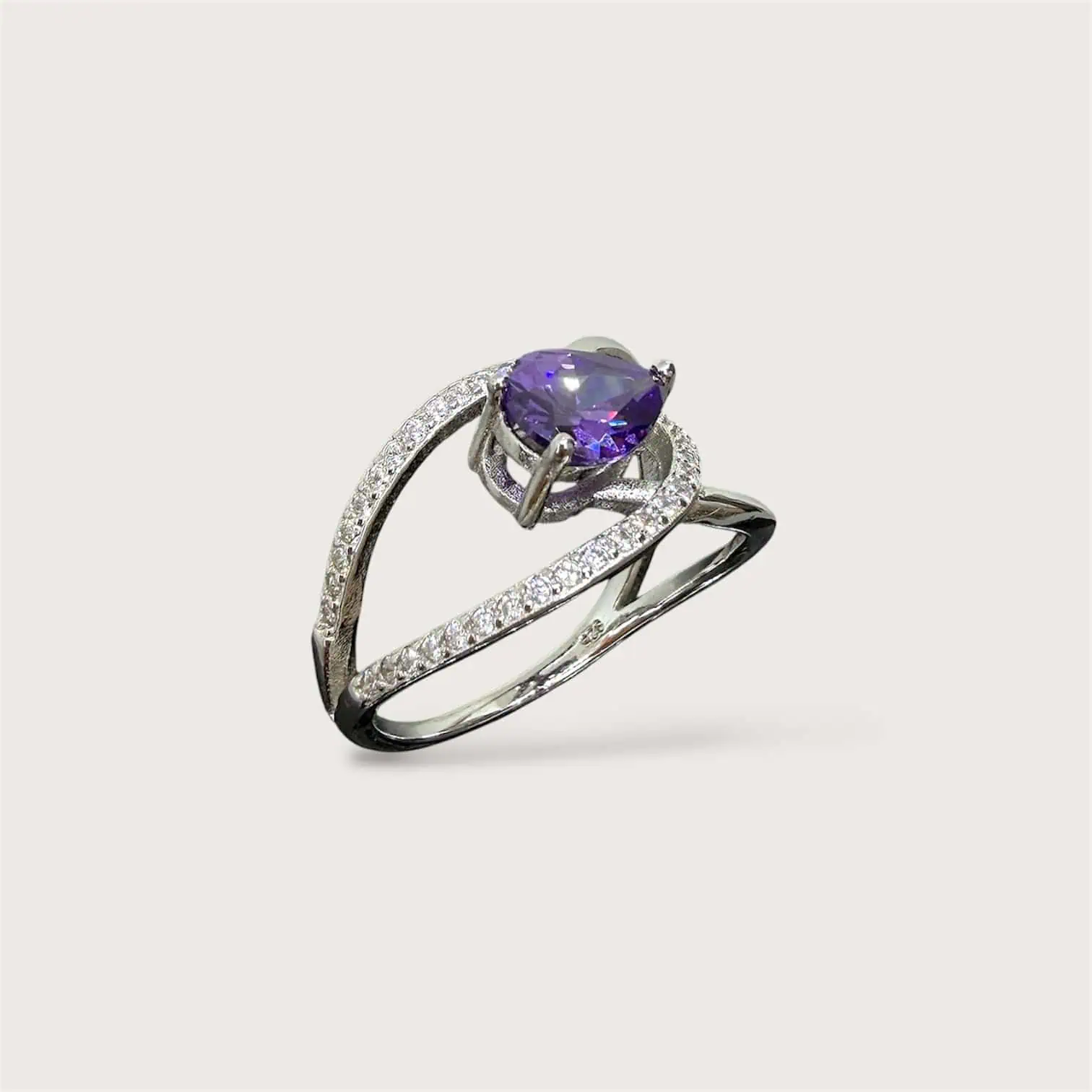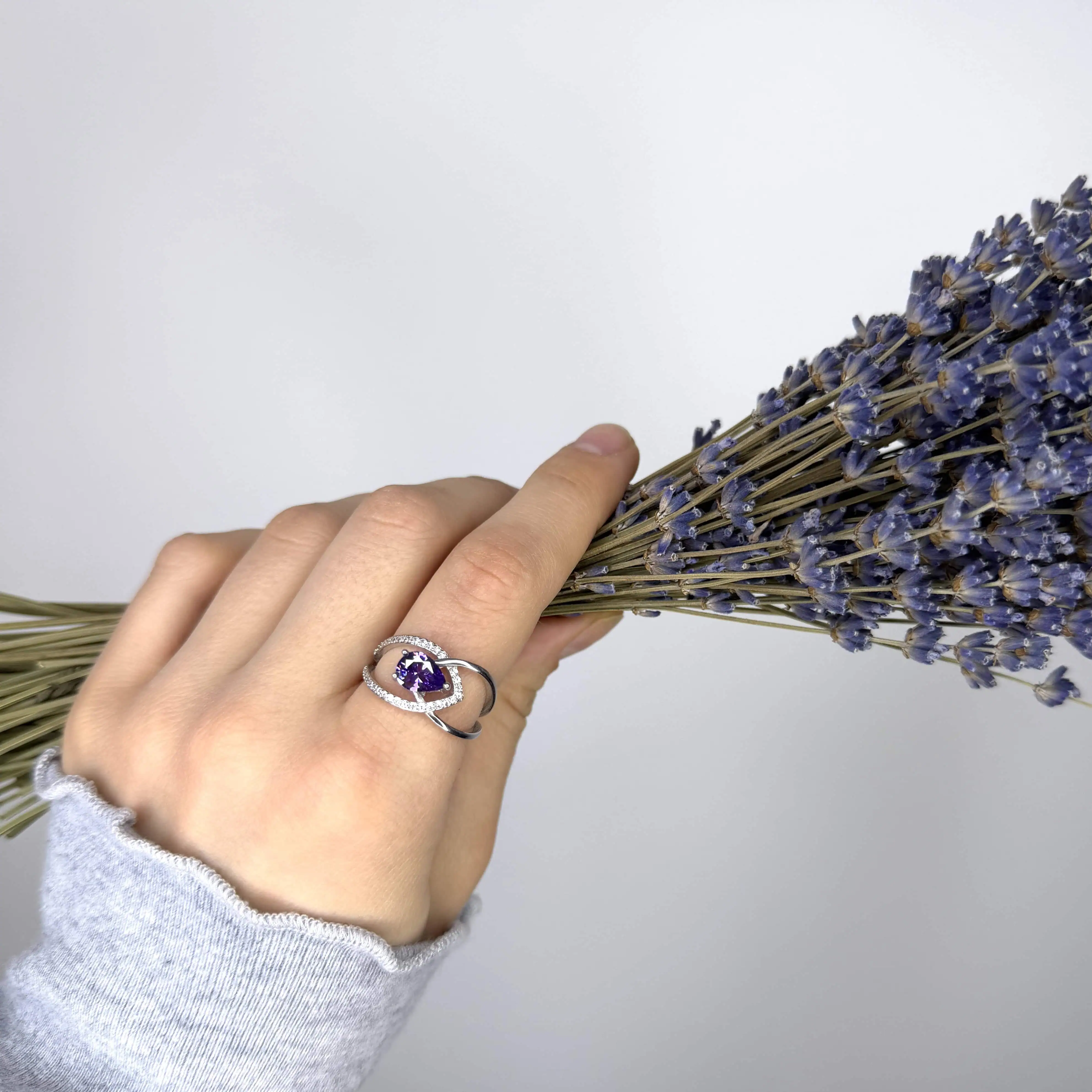 Срібна каблучка "Лаванда" - це ніжна каблучка, виконана в благородному металі, з яскравим фіолетовим цирконом, покрита родієм для блиску і стійкості до зносу.