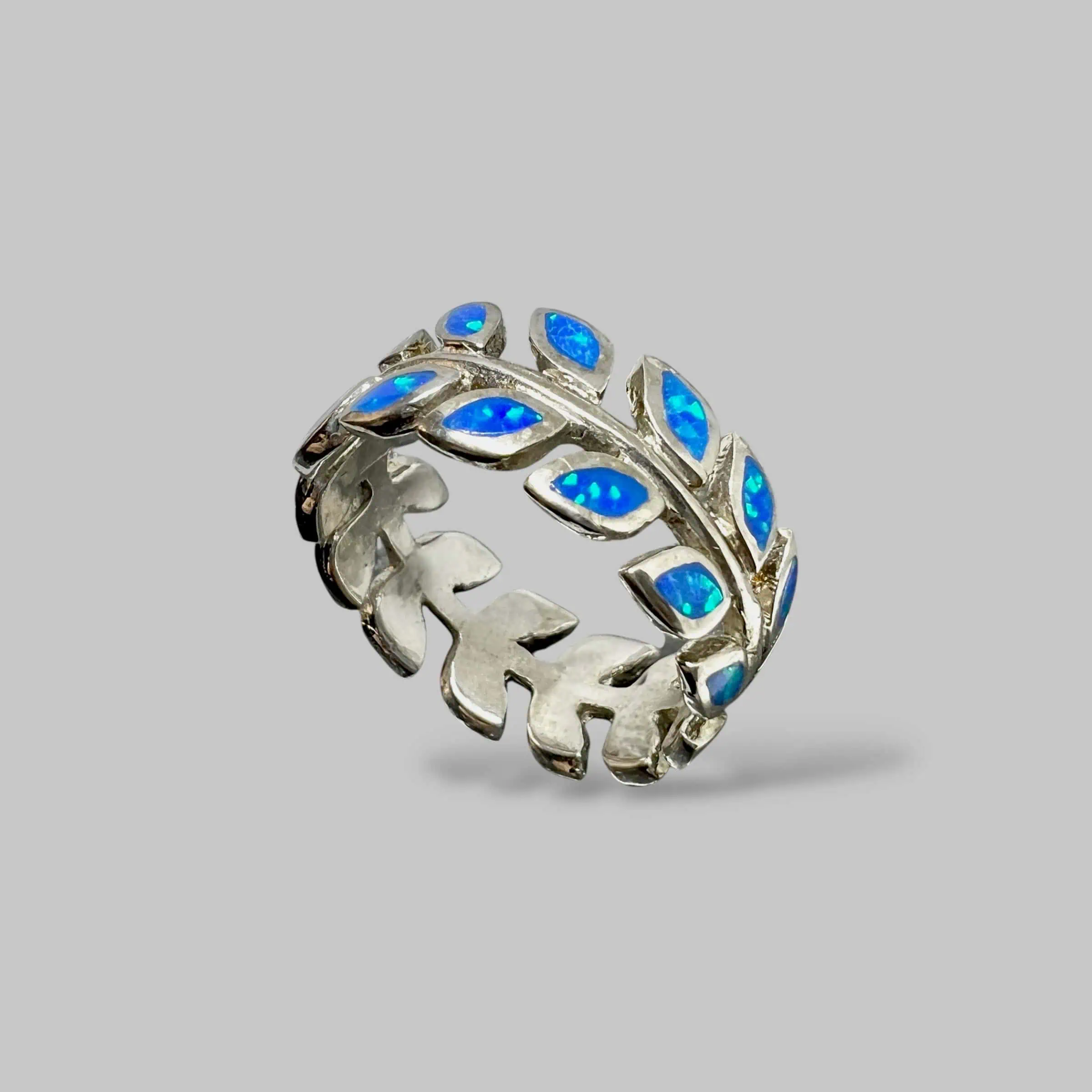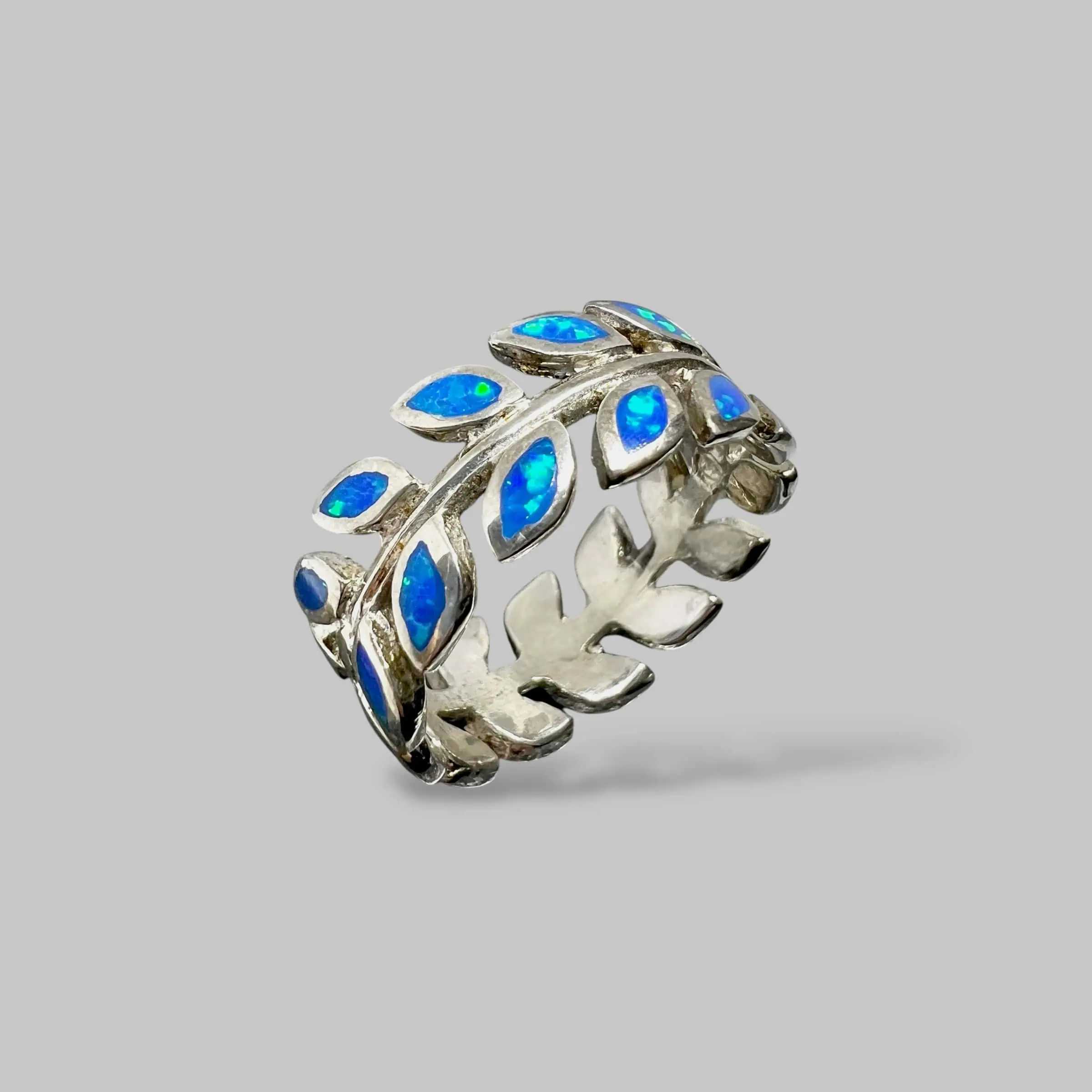 Елегантна срібна каблучка з великим штучним опалом у формі вінка. Чіткі лінії дизайну та масивне кріплення підкреслюють сучасний стиль прикраси, додаючи образу особливої вишуканості.