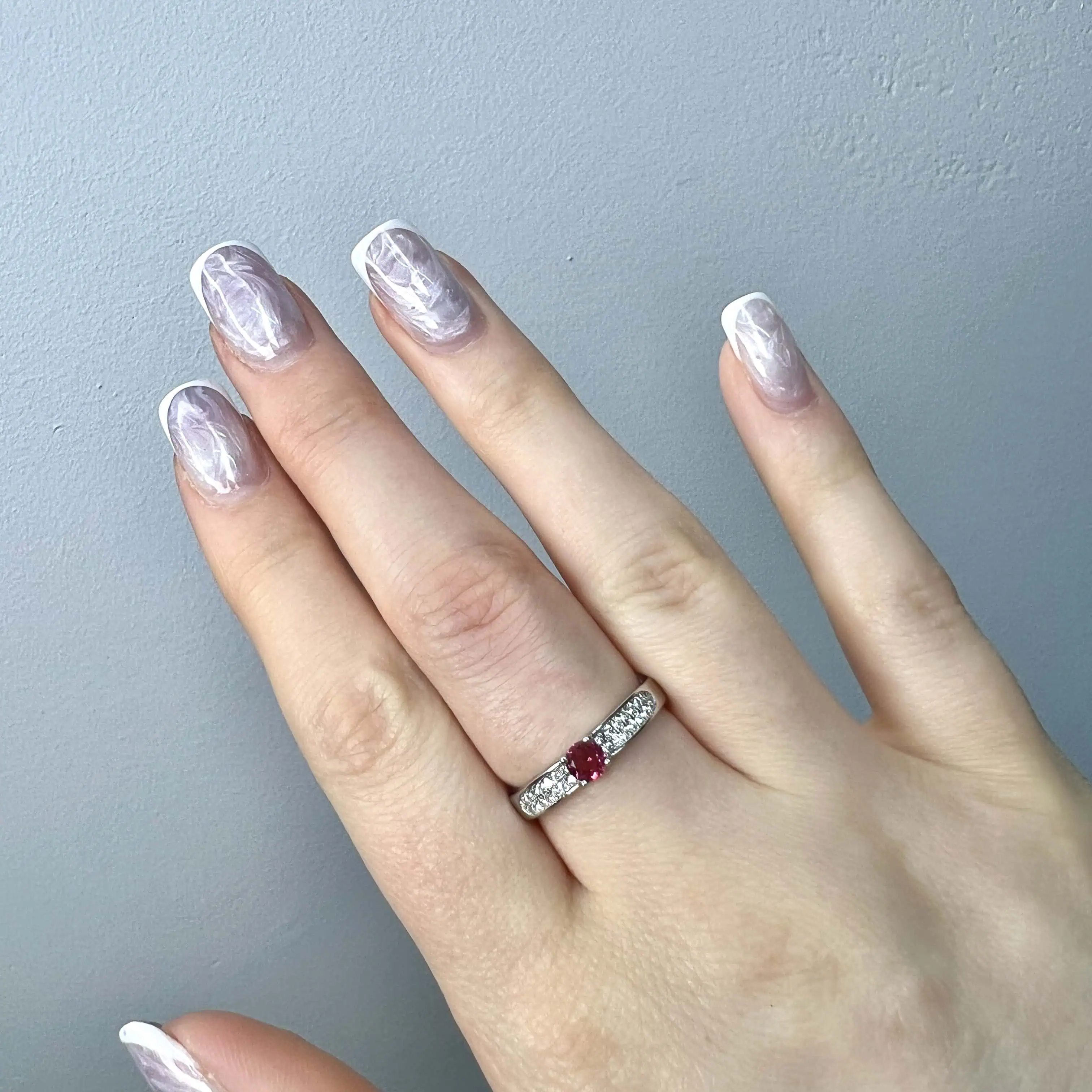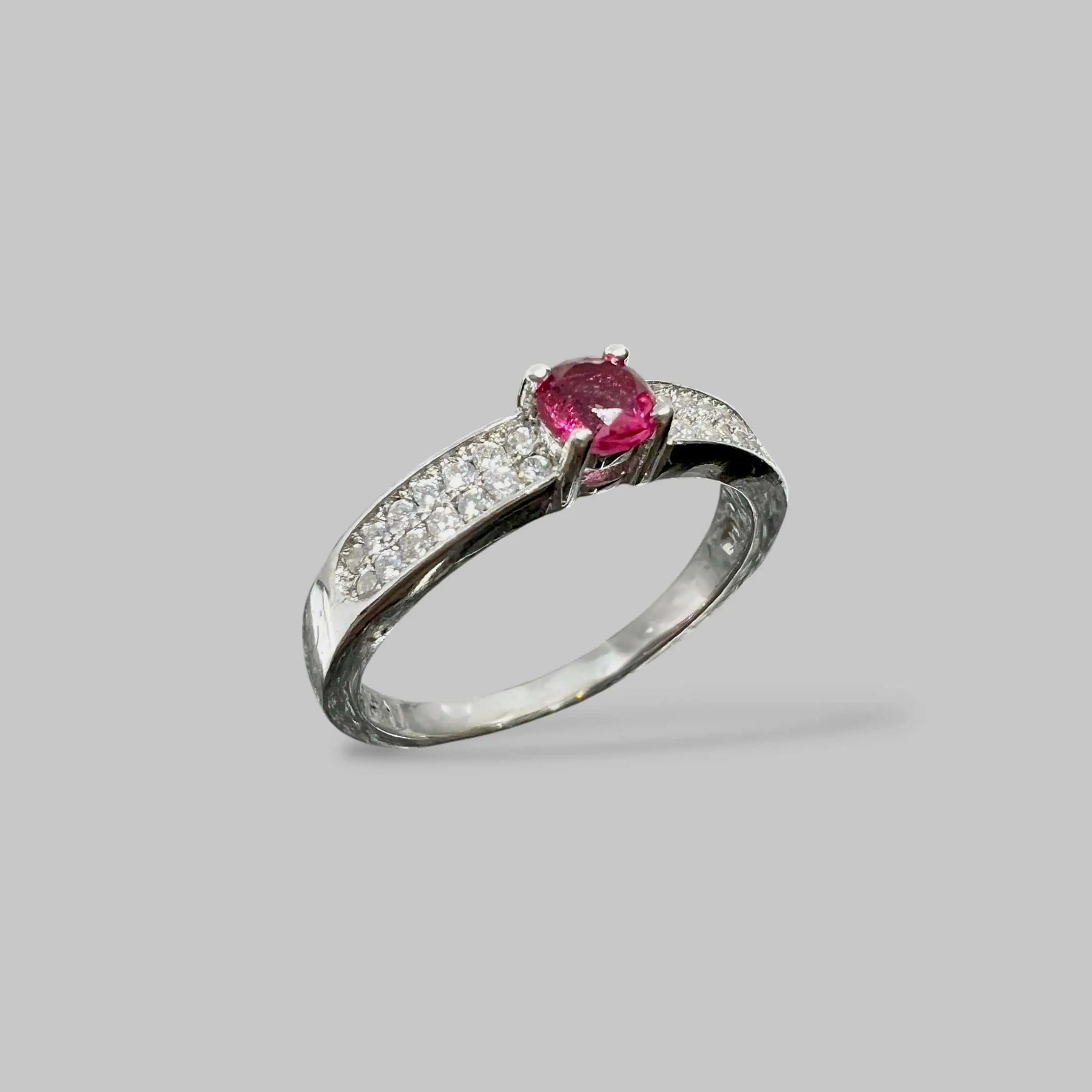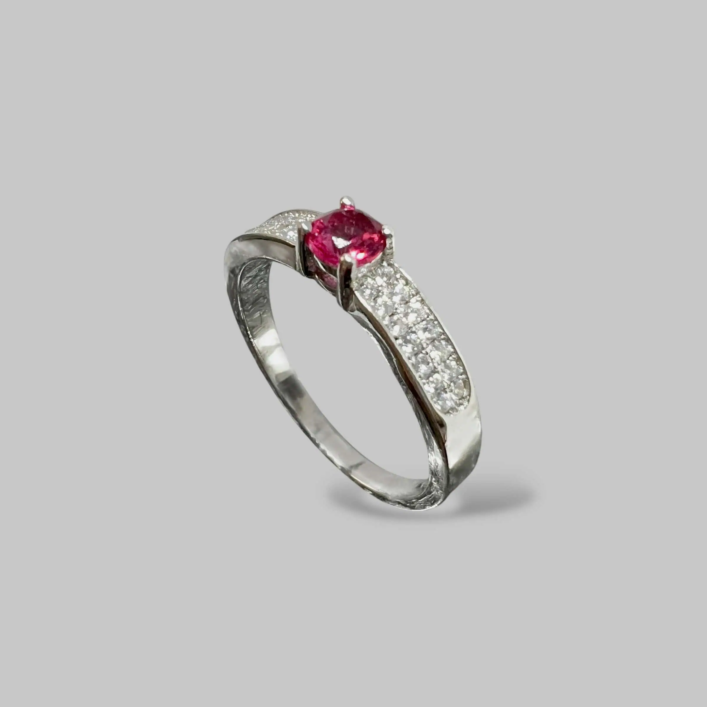 Витончена срібна каблучка з яскравим центральним каменем насиченого малинового відтінку. Тонка шинка, прикрашена доріжкою з дрібних прозорих цирконів, створює вишуканий контраст та підкреслює глибокий та привабливий колір головної вставки.