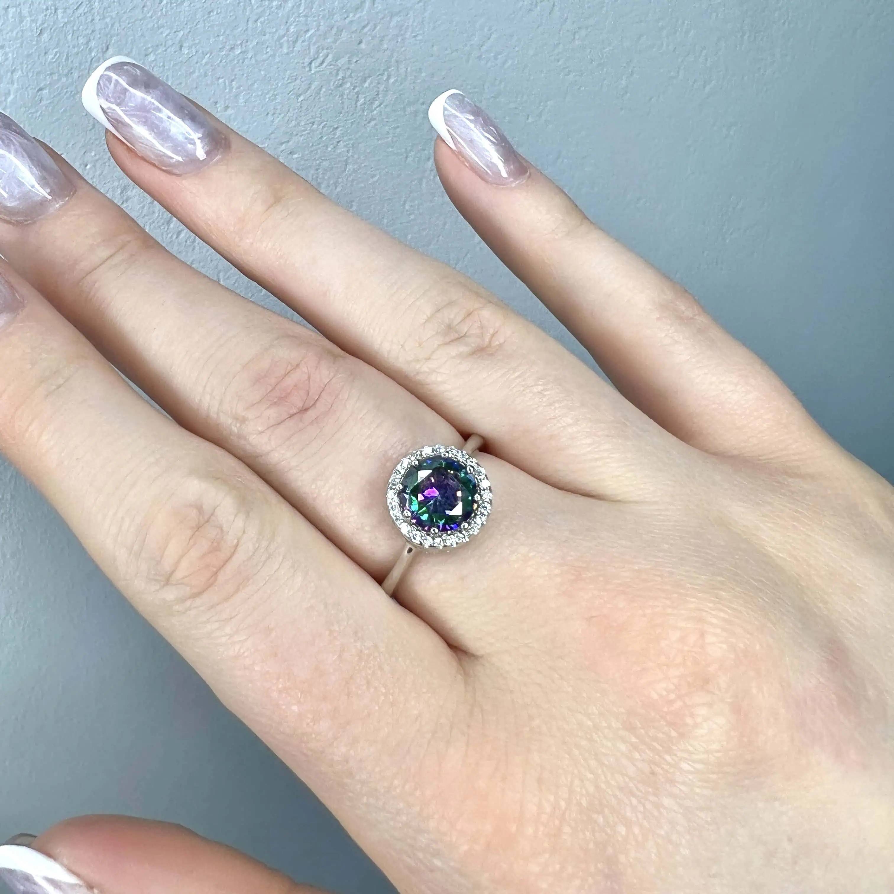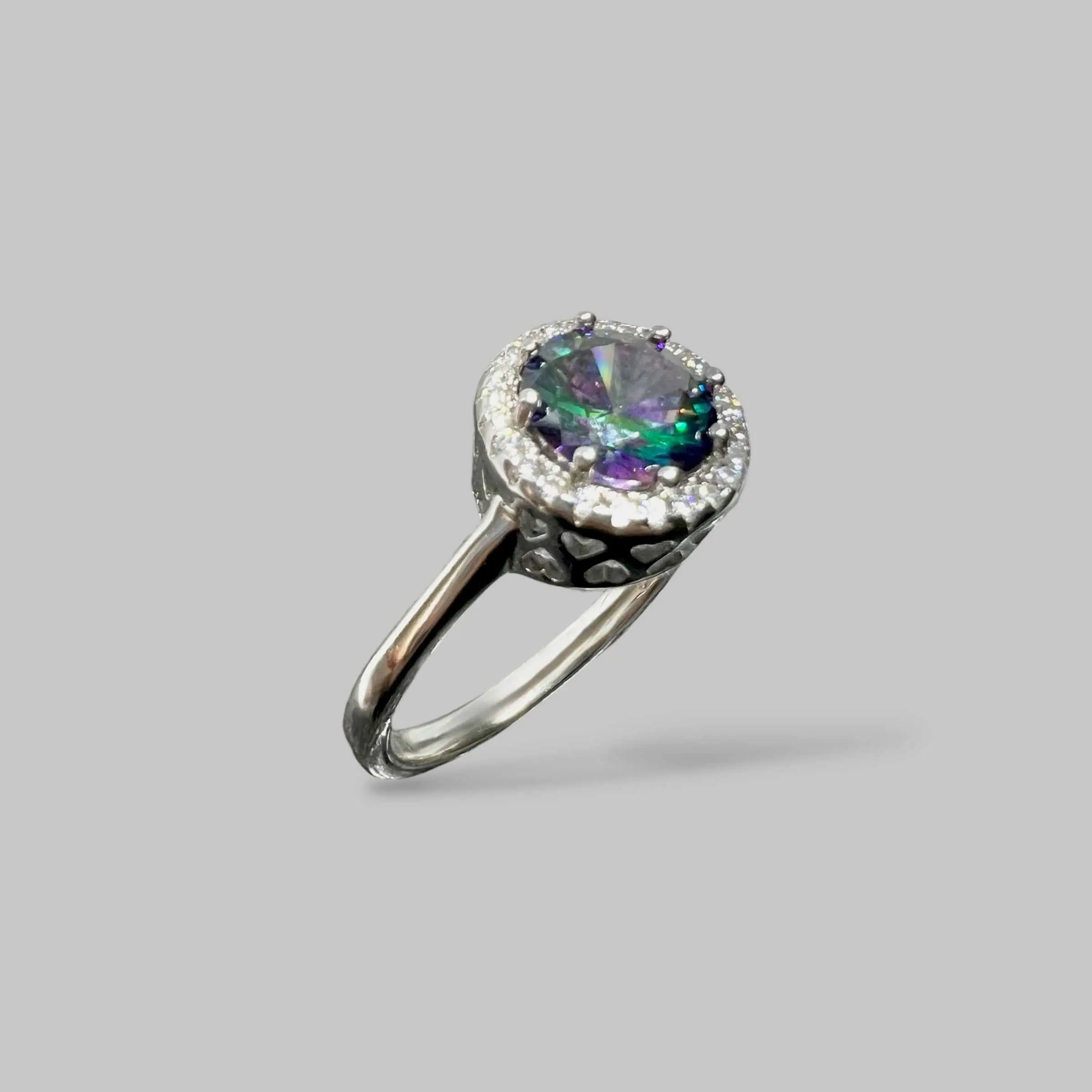 Ефектна срібна каблучка з центральним каменем, що переливається відтінками глибокого фіолетового та насиченого зеленого.