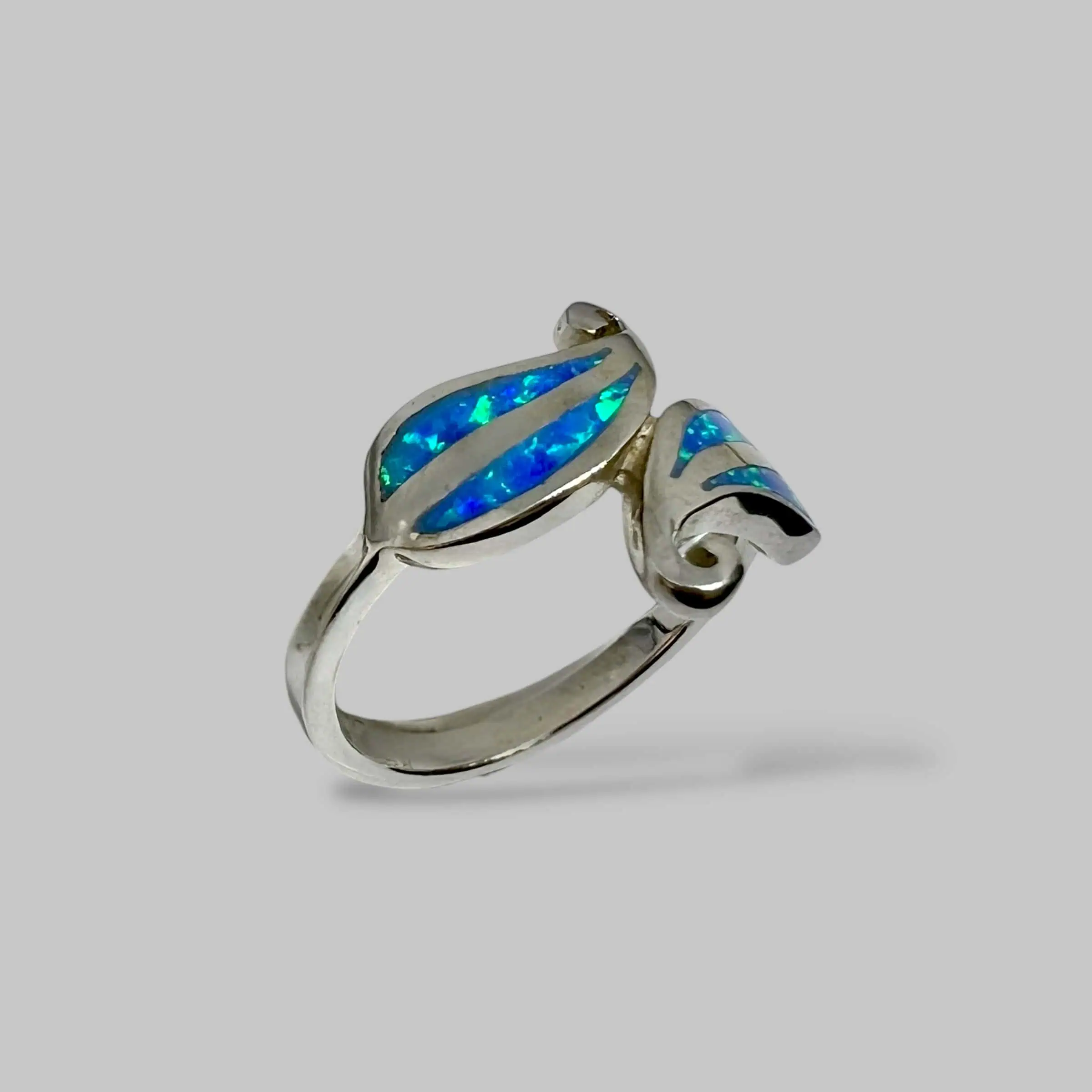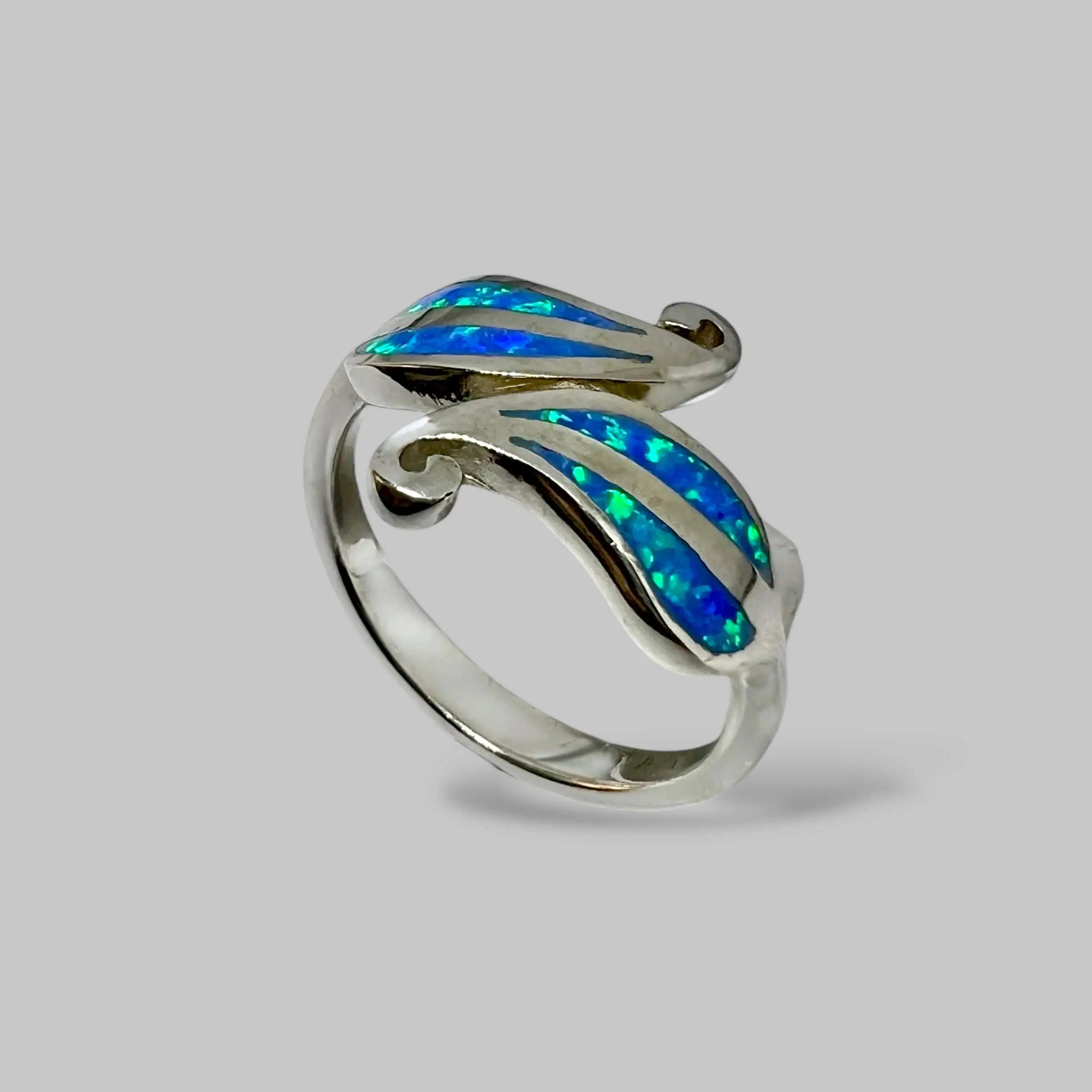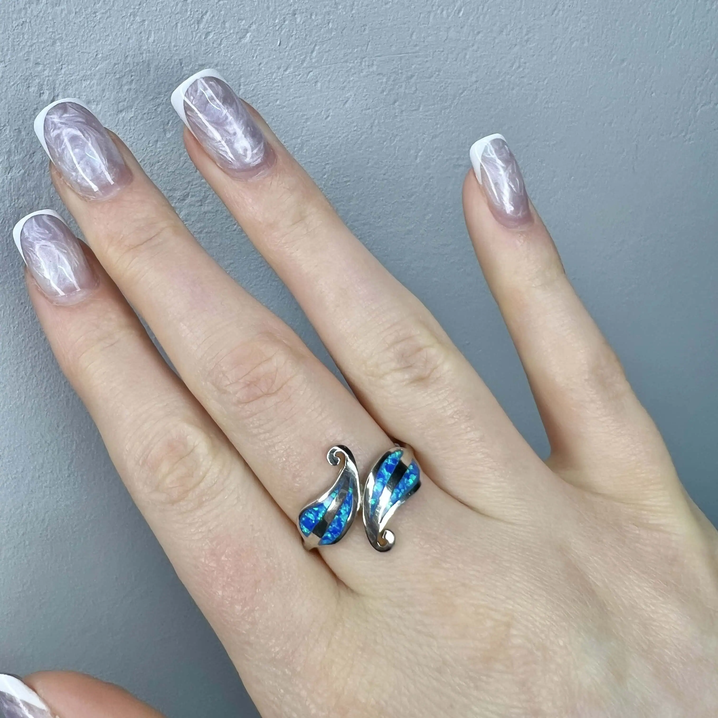 Оригінальна срібна каблучка з трьома вставками зі штучного опалу у формі крапель, що розташовані на витончених металевих завитках. Незвичайний дизайн створює відчуття руху, а насичений синій колір каменів додає образу яскравості.