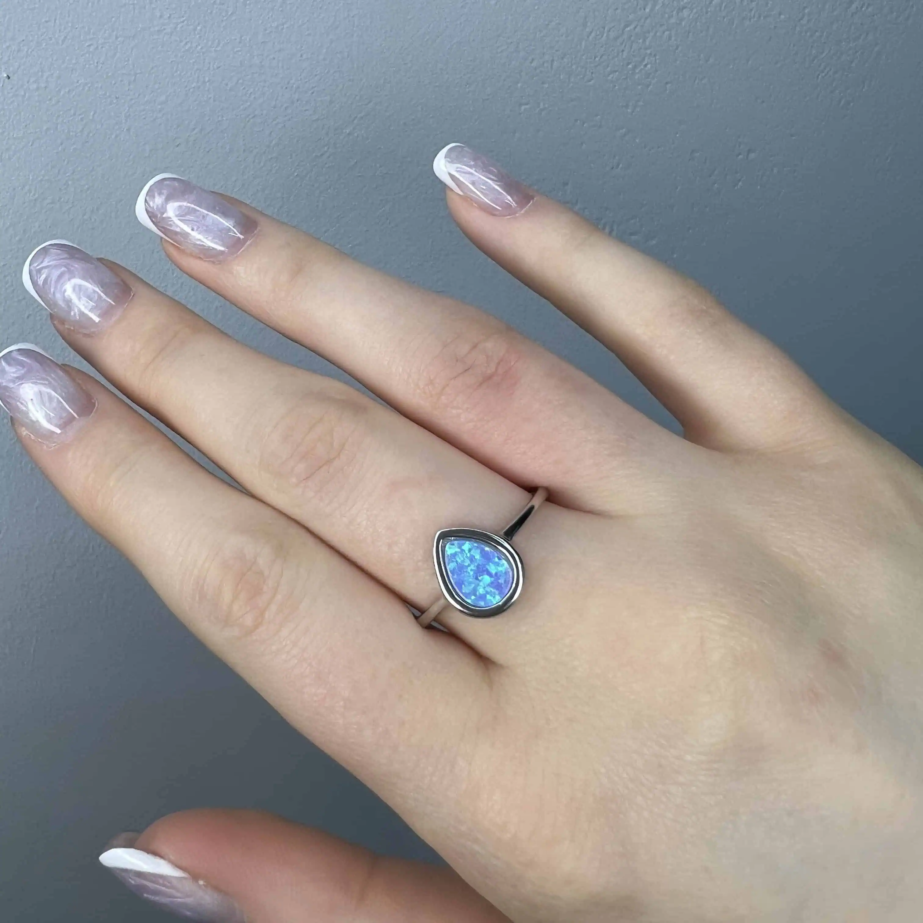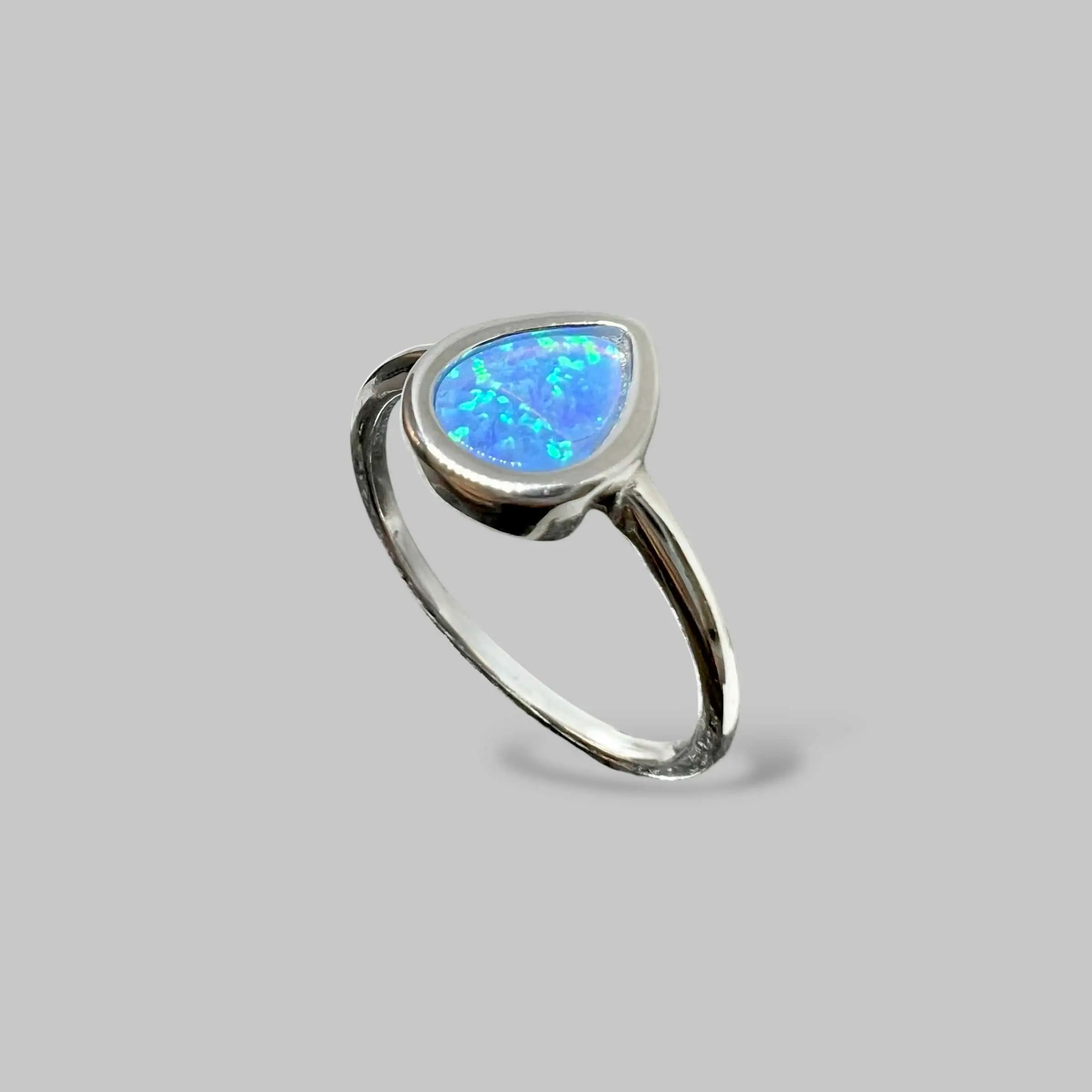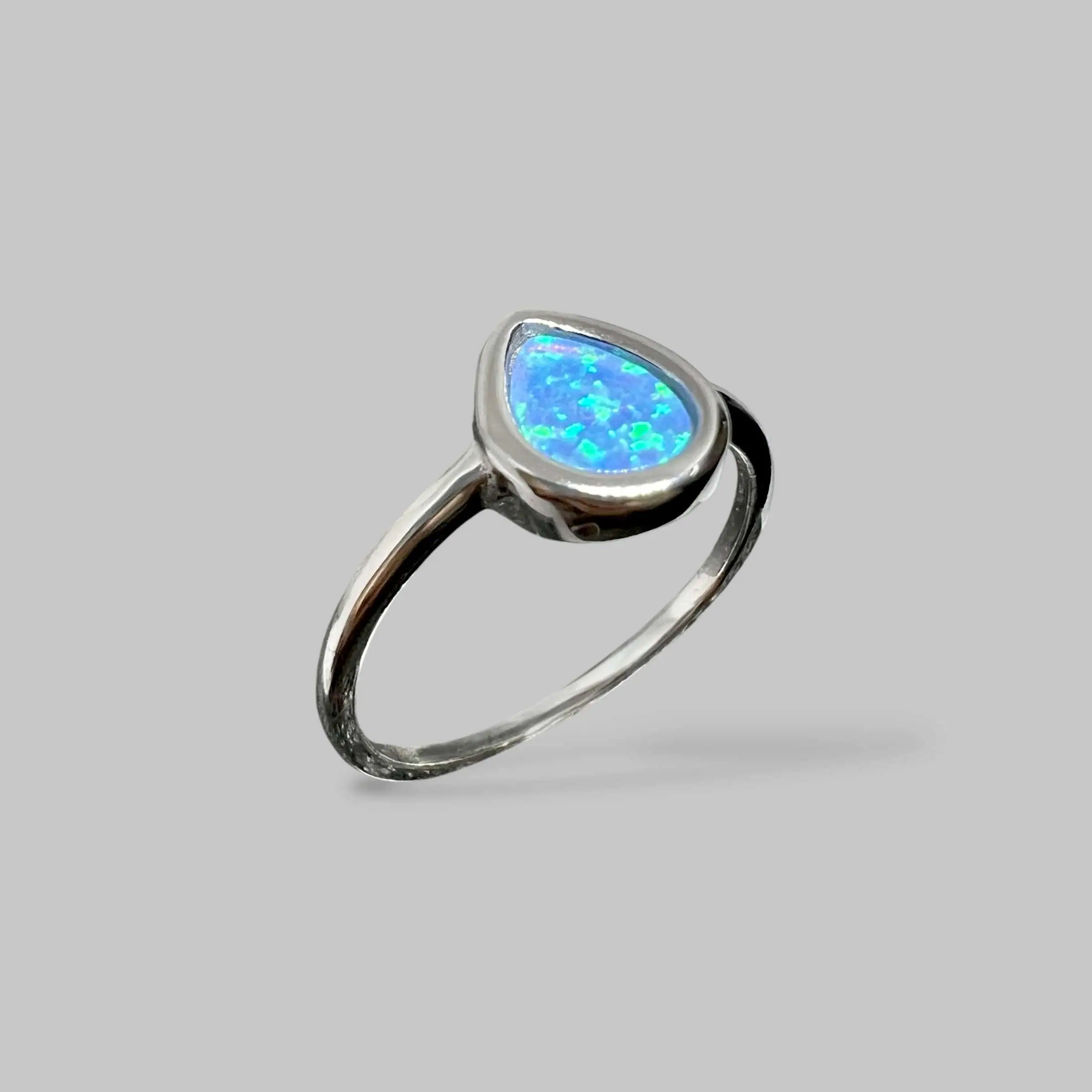 Ніжна срібна каблучка з мінімалістичним дизайном та вставкою з блакитного штучного опалу в глухій оправі. Камінь у формі краплі заворожує багатогранними переливами світла, що нагадують глибини океану або далекі туманності.