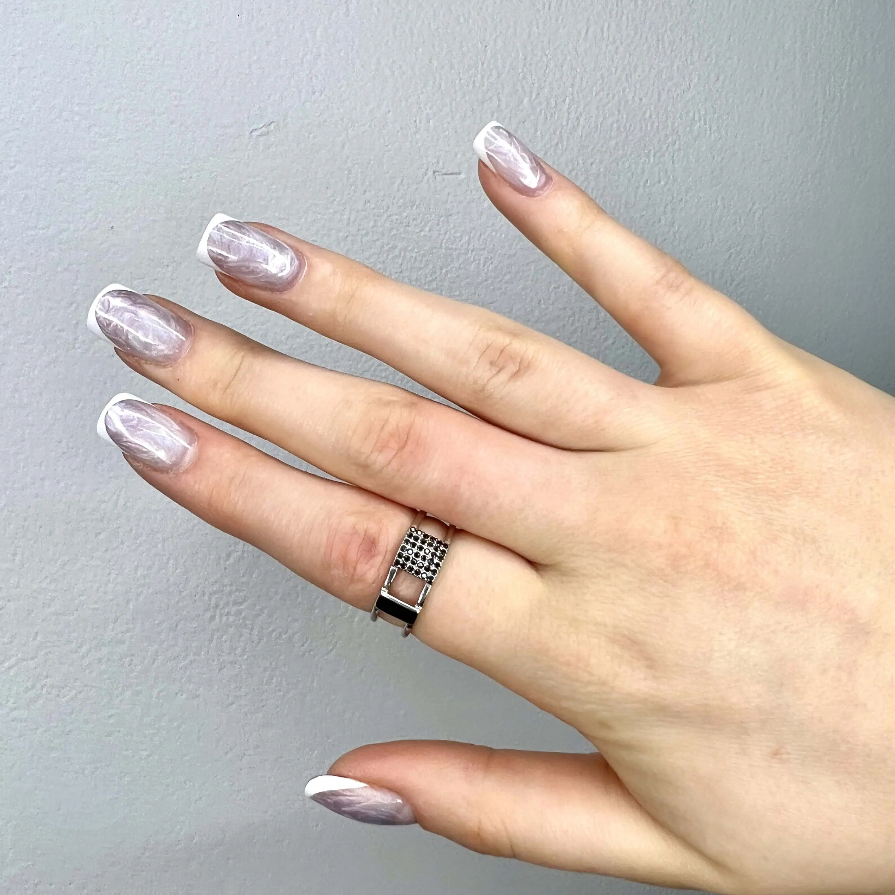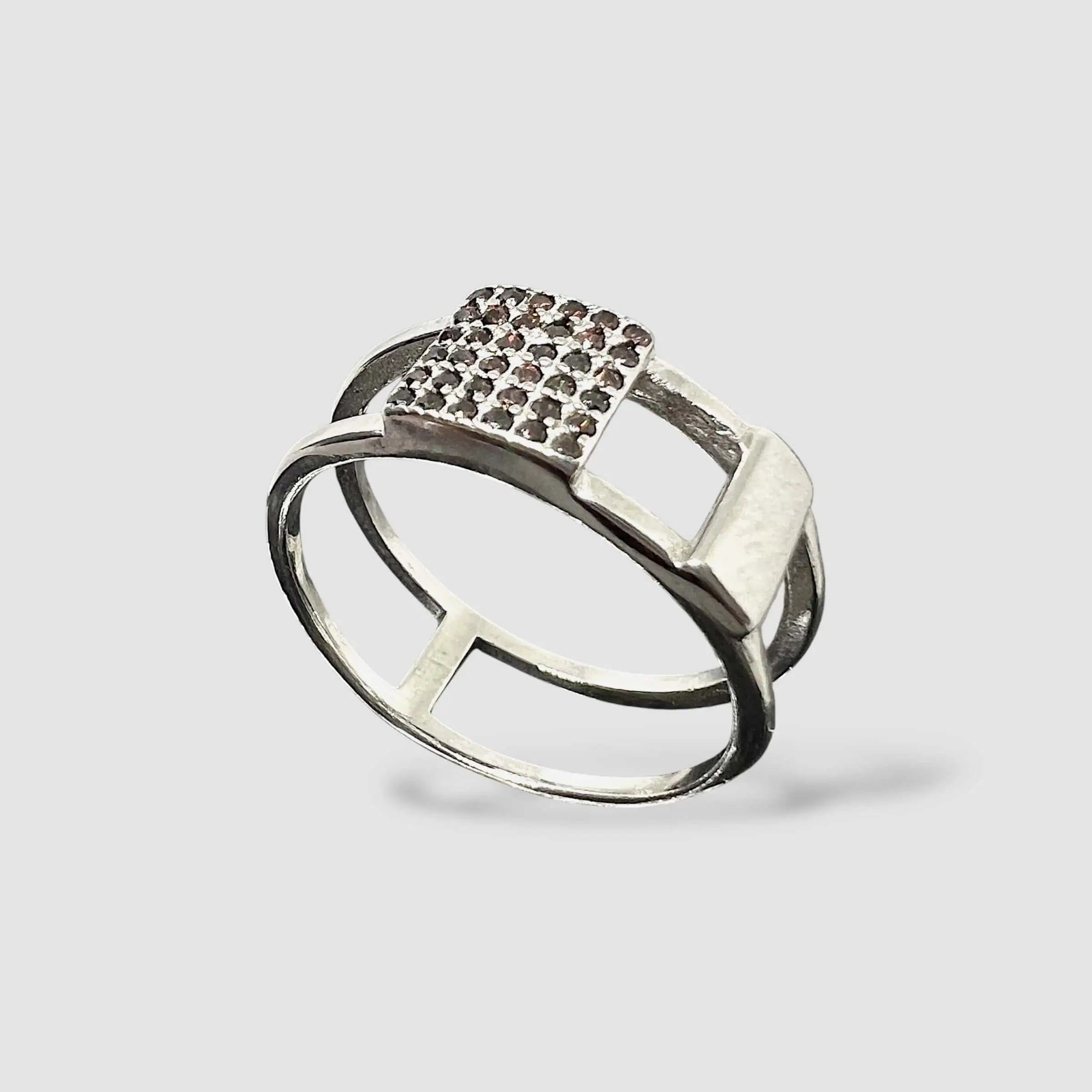 Стильна срібна каблучка 925 проби, виконана у сучасному архітектурному стилі. Подвійна тонка шинка з’єднується центральним квадратним елементом, створюючи ефект легкості та простору на пальці.