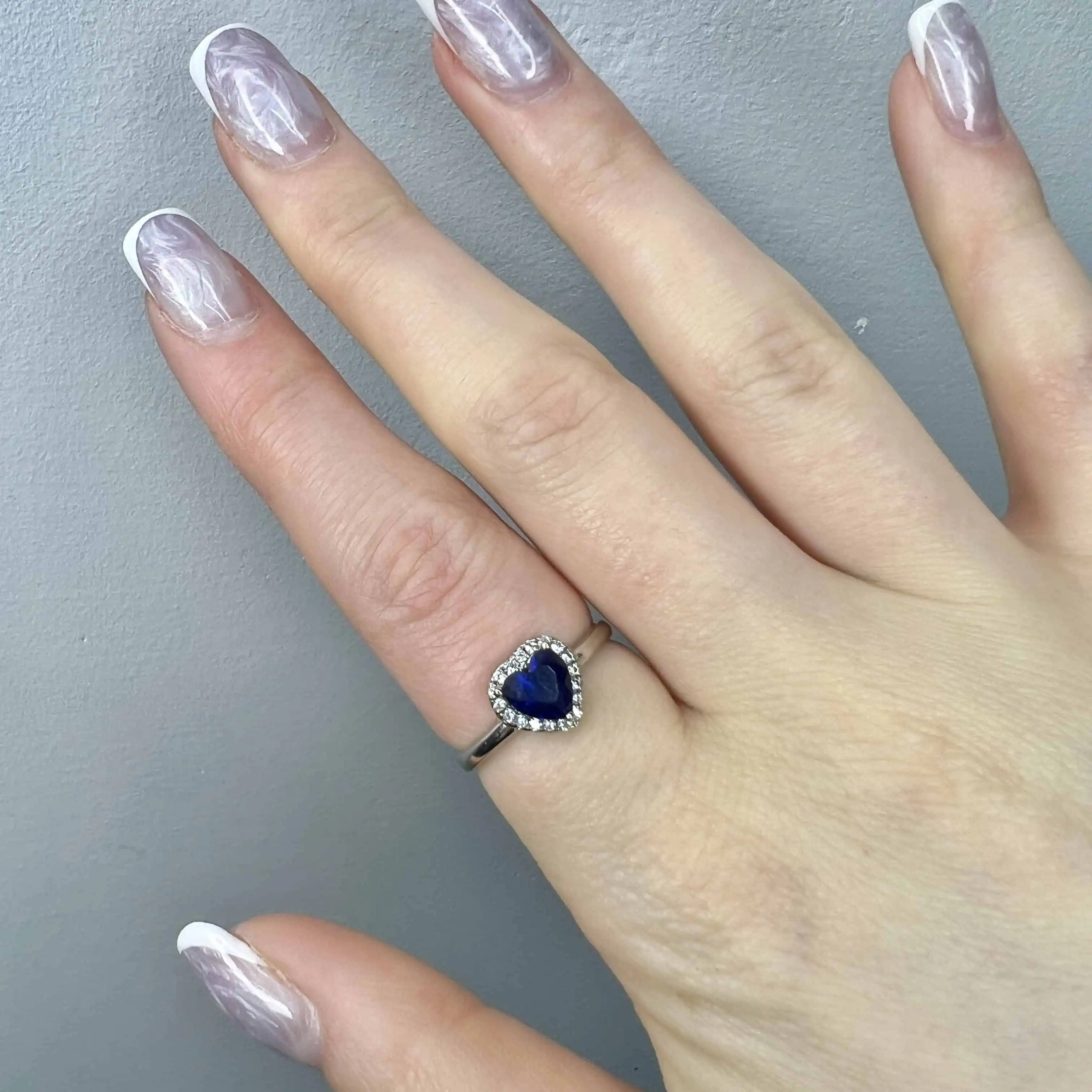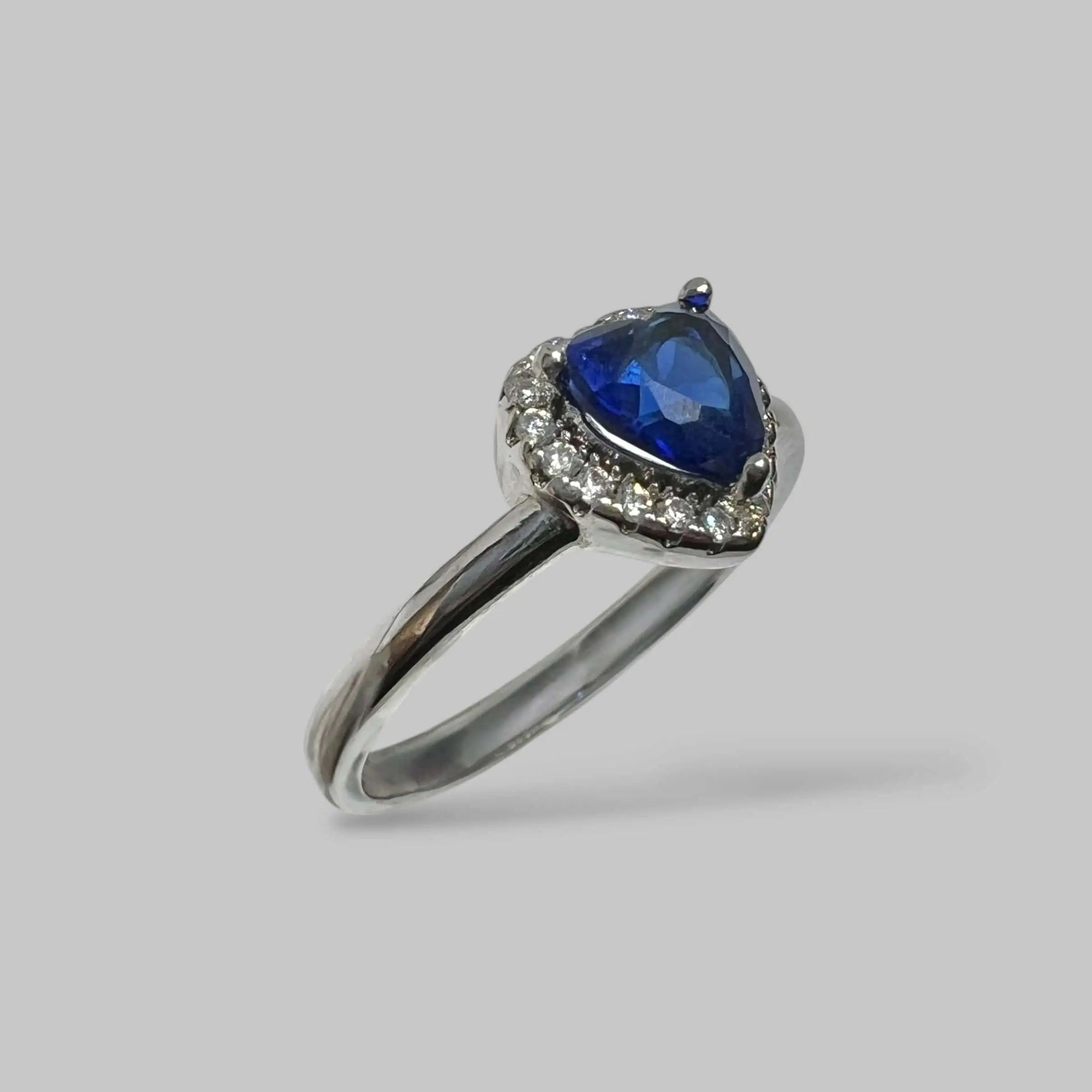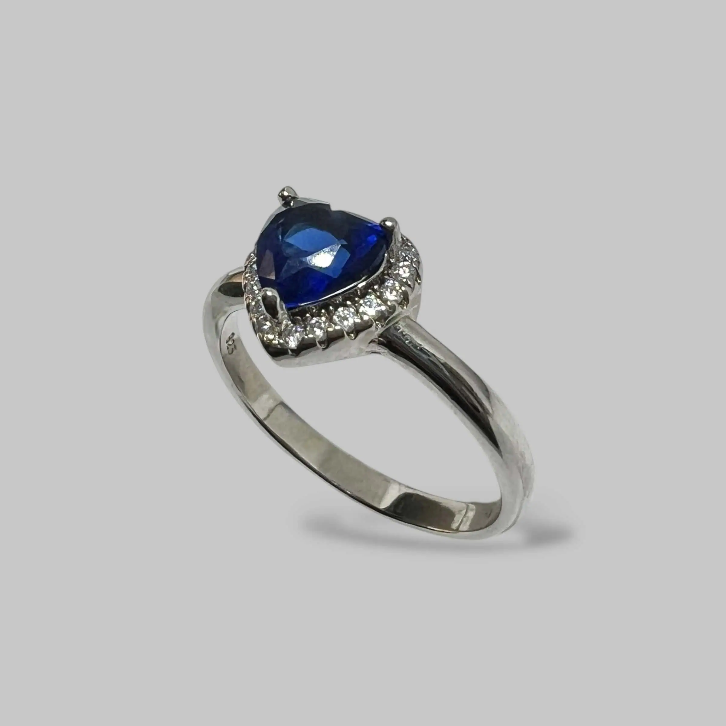 Чарівна срібна каблучка з центральним каменем у формі серця насиченого синього кольору. Сяючий ореол із дрібних білих цирконів підкреслює глибину основного каменю, створюючи вишуканий контраст.
