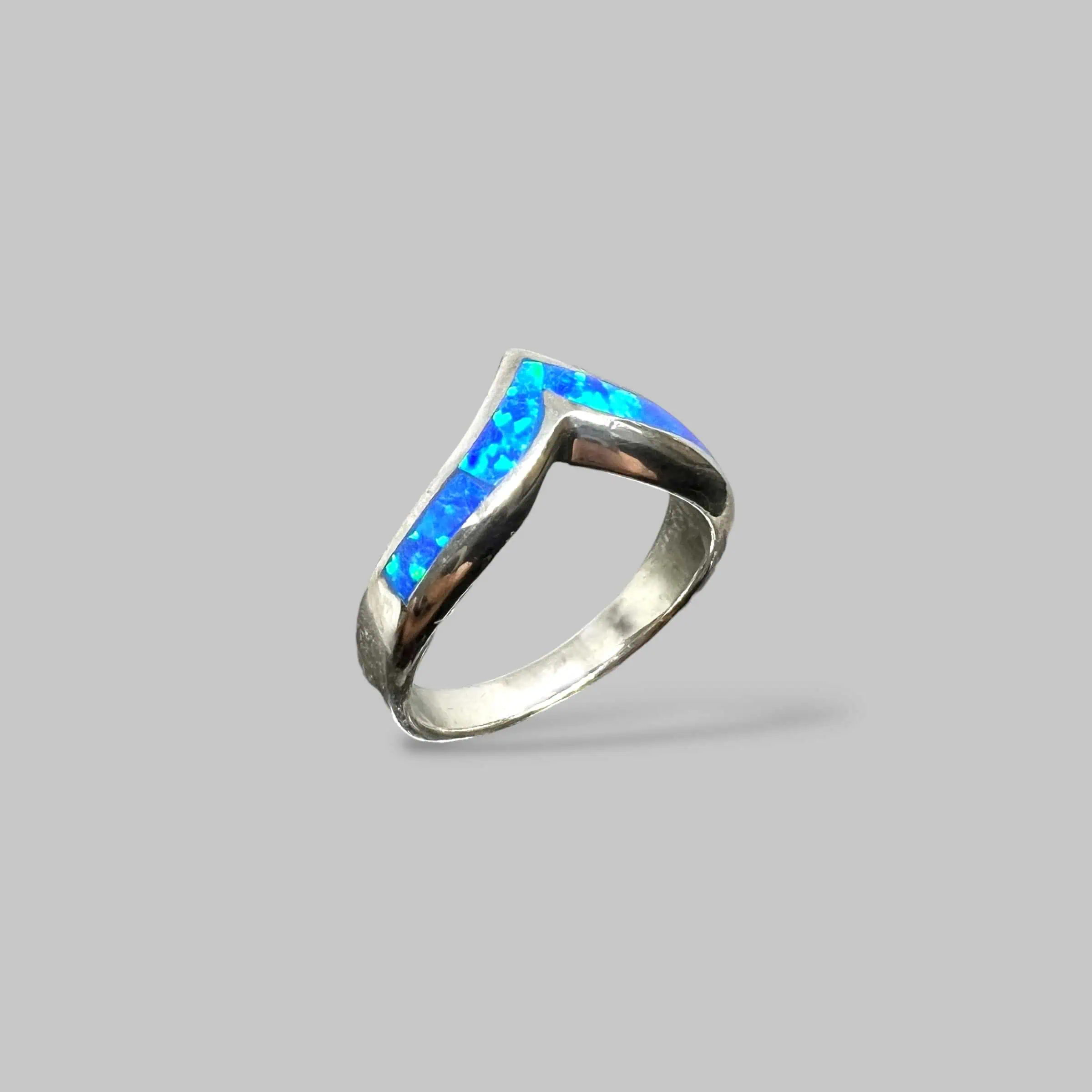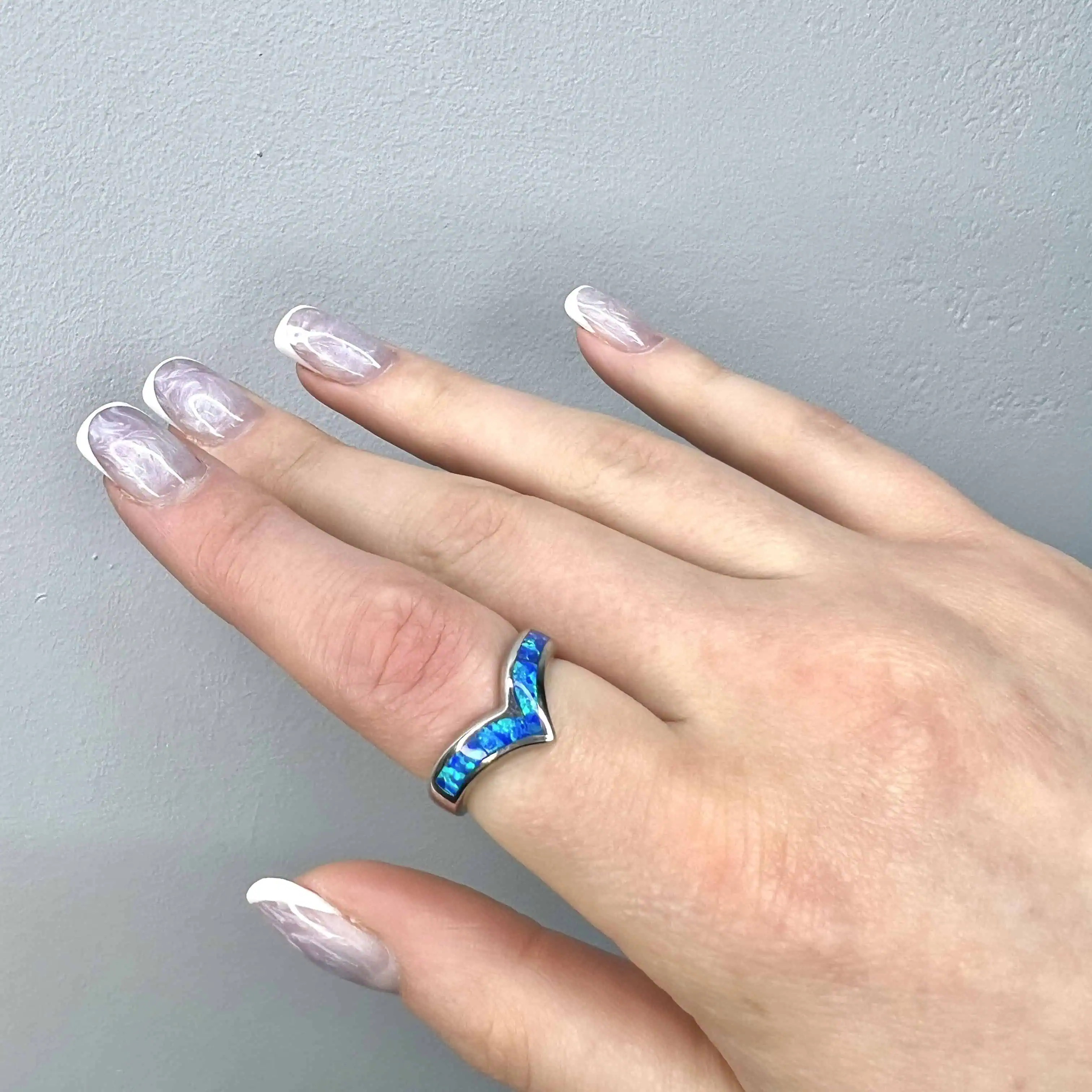 Стильна срібна каблучка з виразним V-подібним вигином, декорована вставками насиченого блакитного кольору з штучним опалом. Гладка дзеркальна поверхня металу в поєднанні з яскравим камінням створює сучасний та свіжий образ.