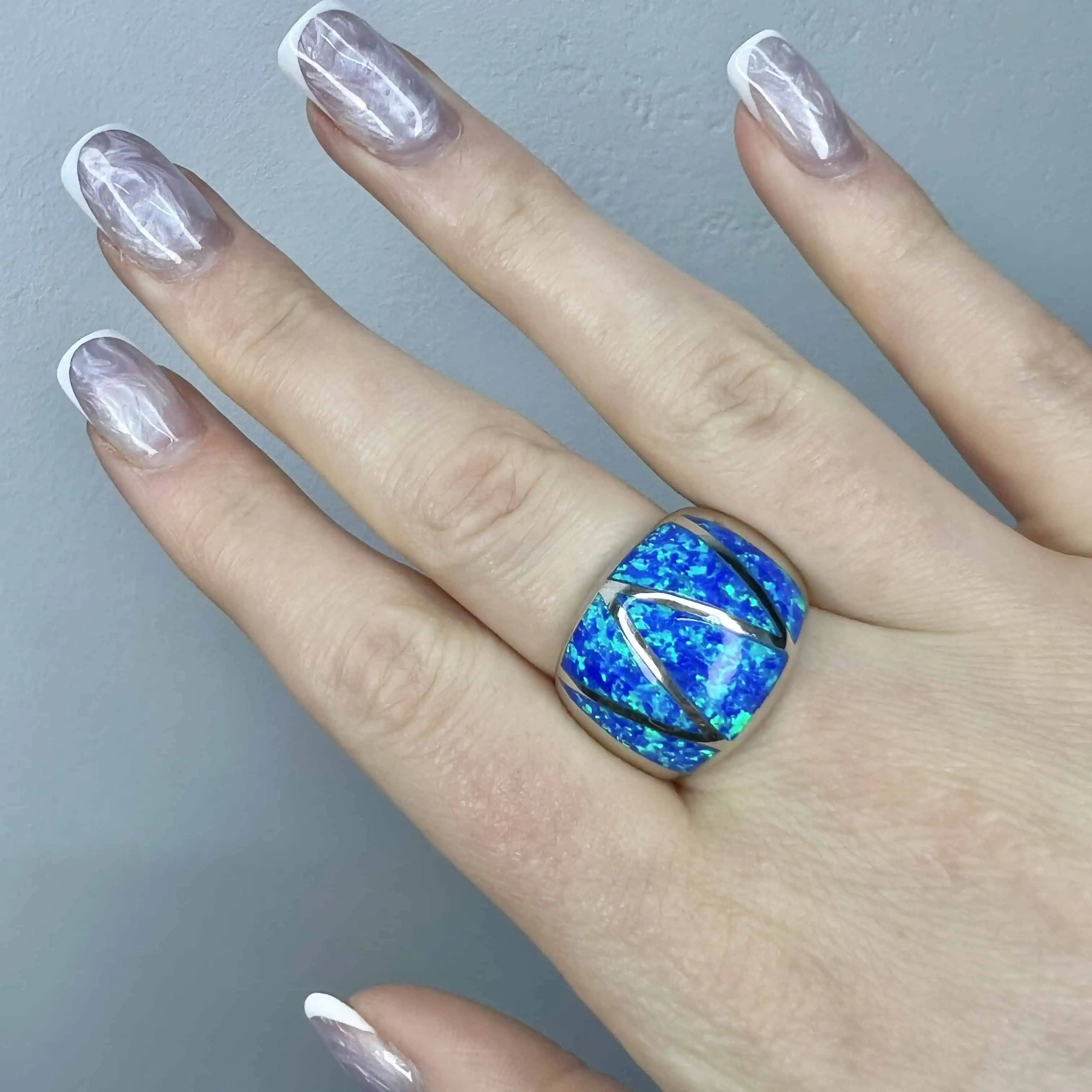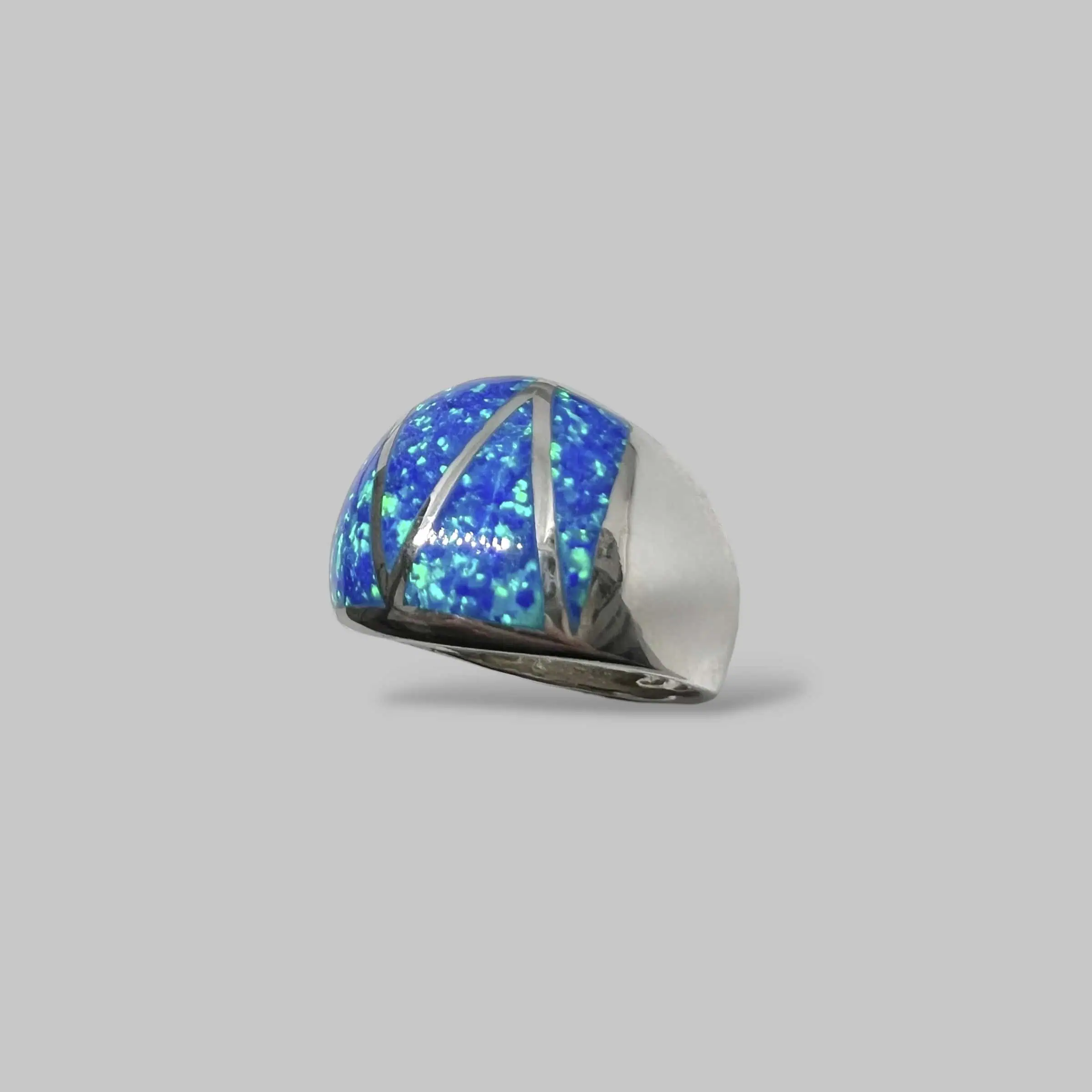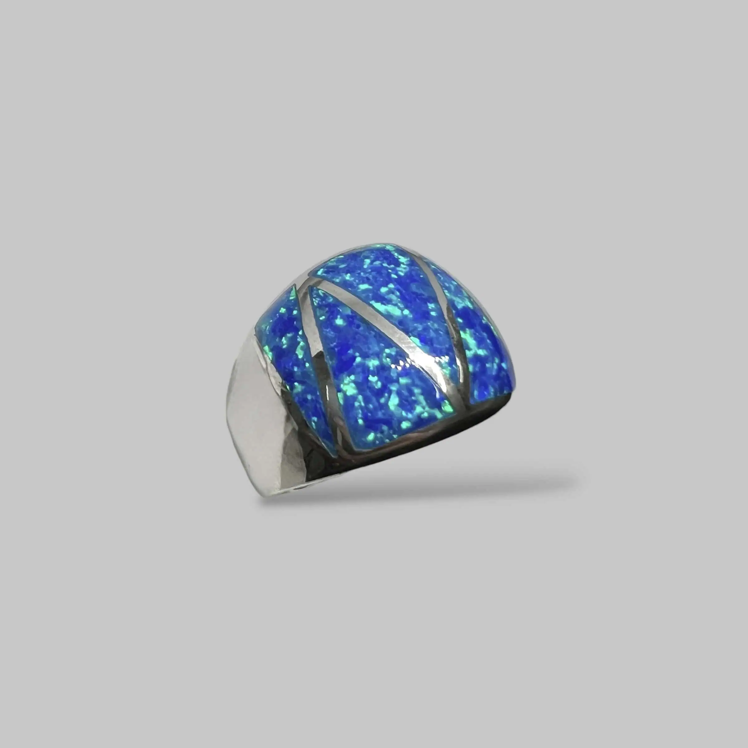 Масивна срібна каблучка з великим штучним опалом глибокого синього кольору — справжній витвір сучасного мистецтва. Декоративна частина виробу має опуклу ергономічну форму, розділену на кілька сегментів срібними лініями, що створює цікавий мозаїчний ефект.