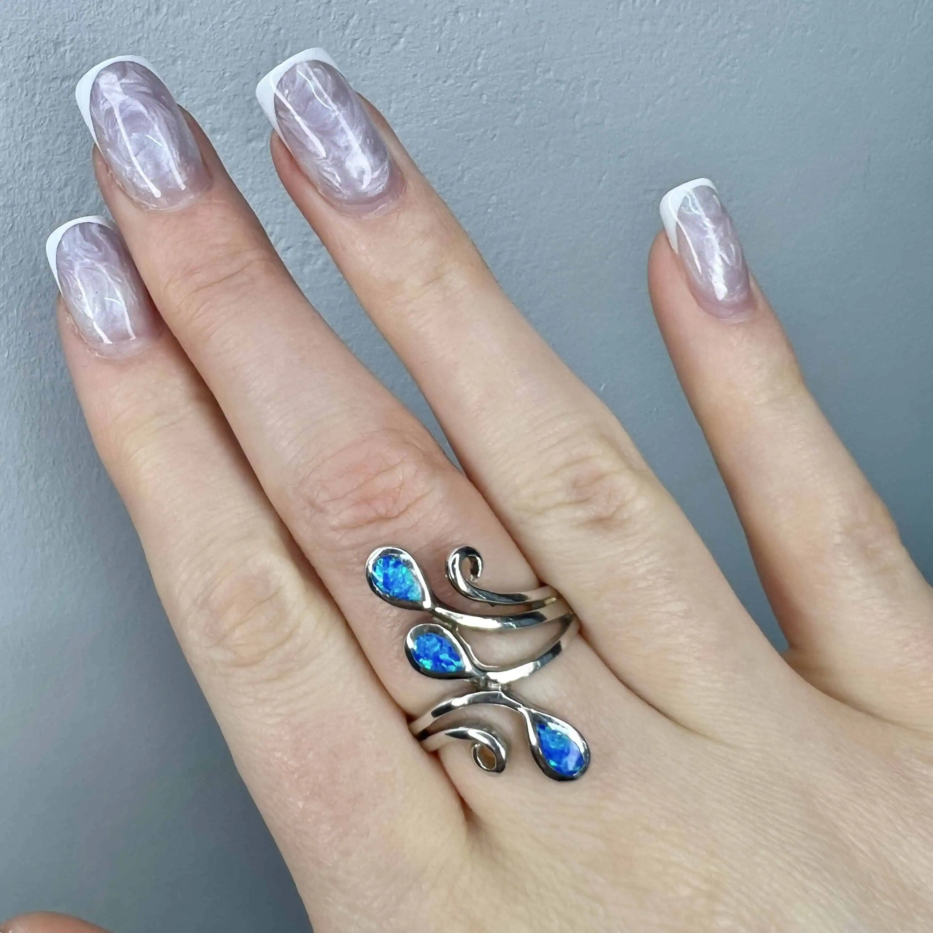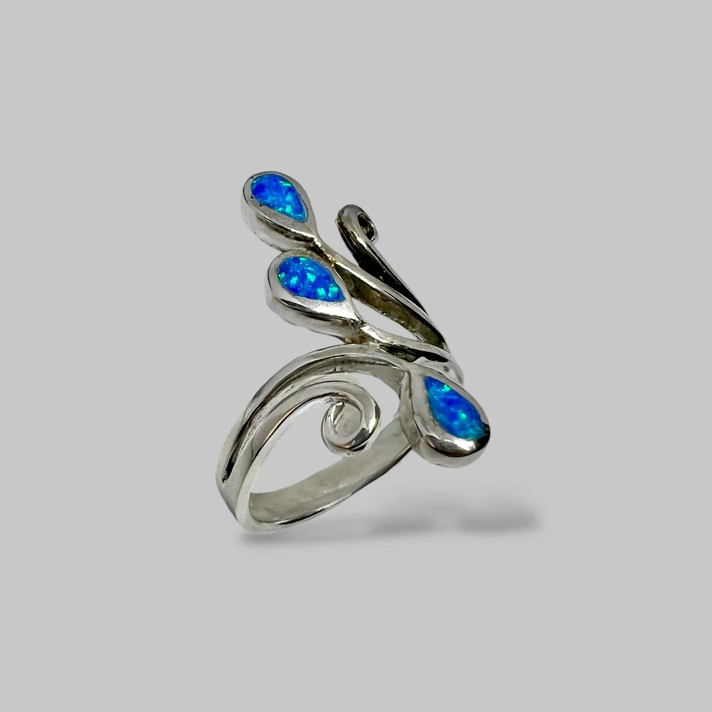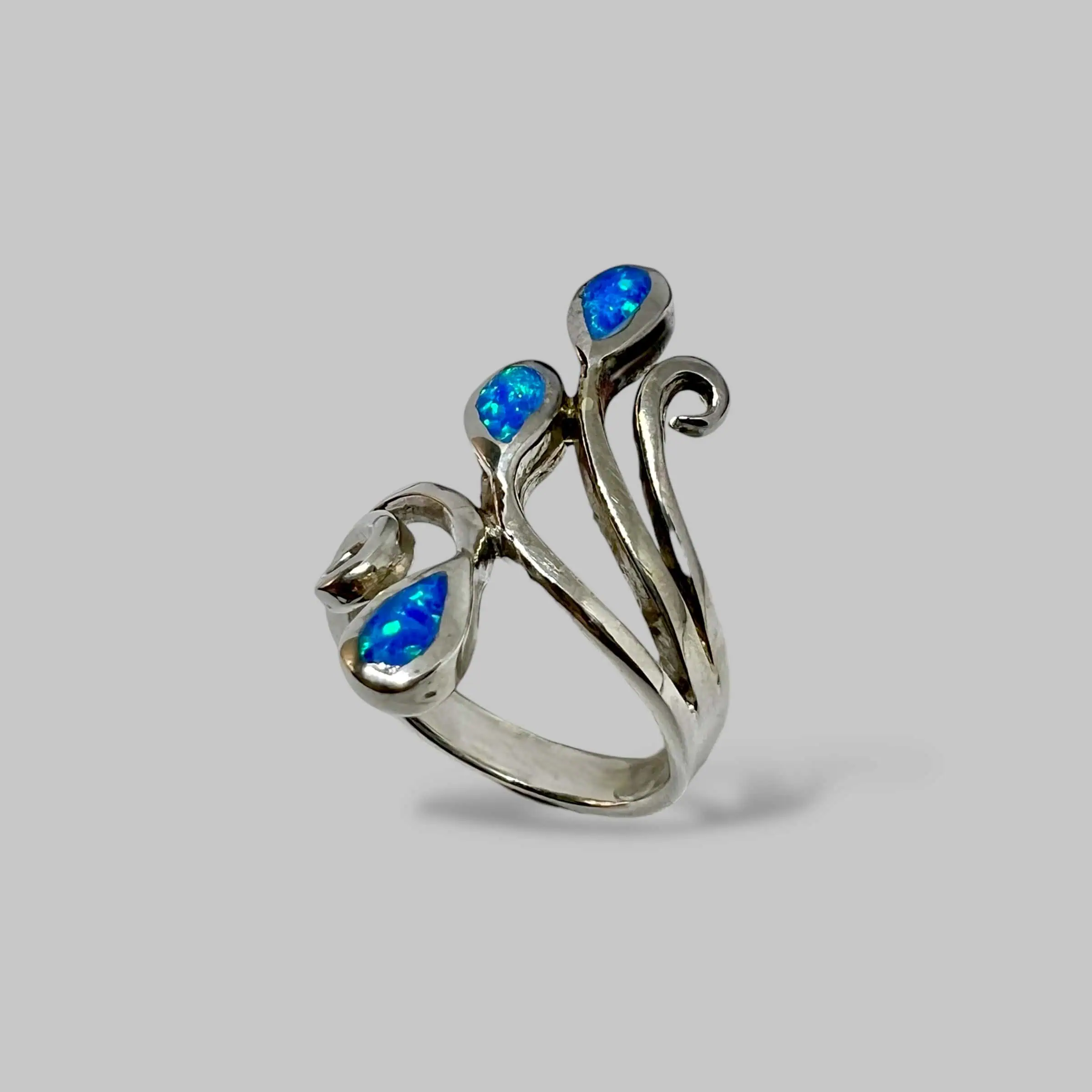 Акцентна срібна каблучка з великою вставкою штучного опалу видовженої форми. Камінь заворожує інтенсивним небесно-блакитним мерехтінням, що нагадує сонячні відблиски на воді.