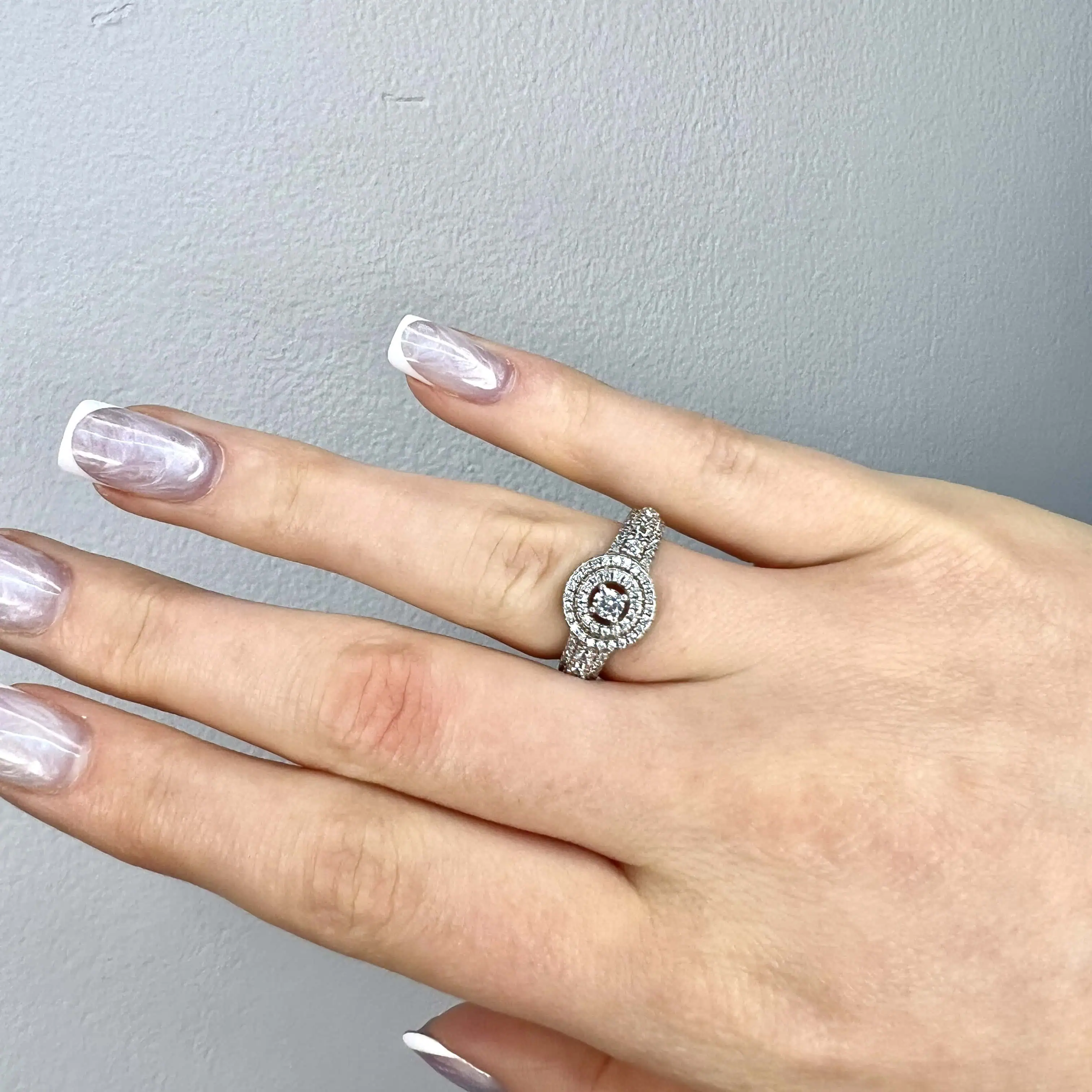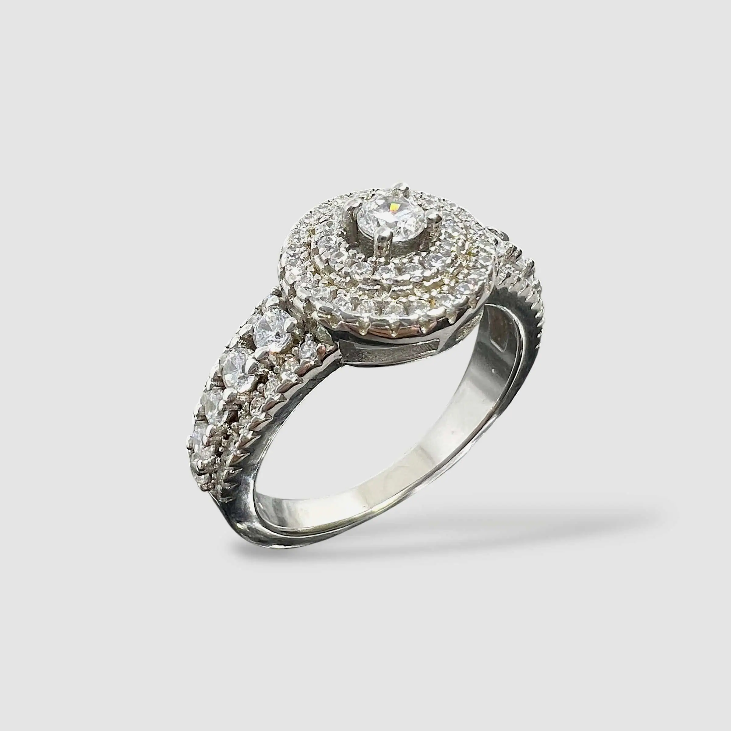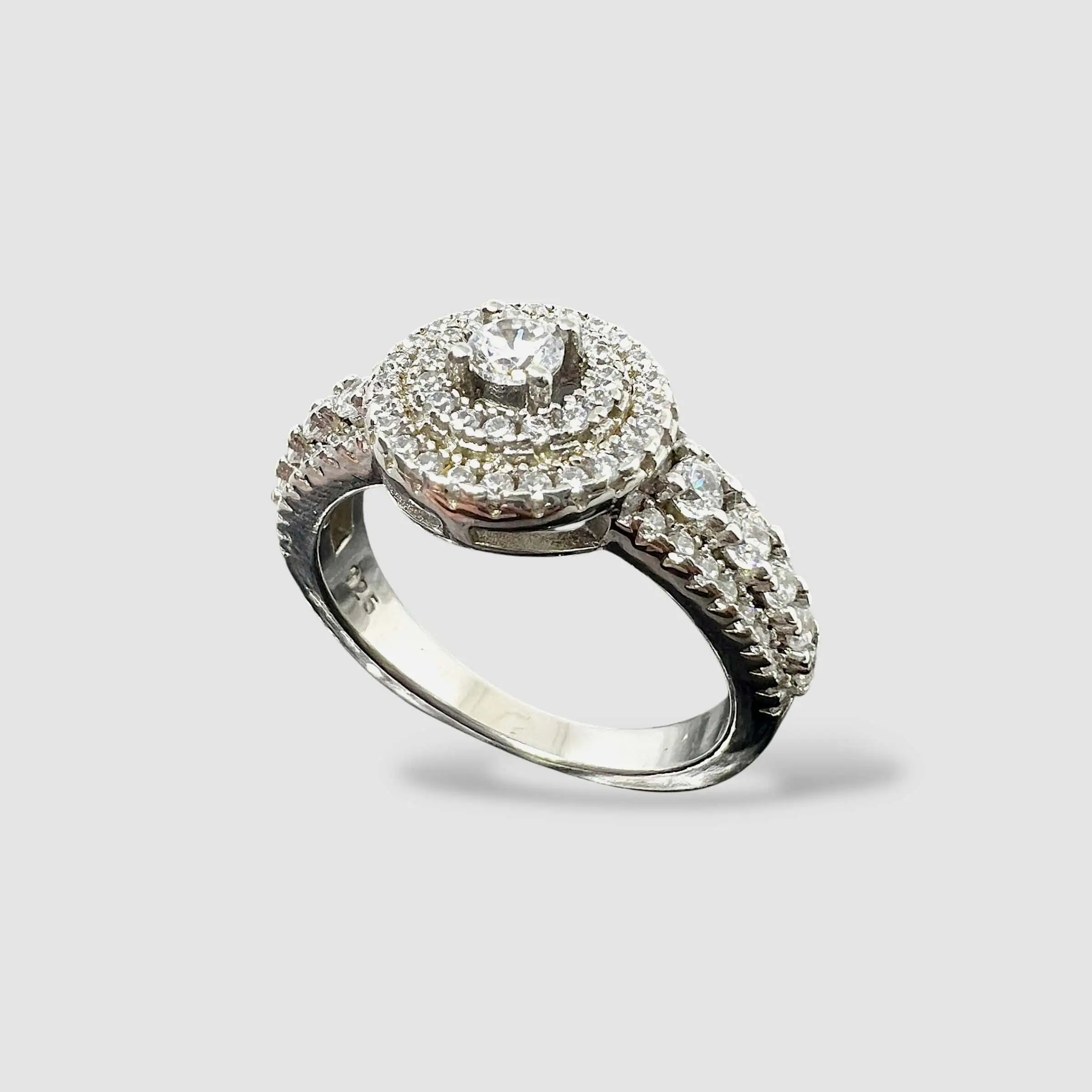 Елегантна каблучка виконана у стилі "гало". Центральний круглий камінь оточений подвійним колом дрібних цирконів, а широка шинка, також повністю з камінням, надає виробу особливої розкоші.