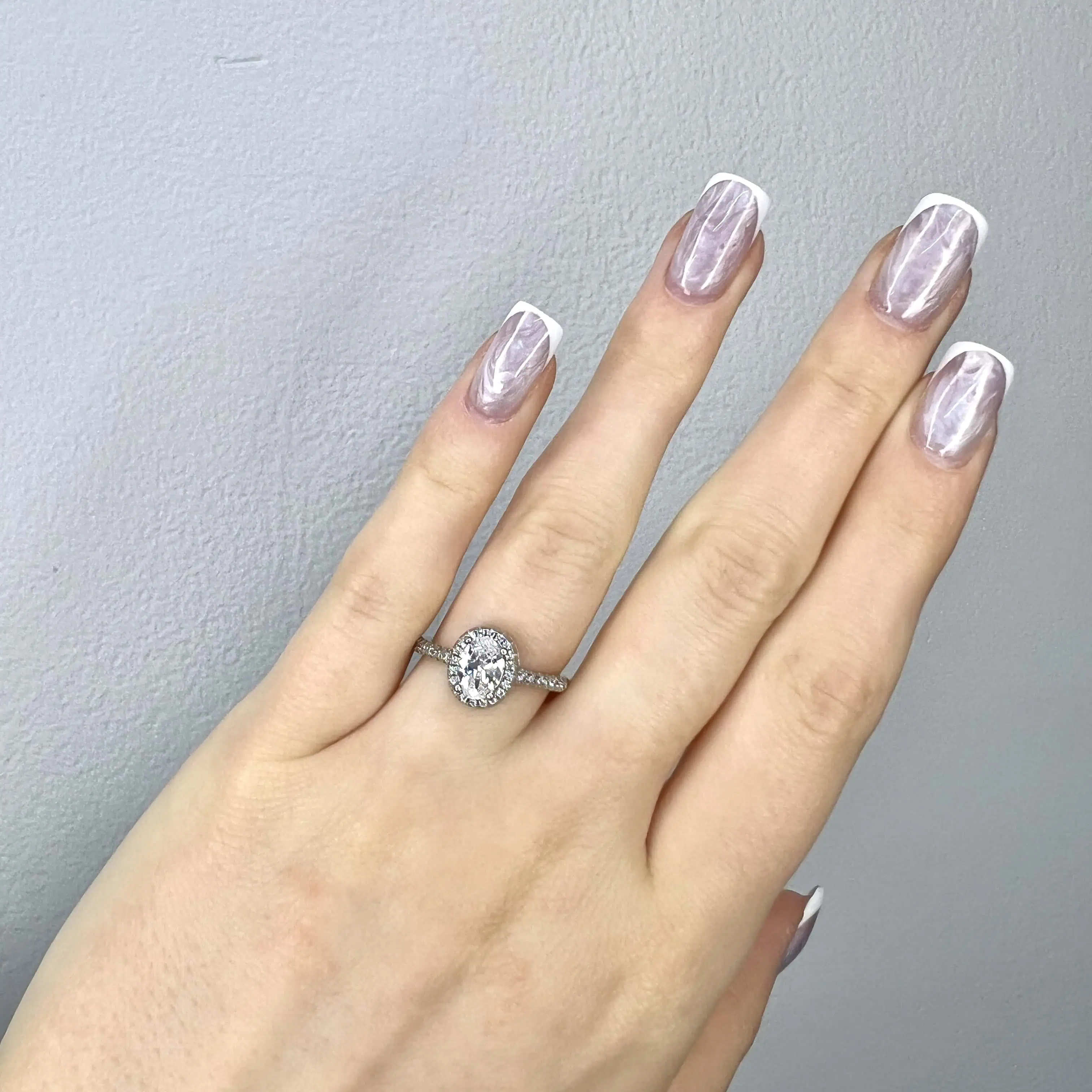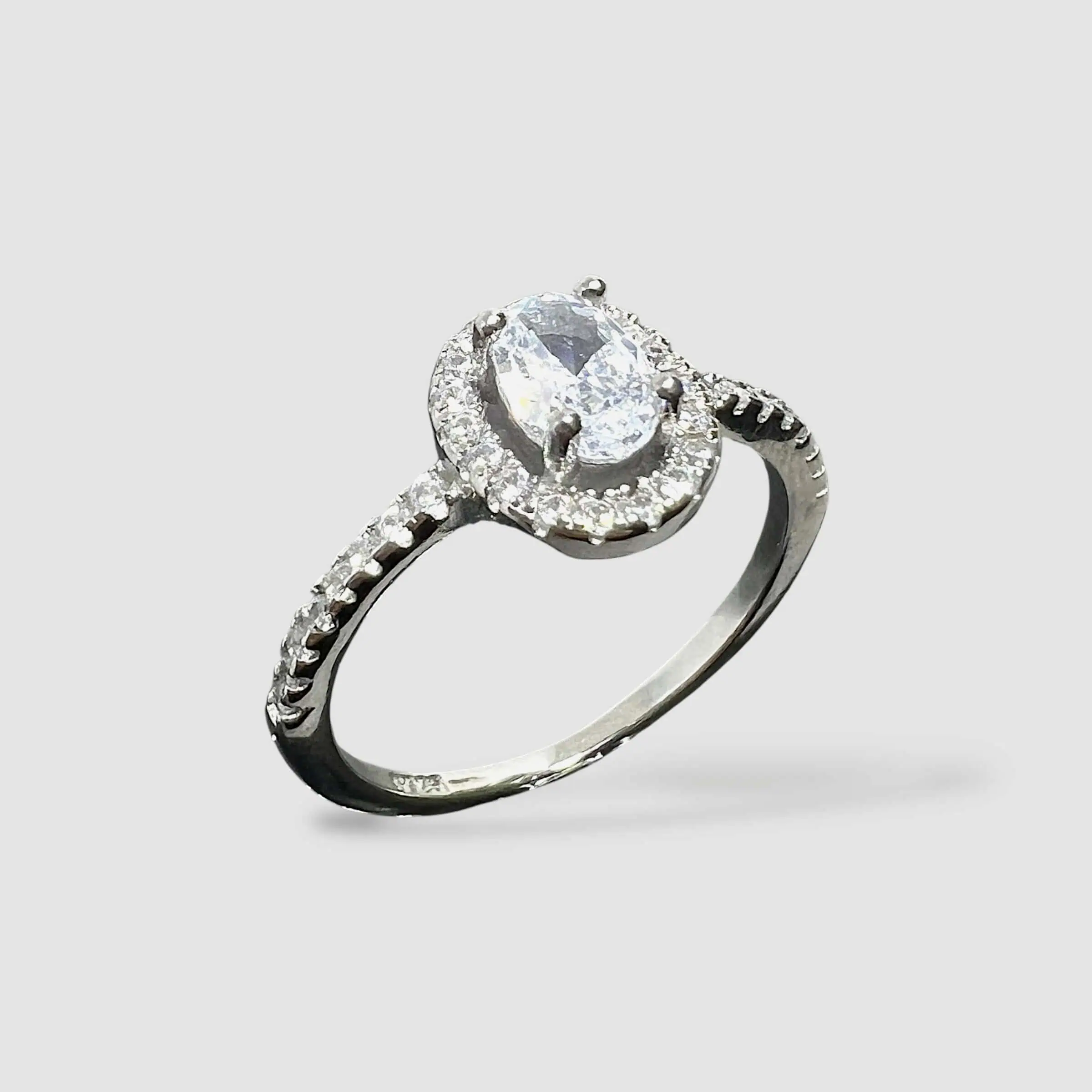 Вишукана срібна каблучка 925 проби, виконана в класичному стилі «гало». Центральний камінь у формі овалу оточений делікатним ореолом із дрібних цирконів, а тонка шинка, також інкрустована камінням, підкреслює витонченість жіночої руки.